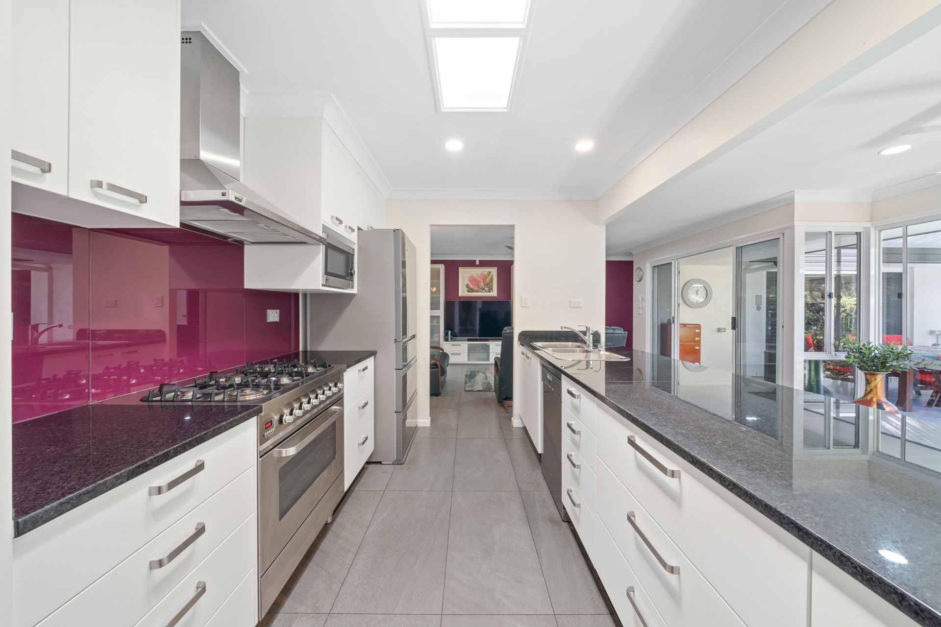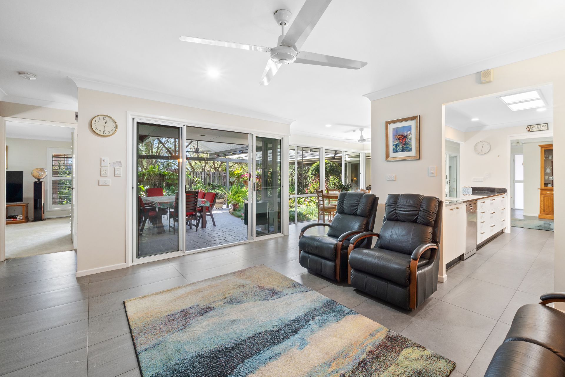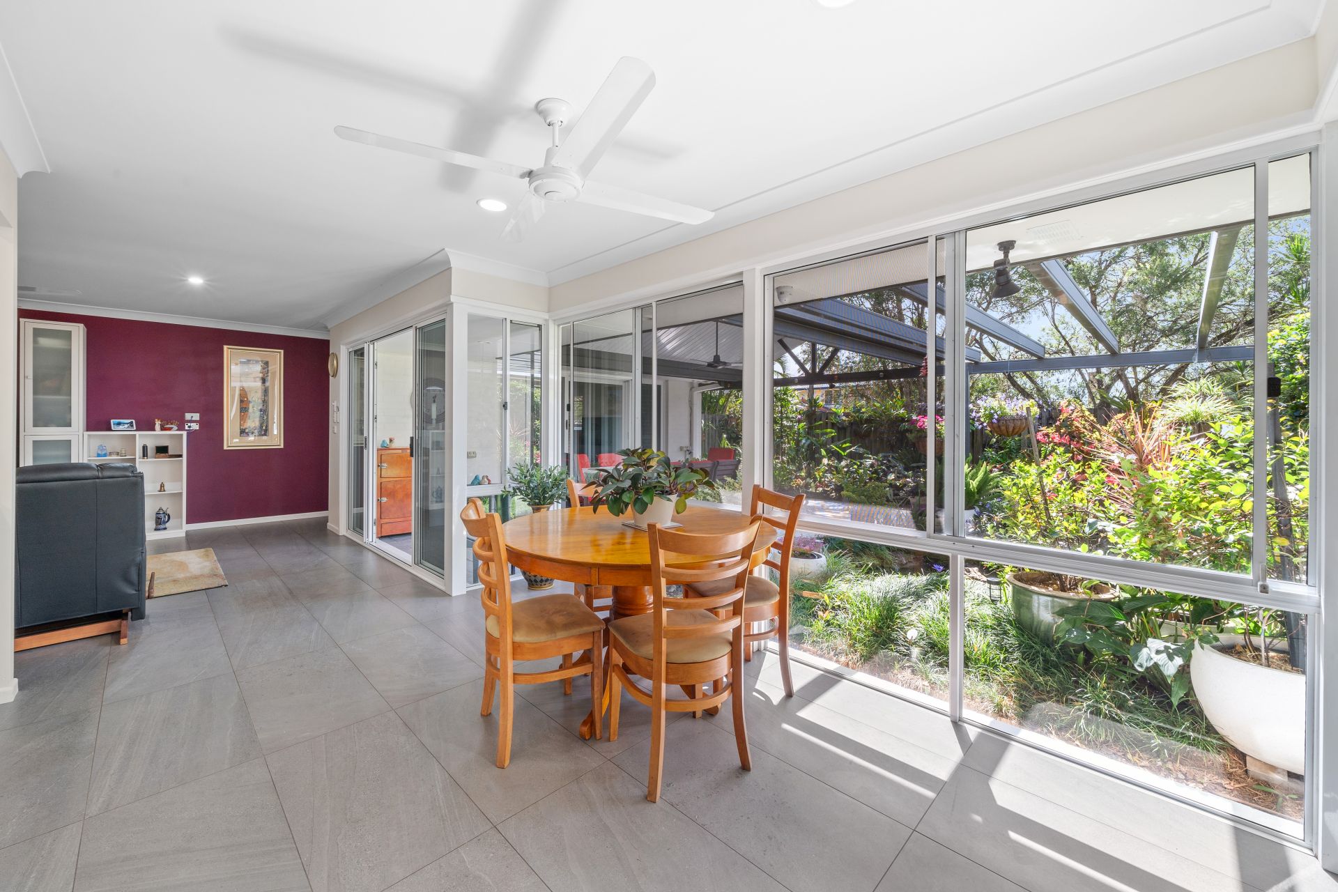 > The family room flows effortlessly to the kitchen/meals and out to the outdoor entertaining area. Featuring ceiling fans, tiled flooring, standard lighting, custom stone topped cabinetry, floor to ceiling windows as well as large glass sliding doors to access the outdoor entertaining area.