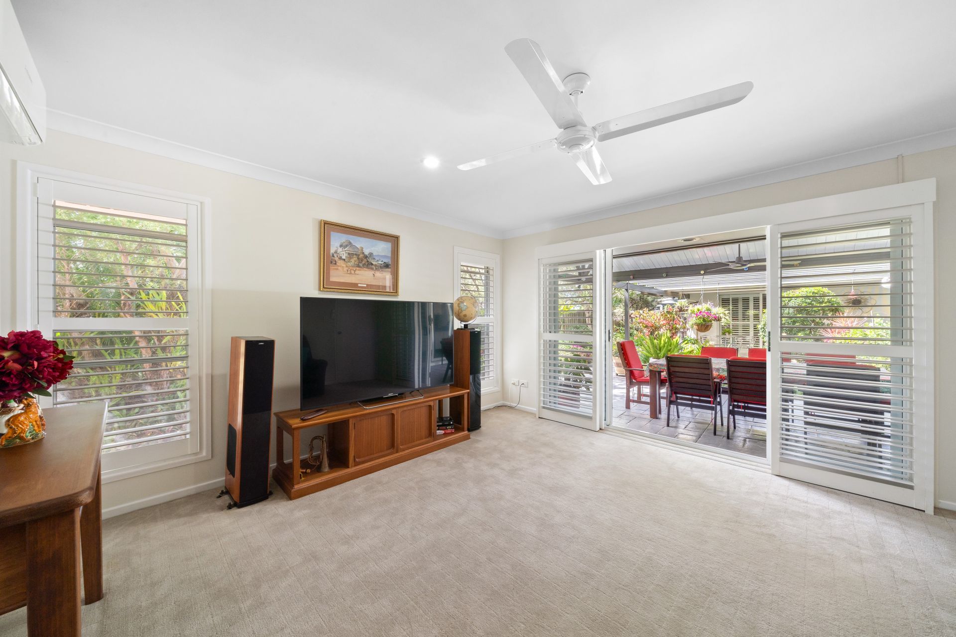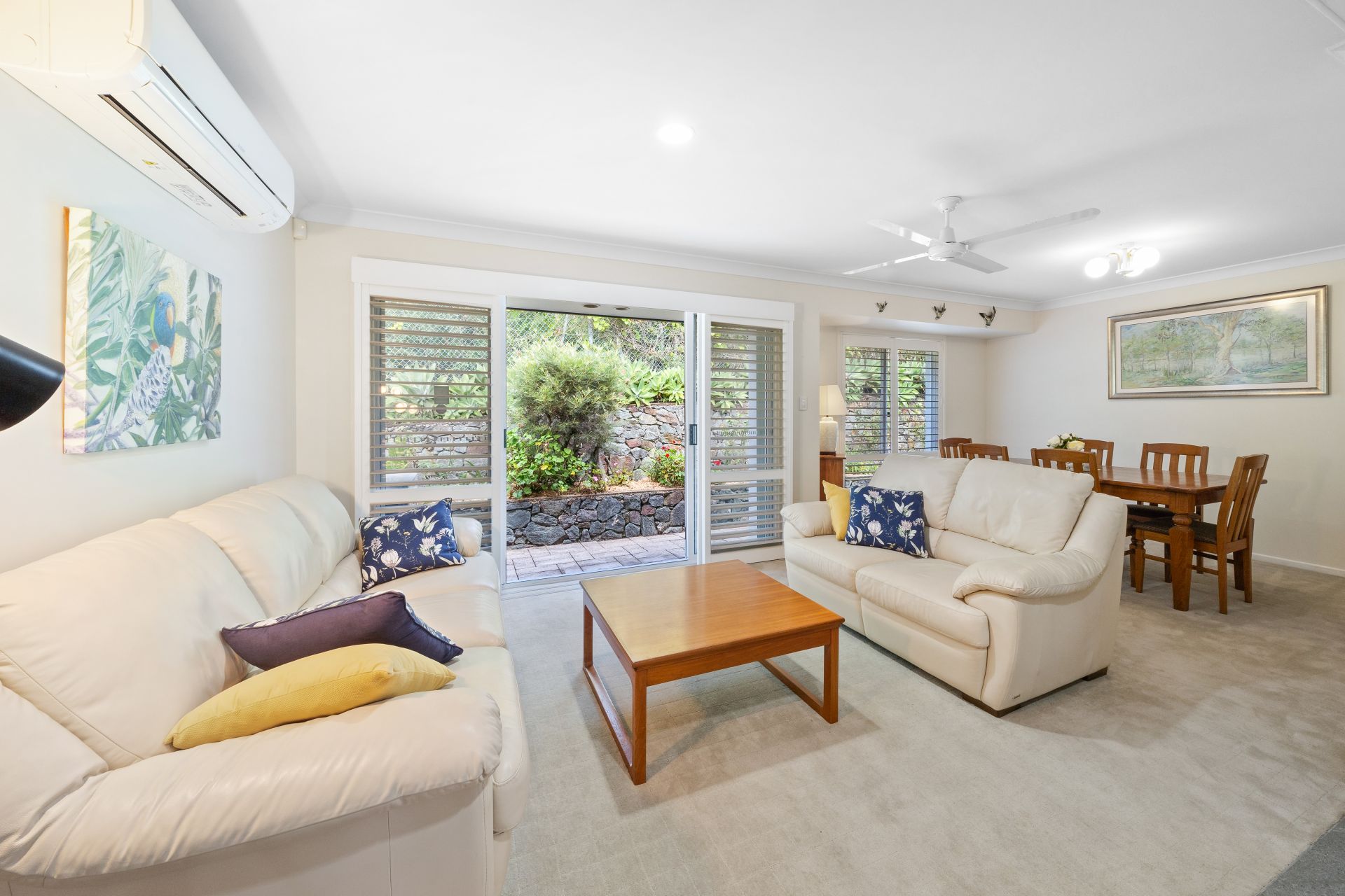 > The open plan living/dining areas located at the heart of the property features large sliding windows allowing lots of natural light into the room featuring plantation shutters, split-system air-conditioning, carpet flooring, standard lighting, security mesh, and large glass sliding doors to access the yard.