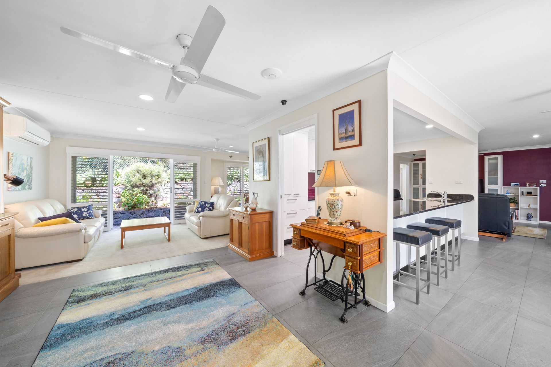 > The master enjoys split-system air-conditioning, carpet flooring, enormous walk-in-robe, skylight, ceiling fan, standard lighting, ensuite, plantation shutters, sash windows, security mesh and sliding doors giving you access to the central botanical courtyard.