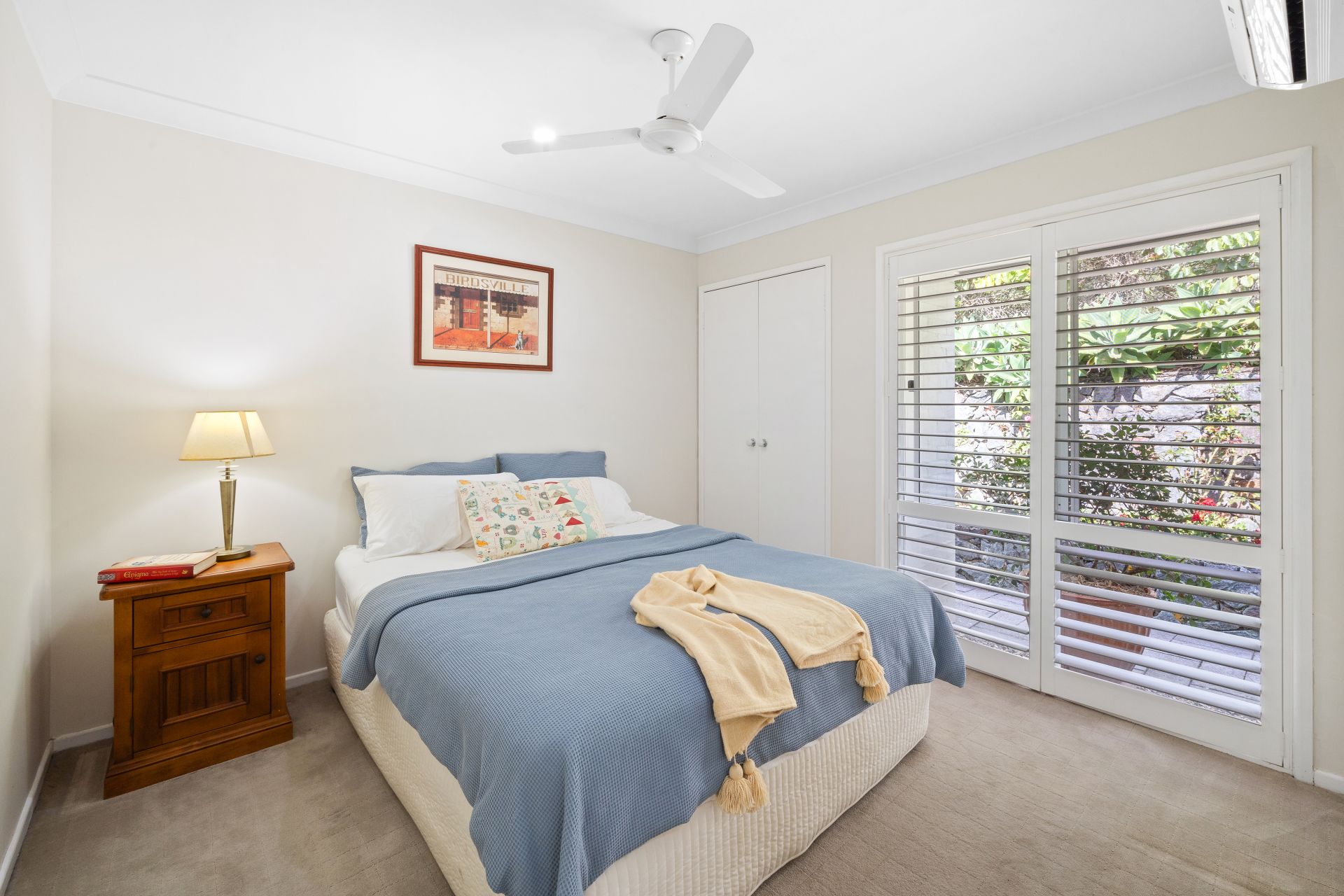 > Bedroom 2 features split-system air-conditioning, carpet flooring, ceiling fan, standard lighting, plantation shutters, sash windows, security mesh and sliding doors giving you access to the central botanical courtyard.
