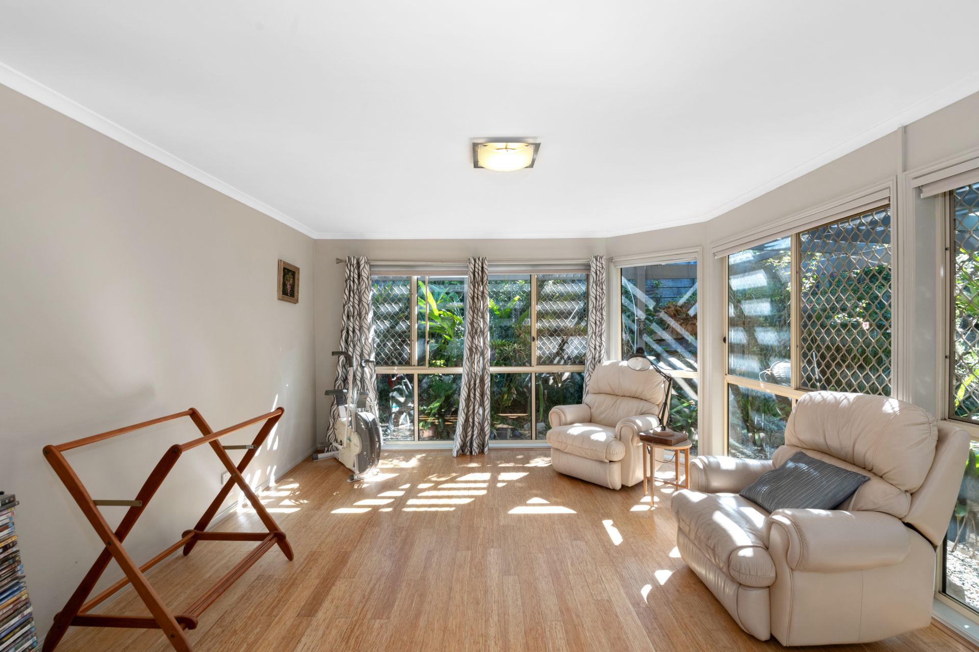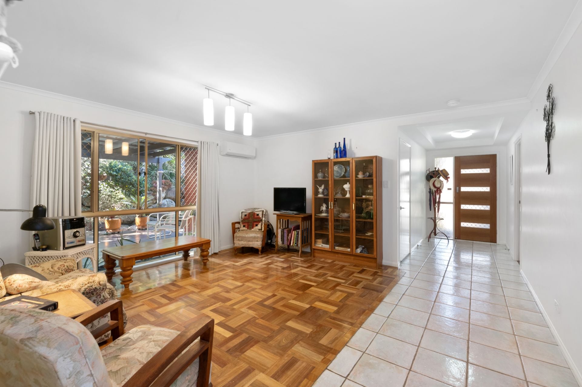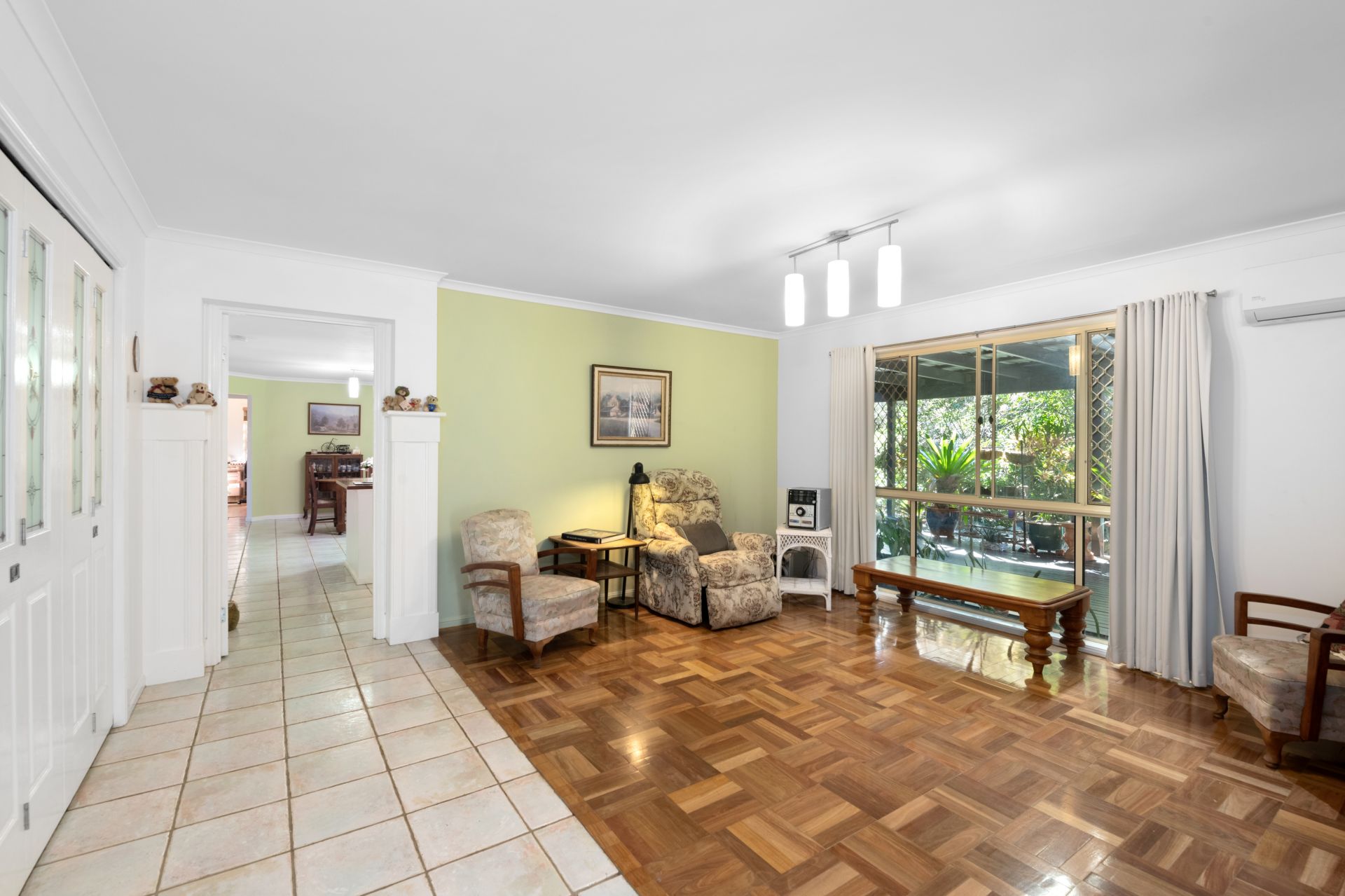 > Formal lounge looks out over the covered entertaining deck and features parquetry flooring, split system air-conditioning, and curtains.