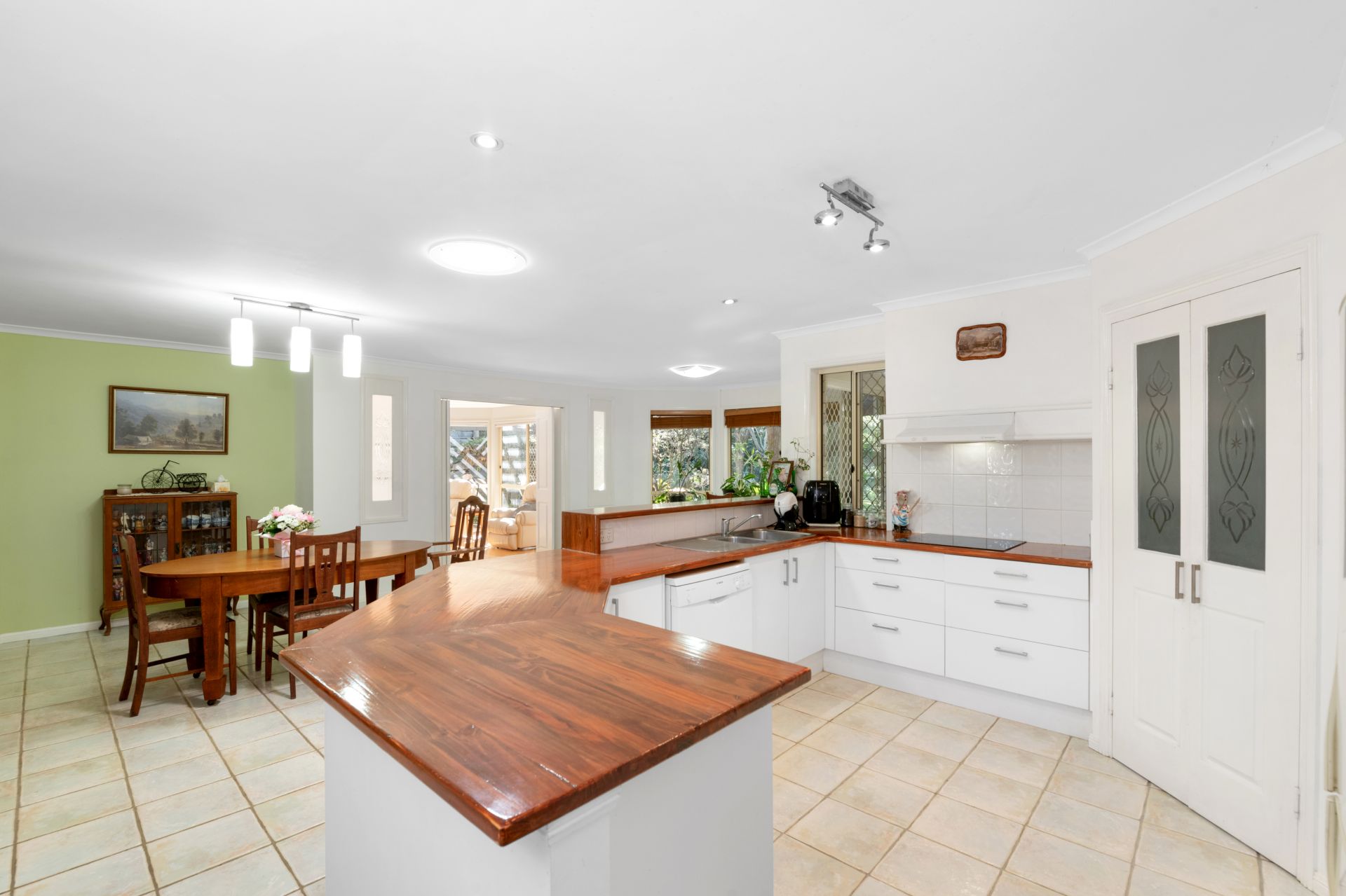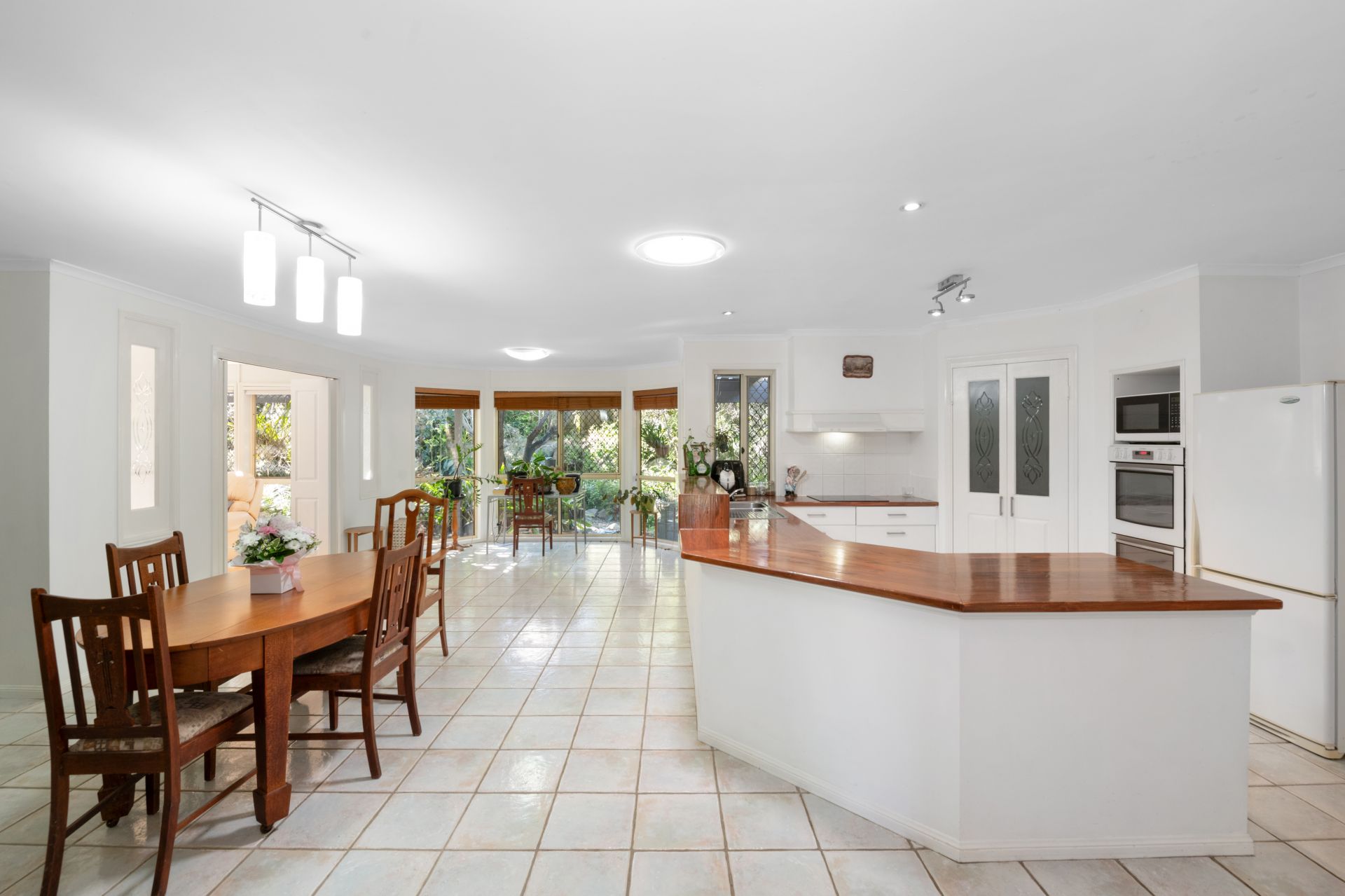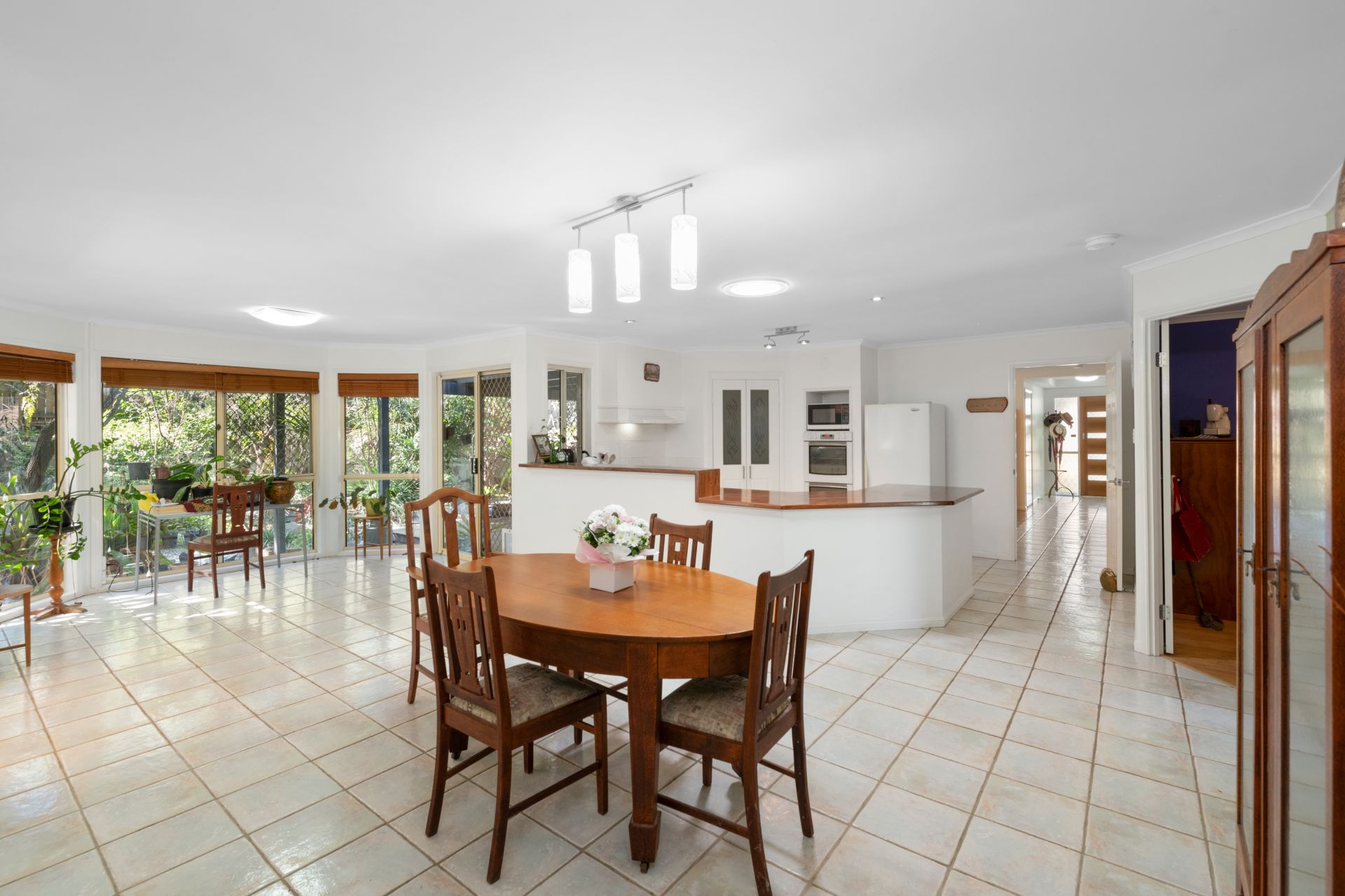 > Living room and meals area enjoy a nature-filled view out through a large, wall-length bay window and features tiled flooring, blinds and access to the covered outdoor entertaining area.