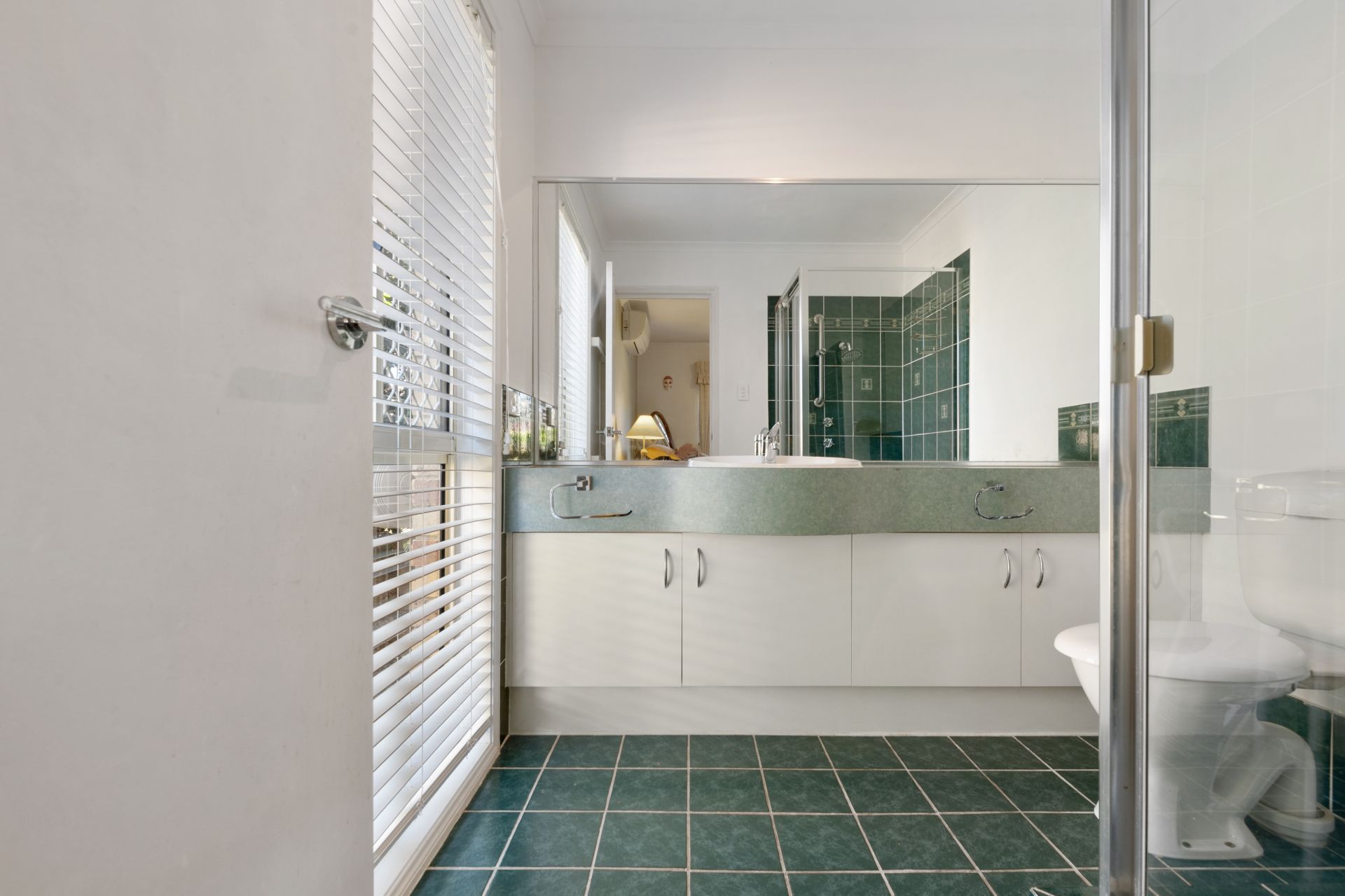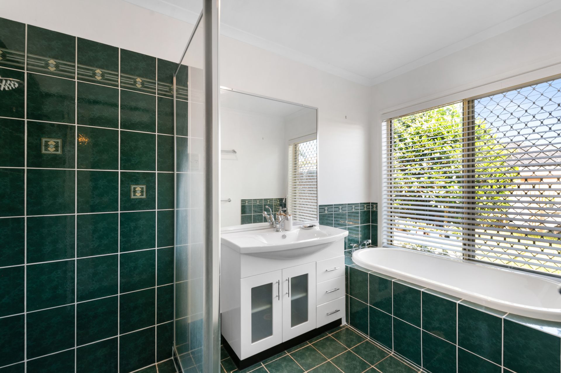 > Bathroom one is the home's main bathroom featuring tiled flooring, shower, separate deep soaker bath, single vanity, blinds and separate toilet.