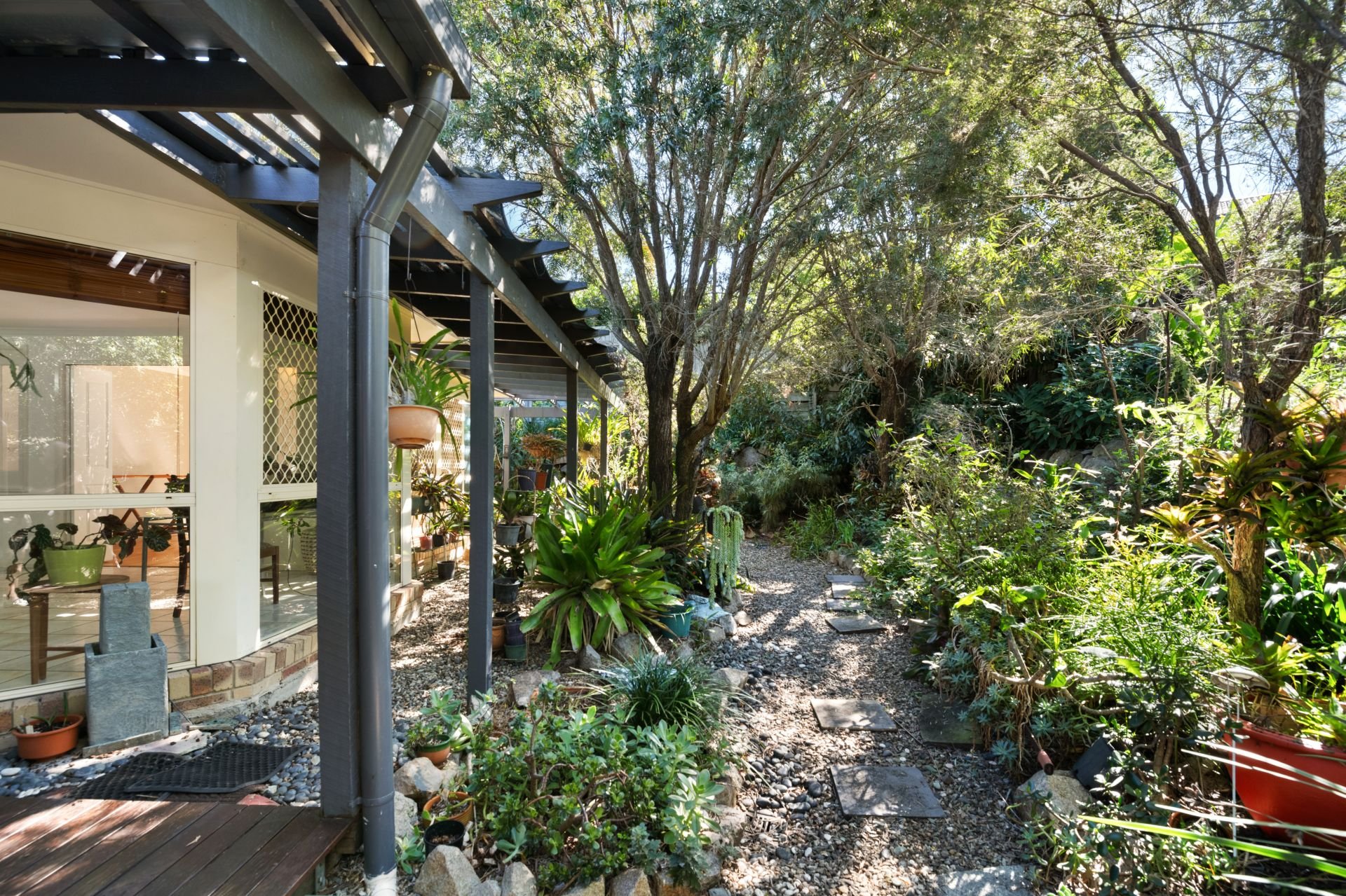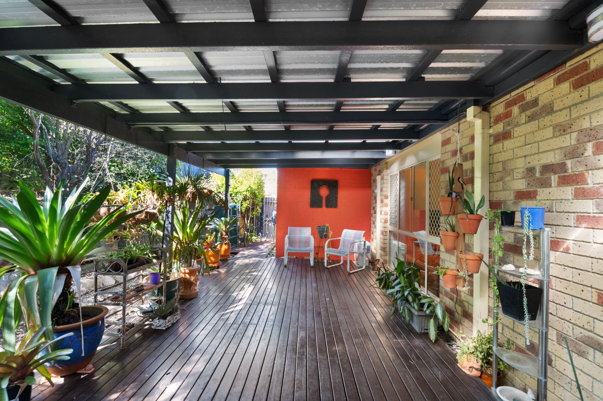 > Covered outdoor entertaining deck is both private and peaceful, surrounded by nature. This great outdoor space features timber decking, lighting and outdoor power points.