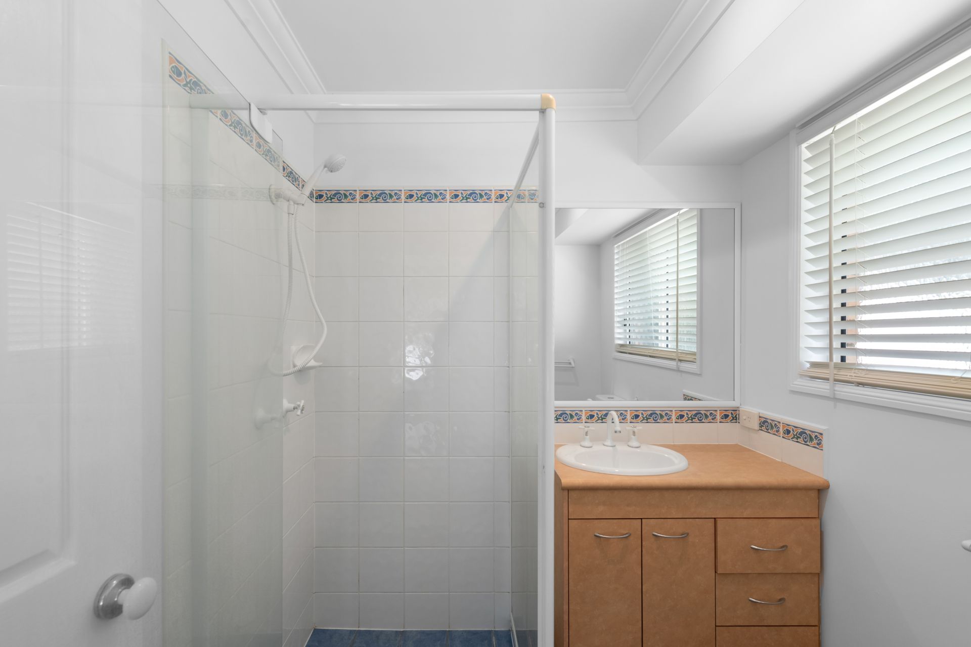 > Bathroom two is the ensuite to the Master bedroom and features tiled flooring, shower, single vanity, toilet and blinds.