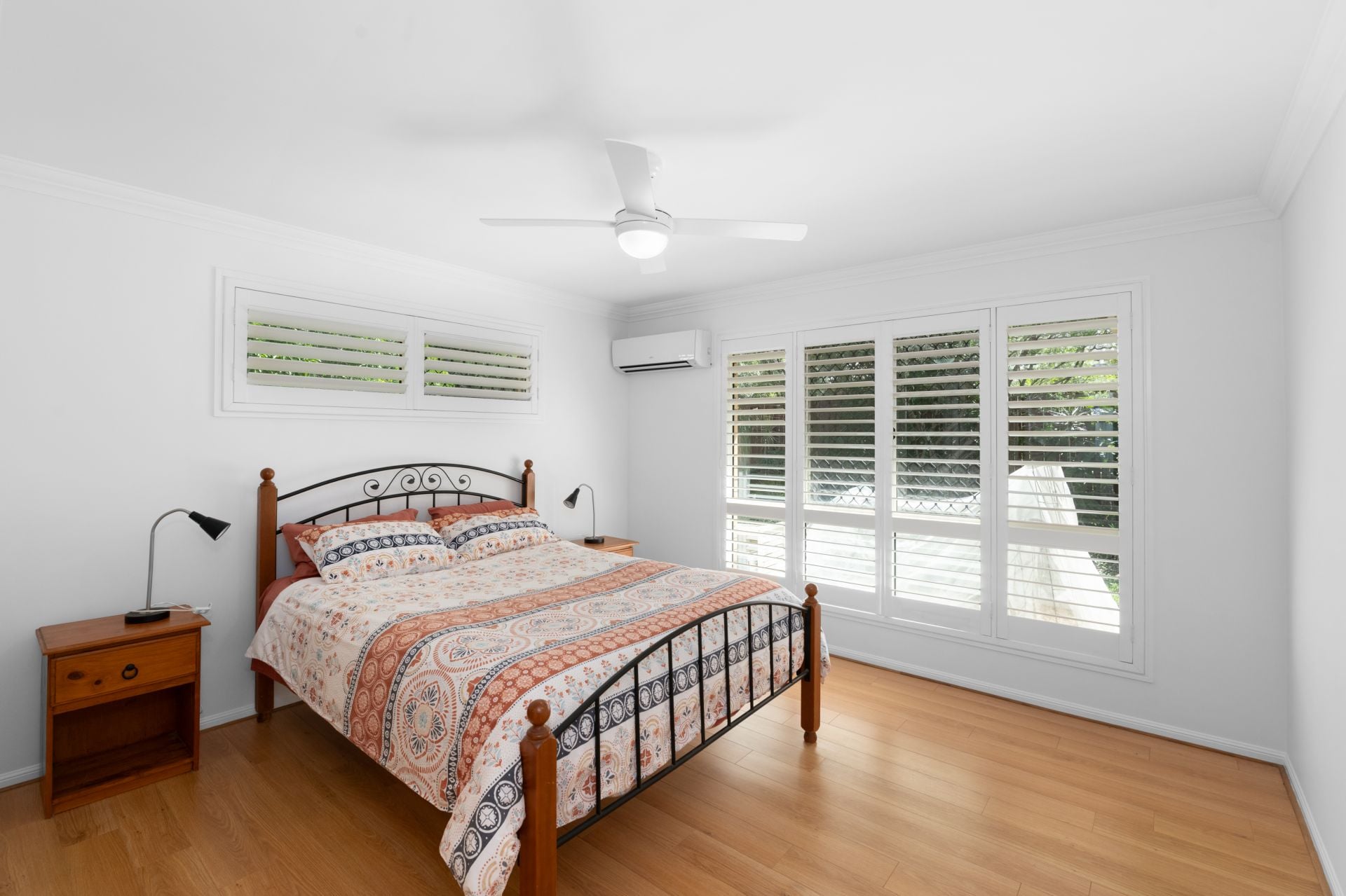 > Bedroom one is the home's Master bedroom featuring timber flooring, ensuite, split system air-conditioning, ceiling fan, walk-in-robe and plantation shutters.