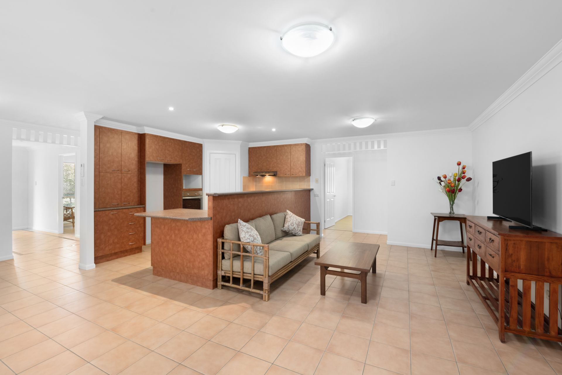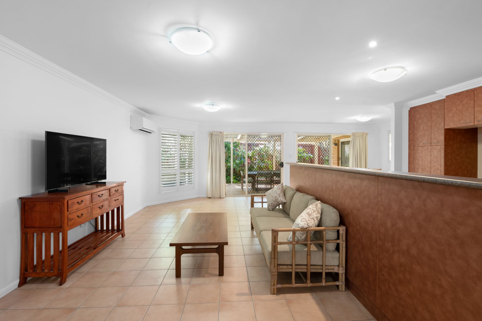 > Living room and meals area shares a large open space with the home's kitchen and features tiled flooring, split system air-conditioning, curtains and access to the covered outdoor entertaining area.