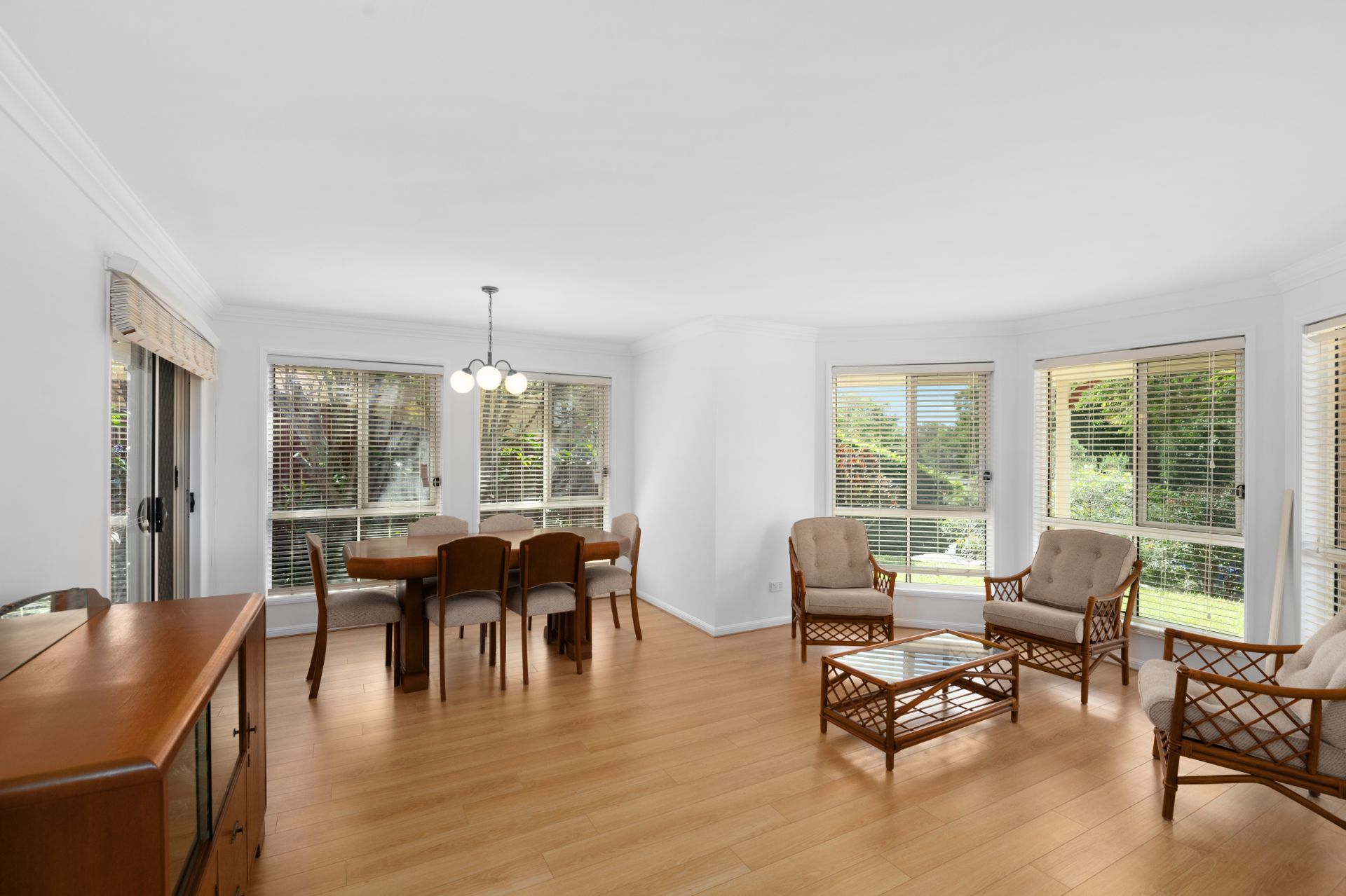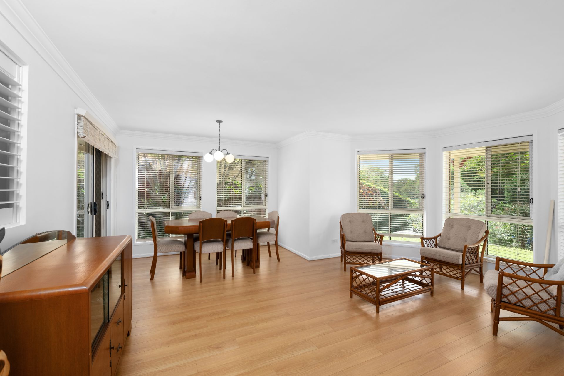 > Formal lounge enjoys a great view of the park through a large bay window and features timber flooring, security-mesh screens, blinds and access to the covered outdoor entertaining area.