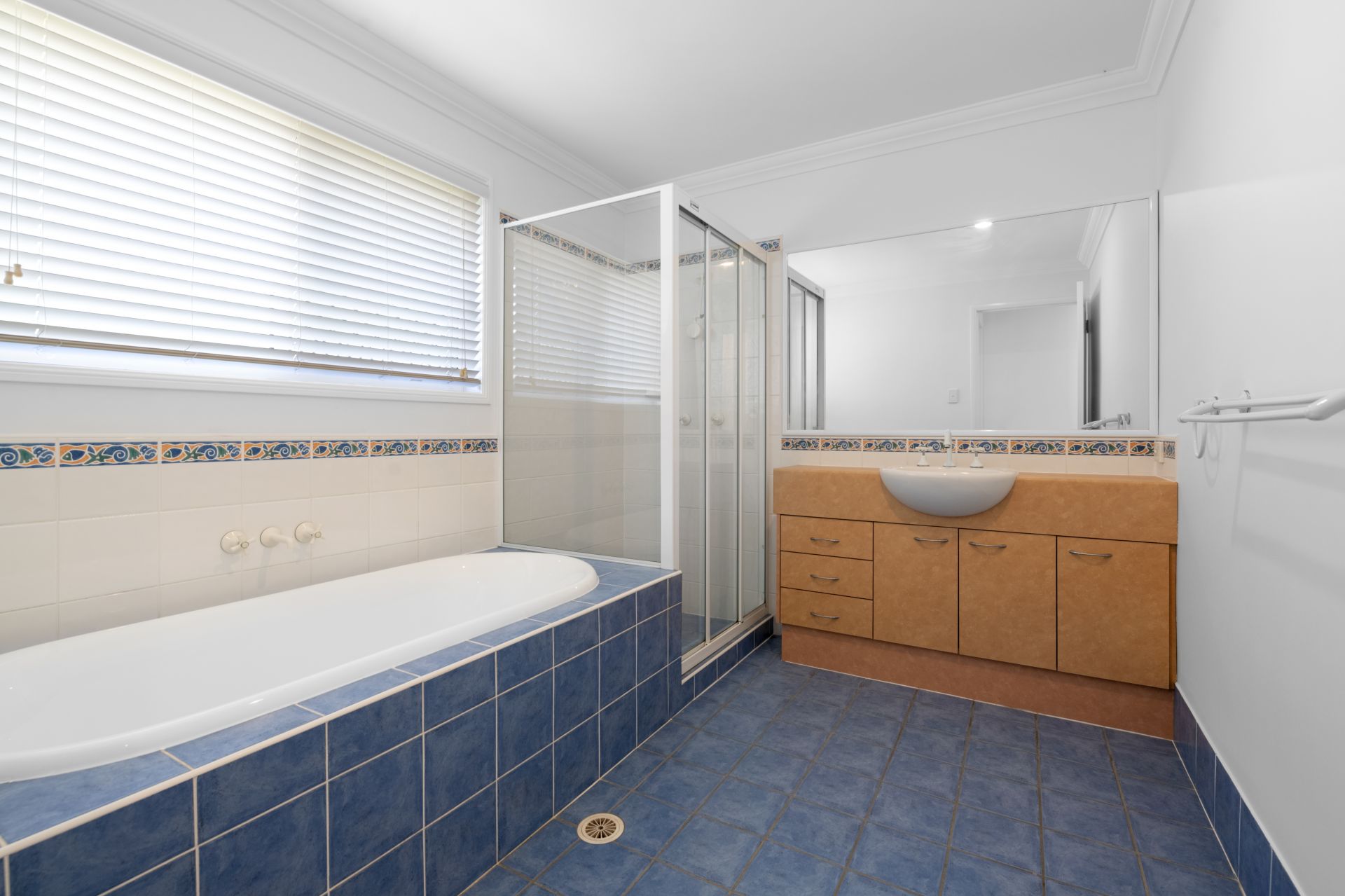 > Bathroom one is the home's spacious main bathroom featuring tiled flooring, shower, separate deep soaker bath, single vanity, separate toilet and blinds.