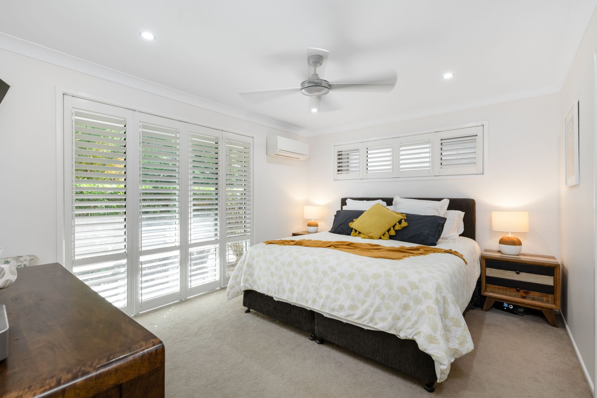 > Bedroom one is the home's spacious Master bedroom featuring carpeted flooring, ensuite, split system air-conditioning, ceiling fan, walk-in-robe and plantation shutters.