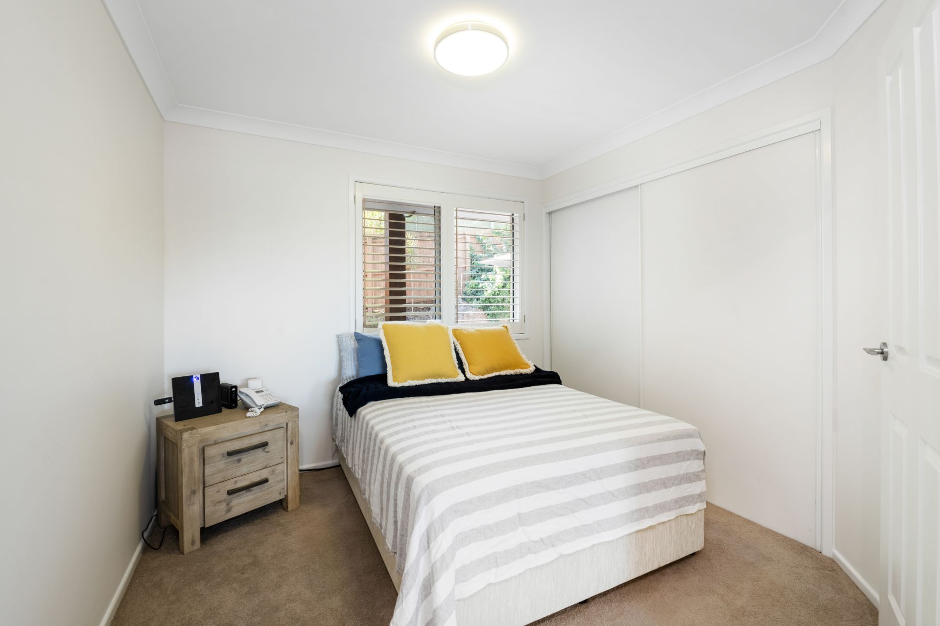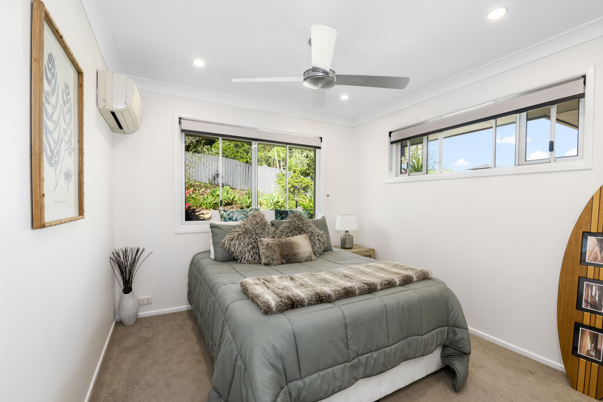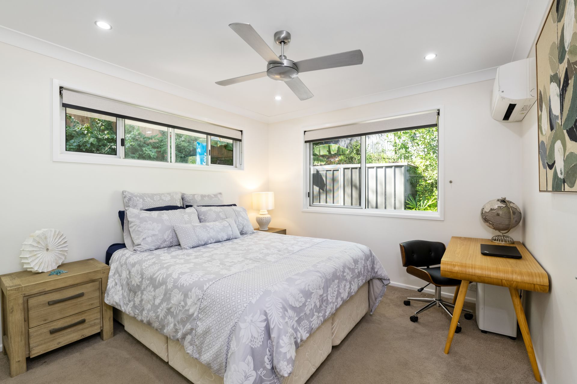 > Bedroom three features carpeted flooring, split system air-conditioning, ceiling fan, built-in-robe and roll-down blinds.