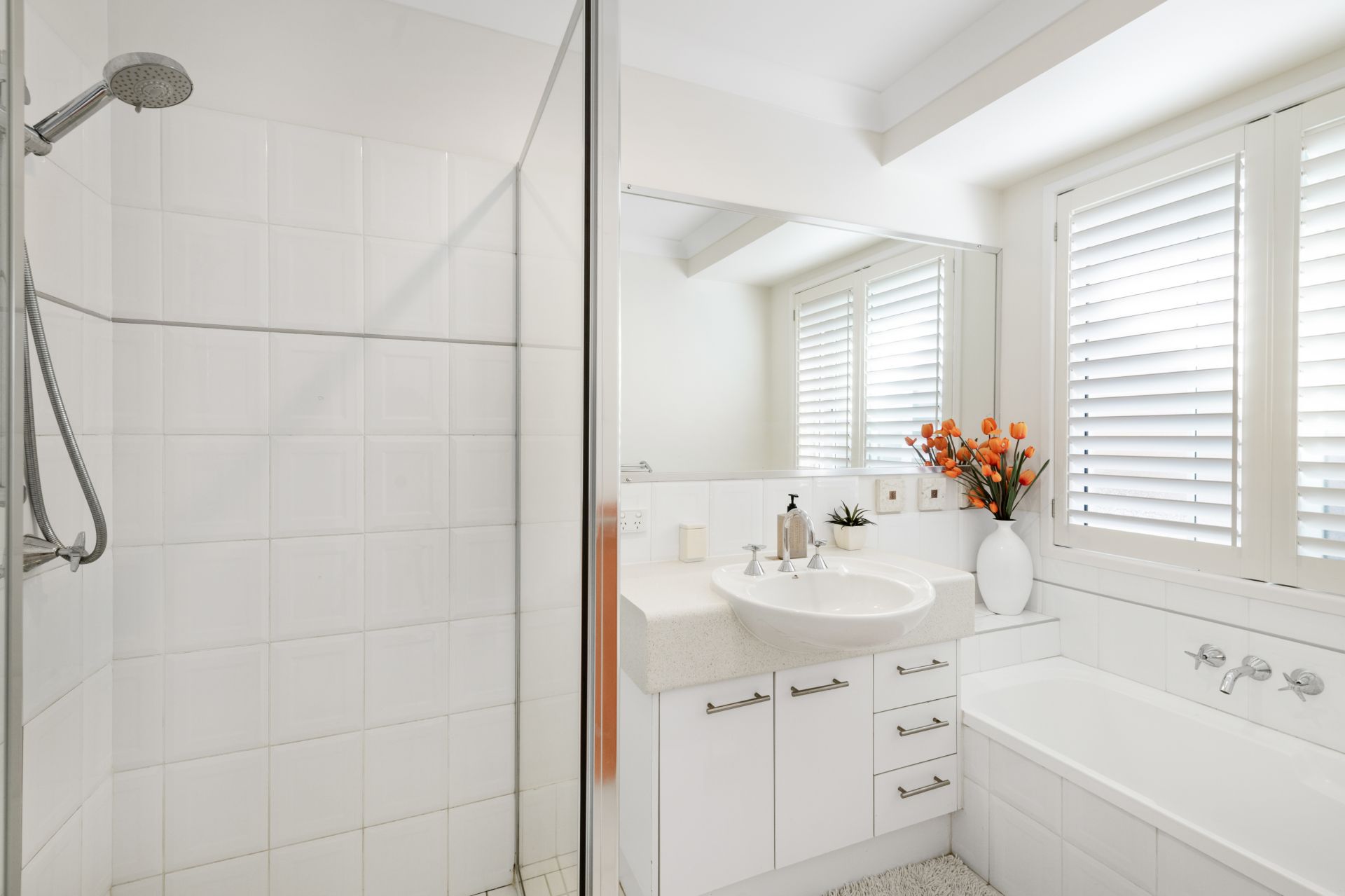 > Bathroom one is the home's main bathroom featuring tiled flooring, shower, separate bath, single vanity, plantation shutters and separate toilet.