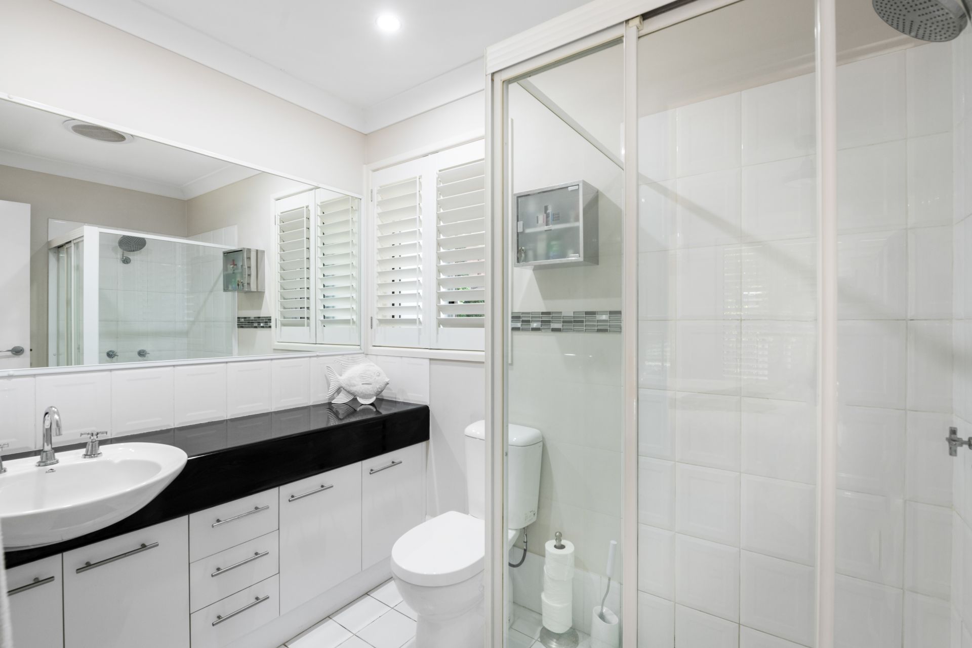 > Bathroom two is the ensuite to the Master bedroom and features tiled flooring, shower, single vanity, plantation shutters and toilet.