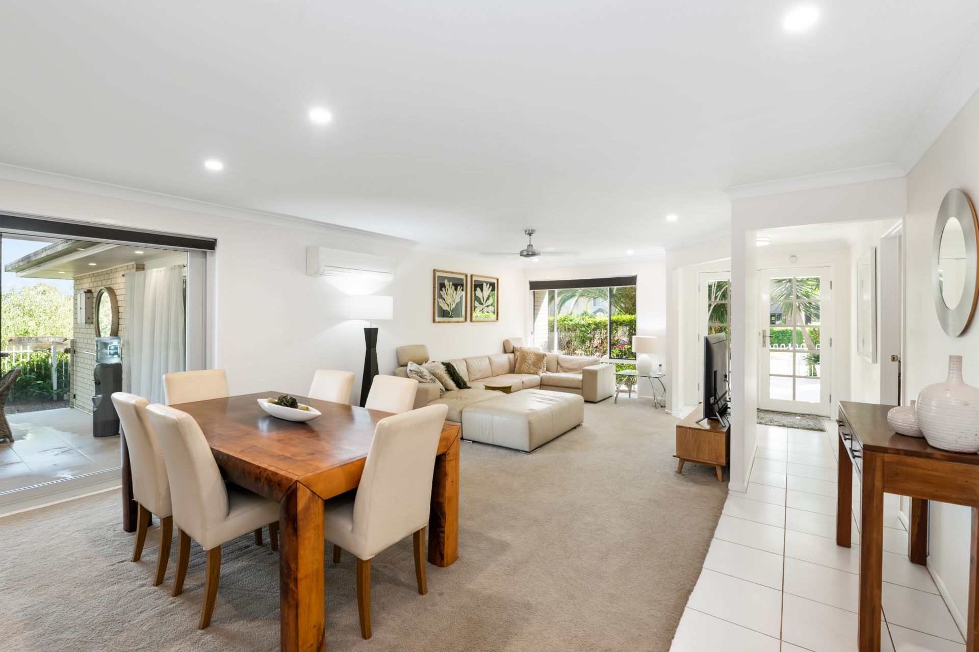 > Formal lounge and Dining share a large open space at the front of the home and features carpeted flooring, split system air-conditioning, ceiling fan, roll-down blinds and a large window looking out to the covered outdoor entertaining area, filling the room with natural light.