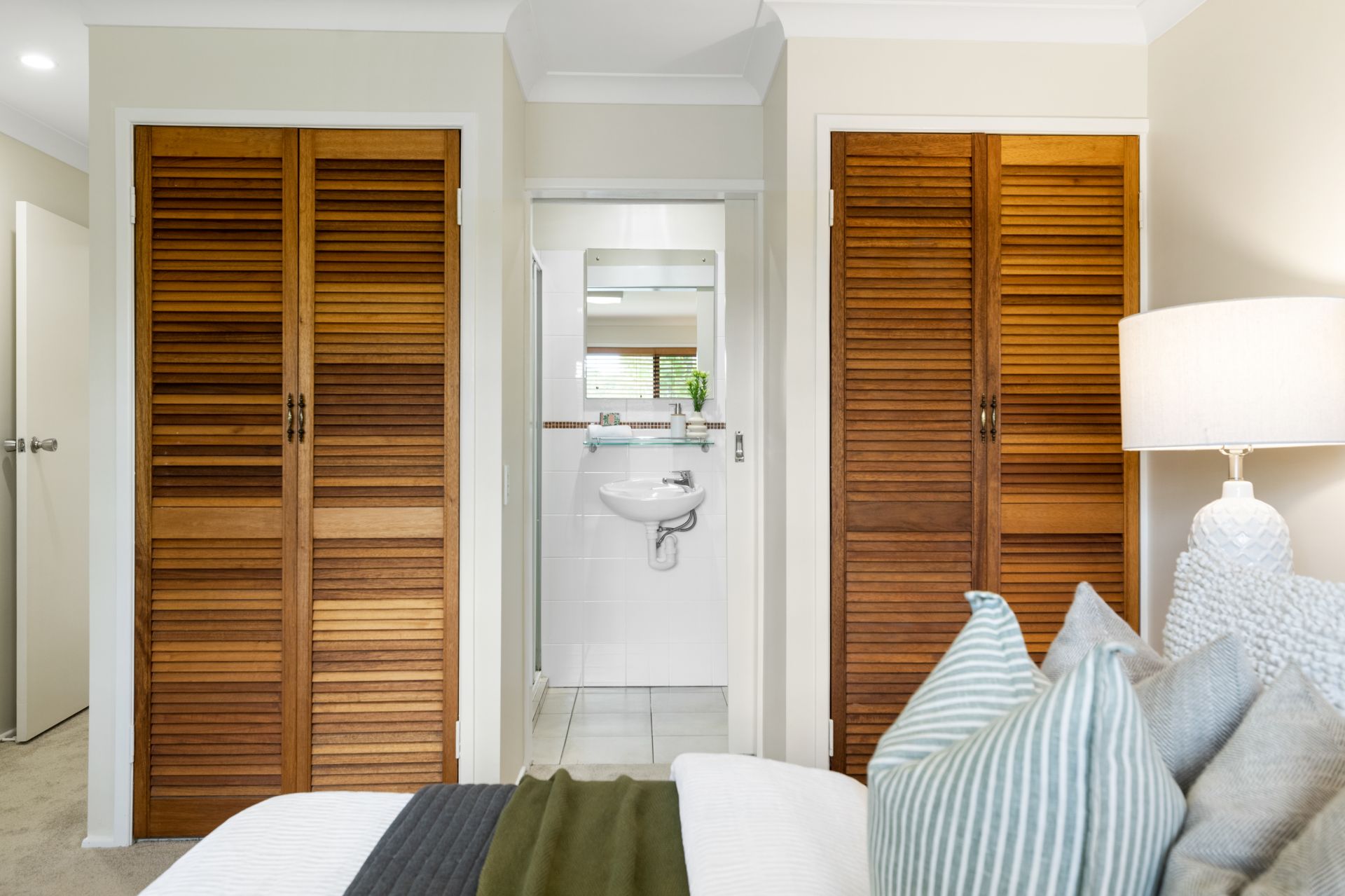 > Bedroom one is the home's spacious Master bedroom featuring freshly carpeted flooring, ensuite, split system air-conditioning, built-in-robe, curtains and security -mesh screens.