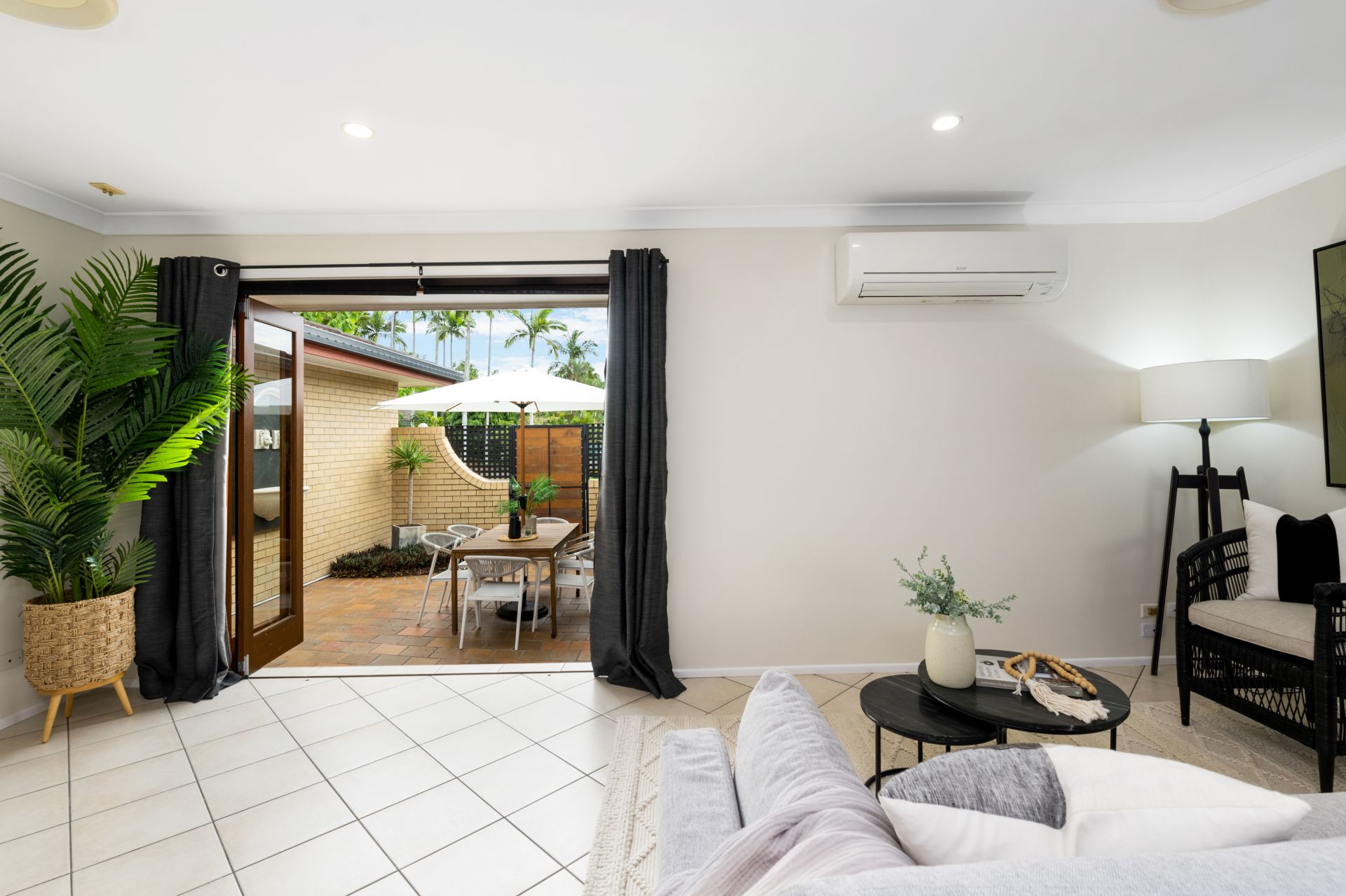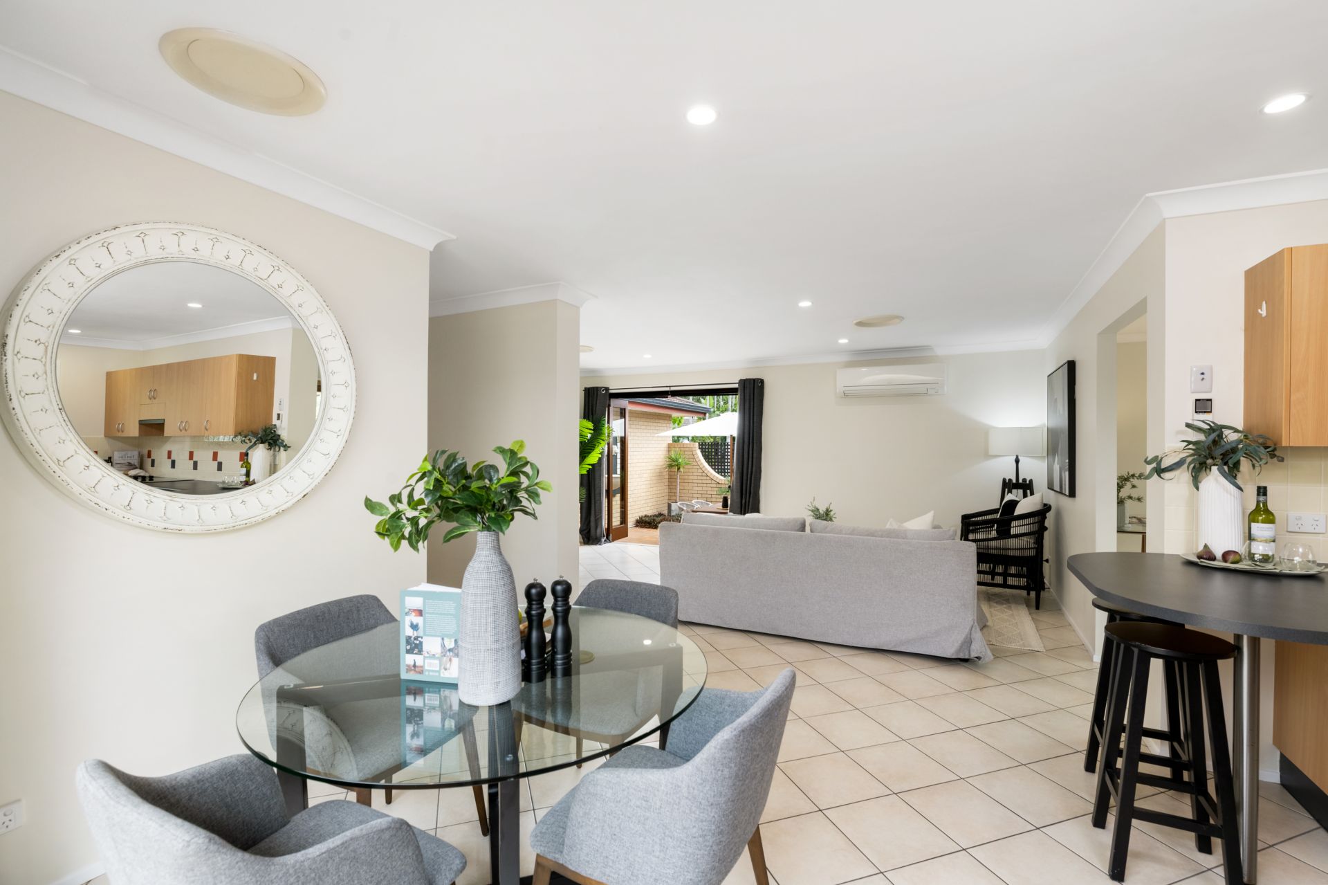 > The Living room and Dining area share a great open space and features tiled flooring, split system air-conditioning, roll-down shade blinds at both the front and rear doors and access to the courtyard and back deck via timber framed bi-fold doors.