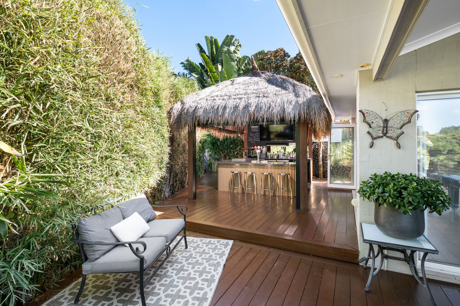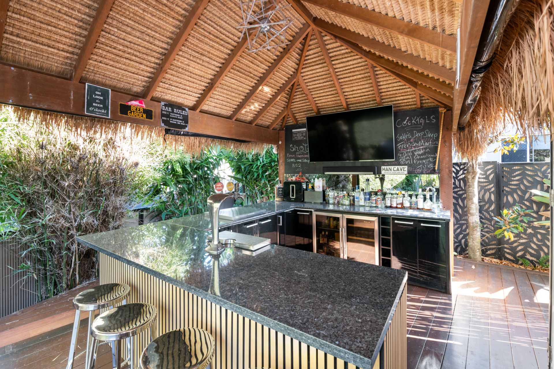 > Bali Hut Bar features granite benchtops with seating x 4, built-in BBQ, triple beer tap with kegerator fridge, single sink, bar fridge, abundance storage space and roll-down blinds to protect from the weather.