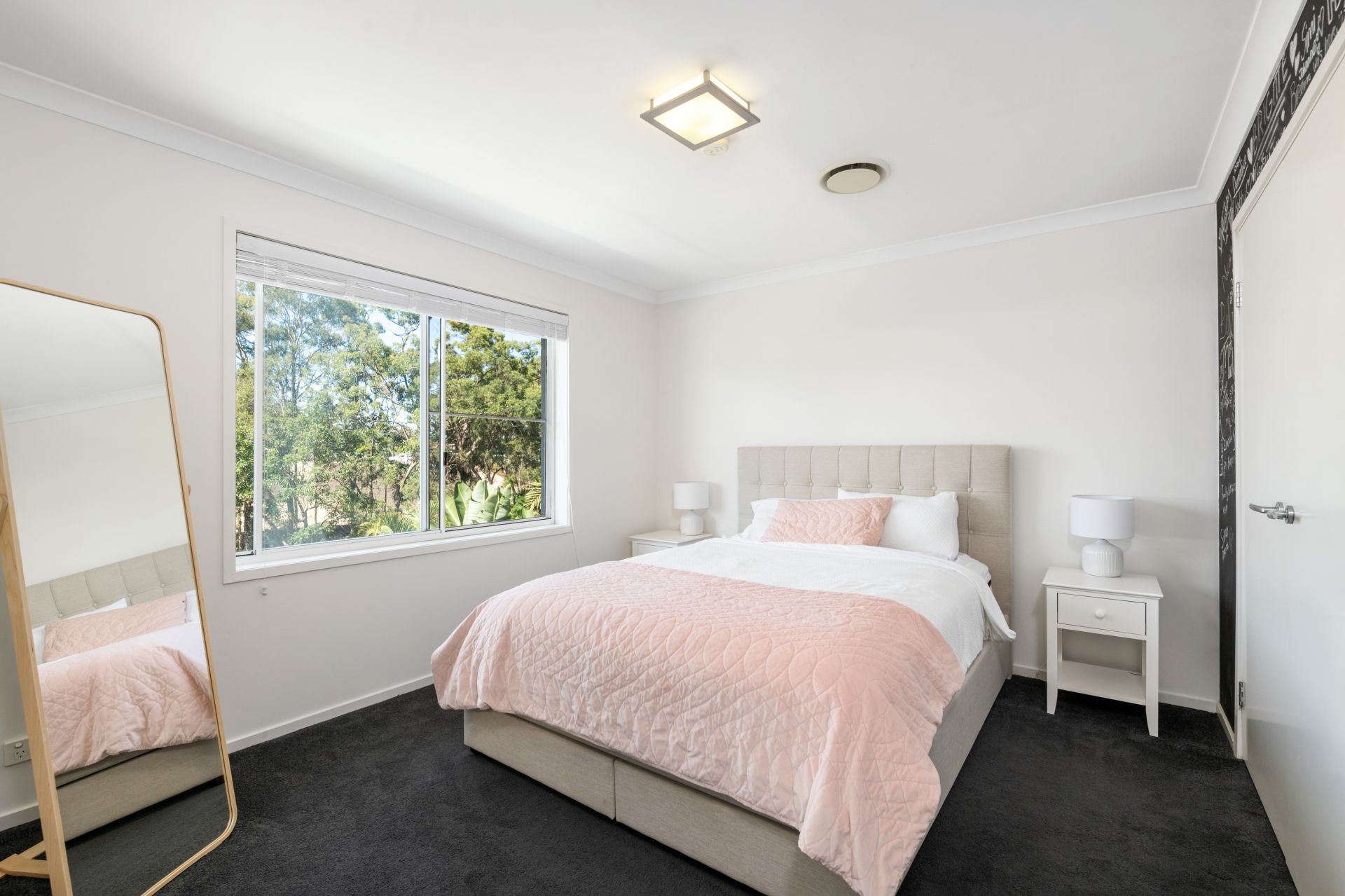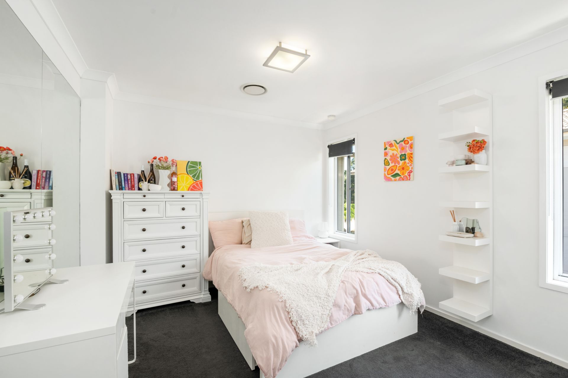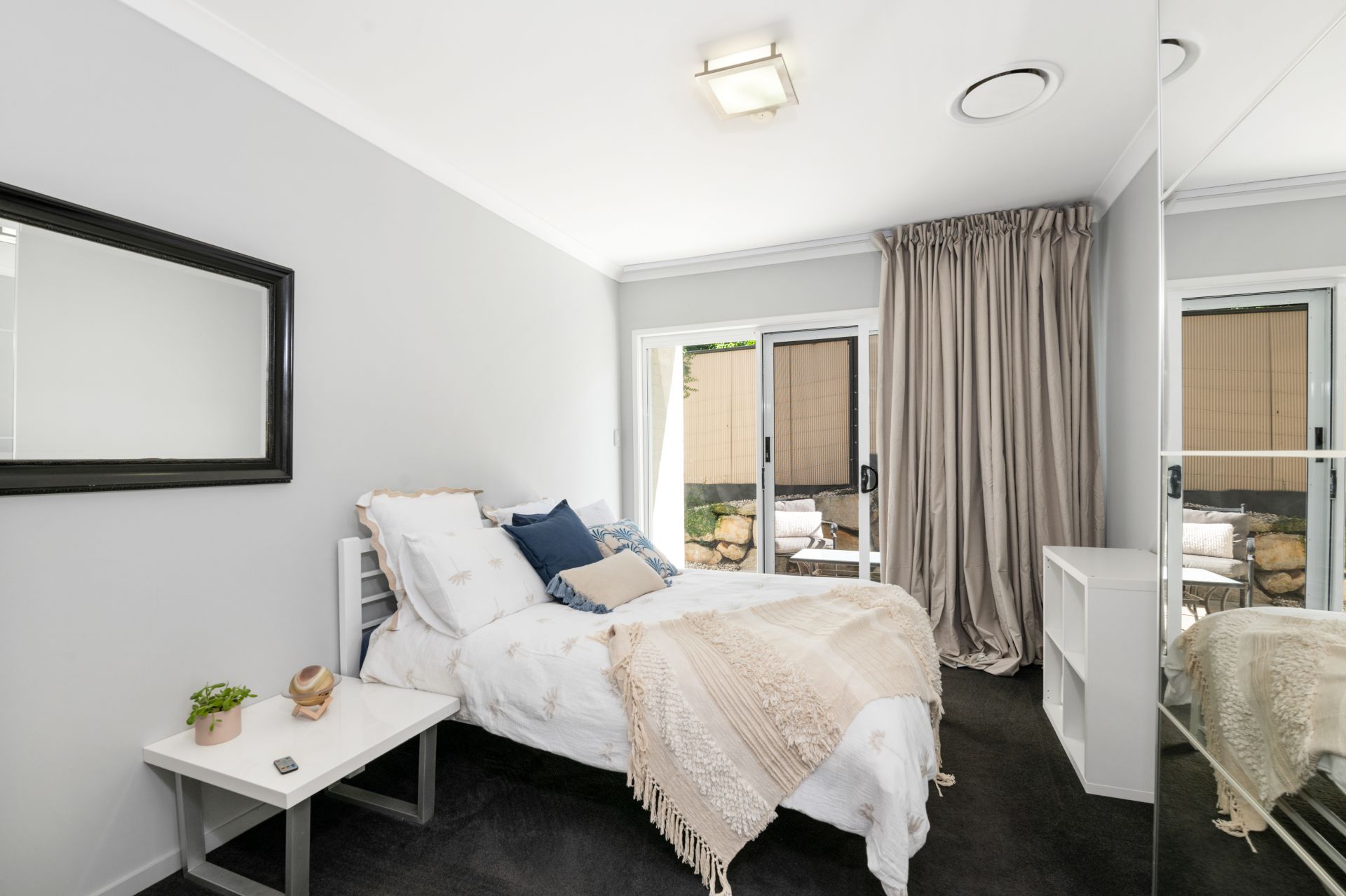 > Bedroom five is conveniently located on the ground floor and features carpeted flooring, curtains, security-mesh screen and access to the side yard and private paved sitting area.