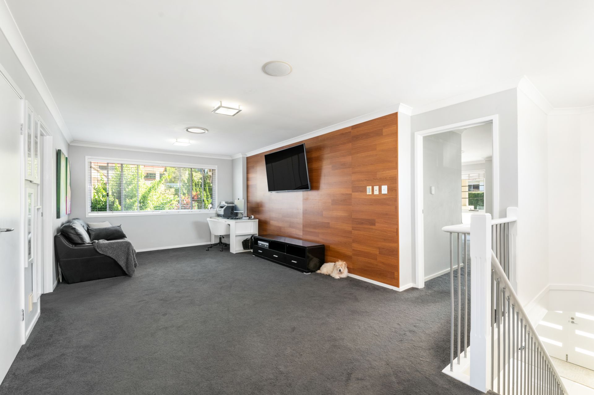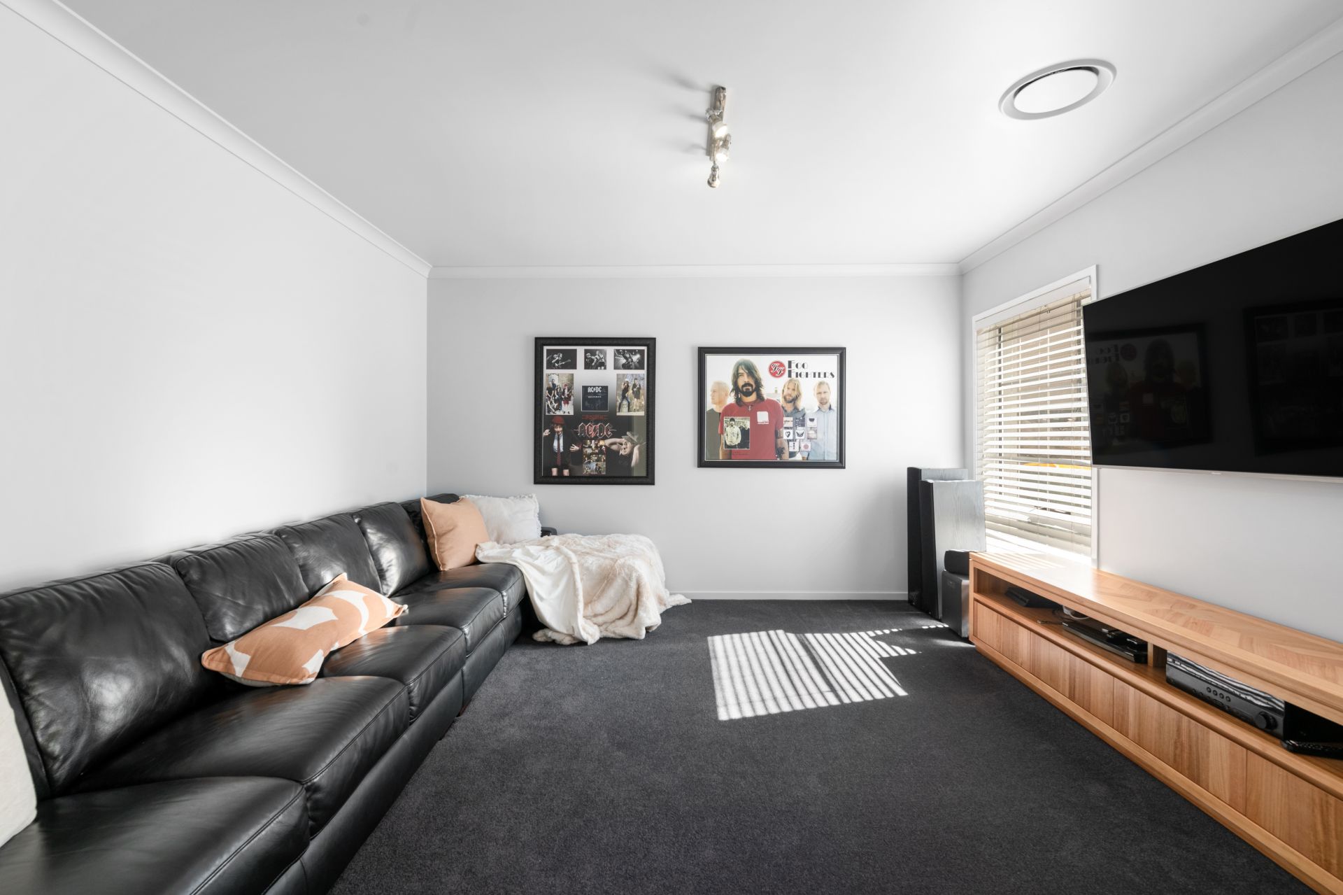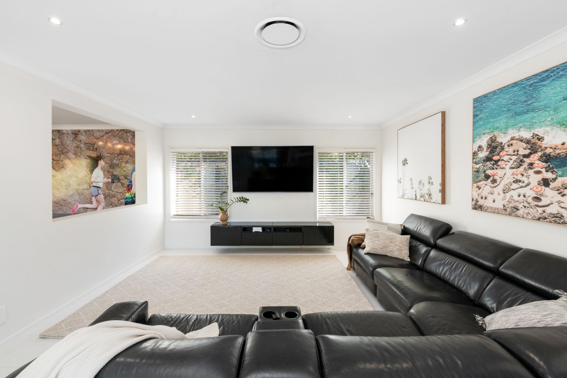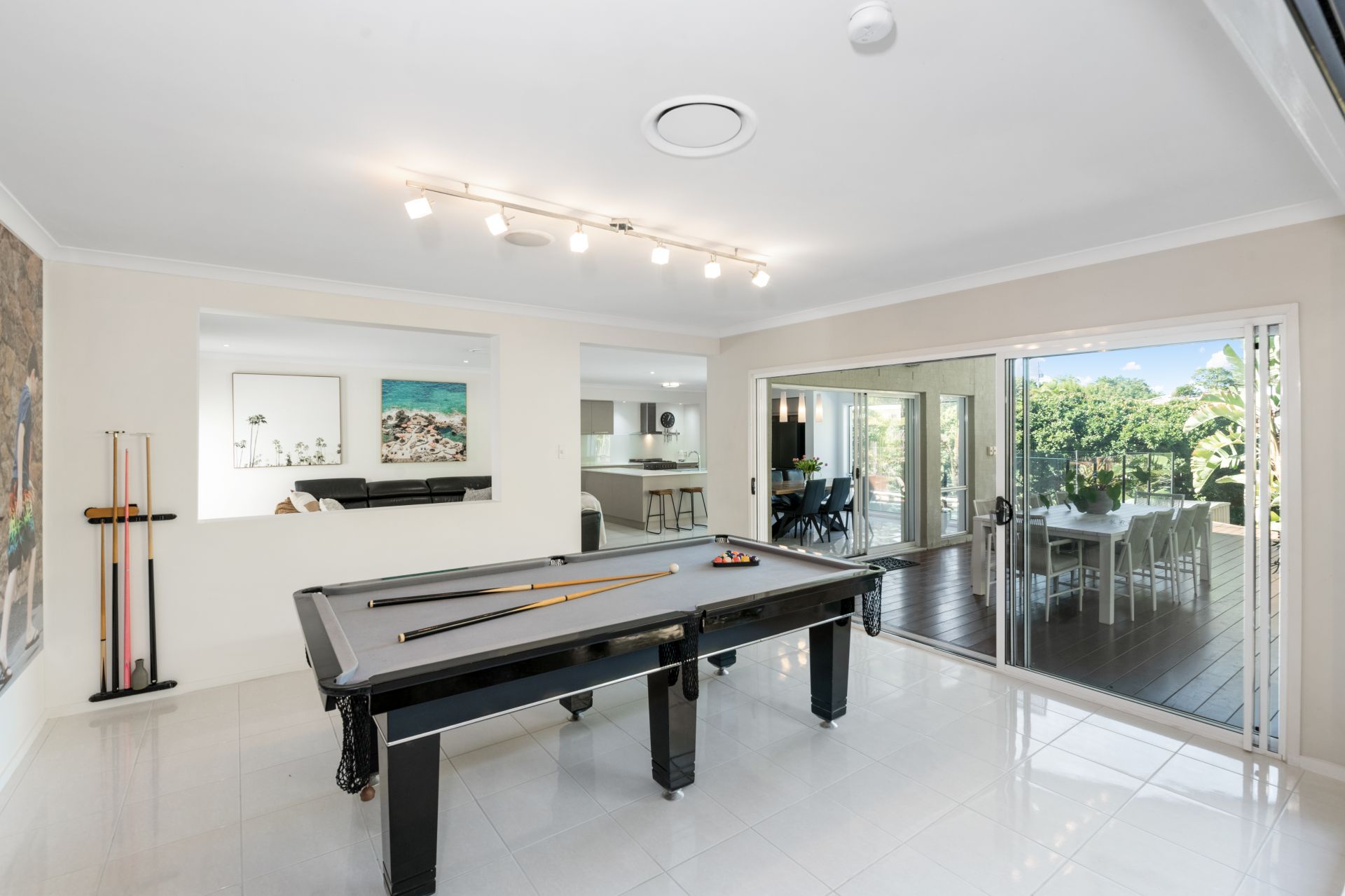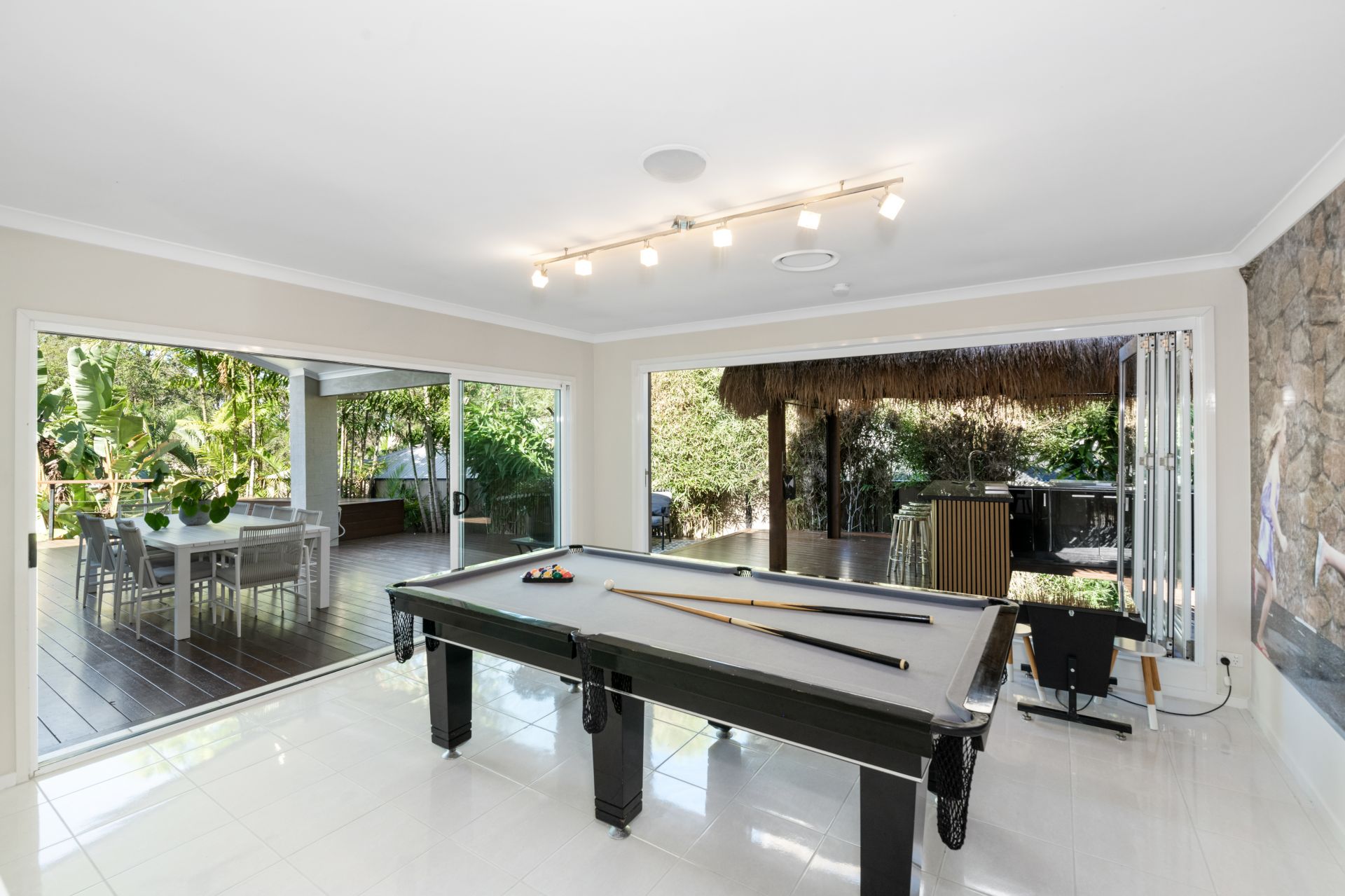 > Rumpus room sits adjacent the home's Living room and features tiled flooring, 2.6m high ceiling, integrated speakers and wall length stacker and bi-fold doors leading the outdoor entertaining deck and Bar, bringing together a fusion of indoor and outdoor living.