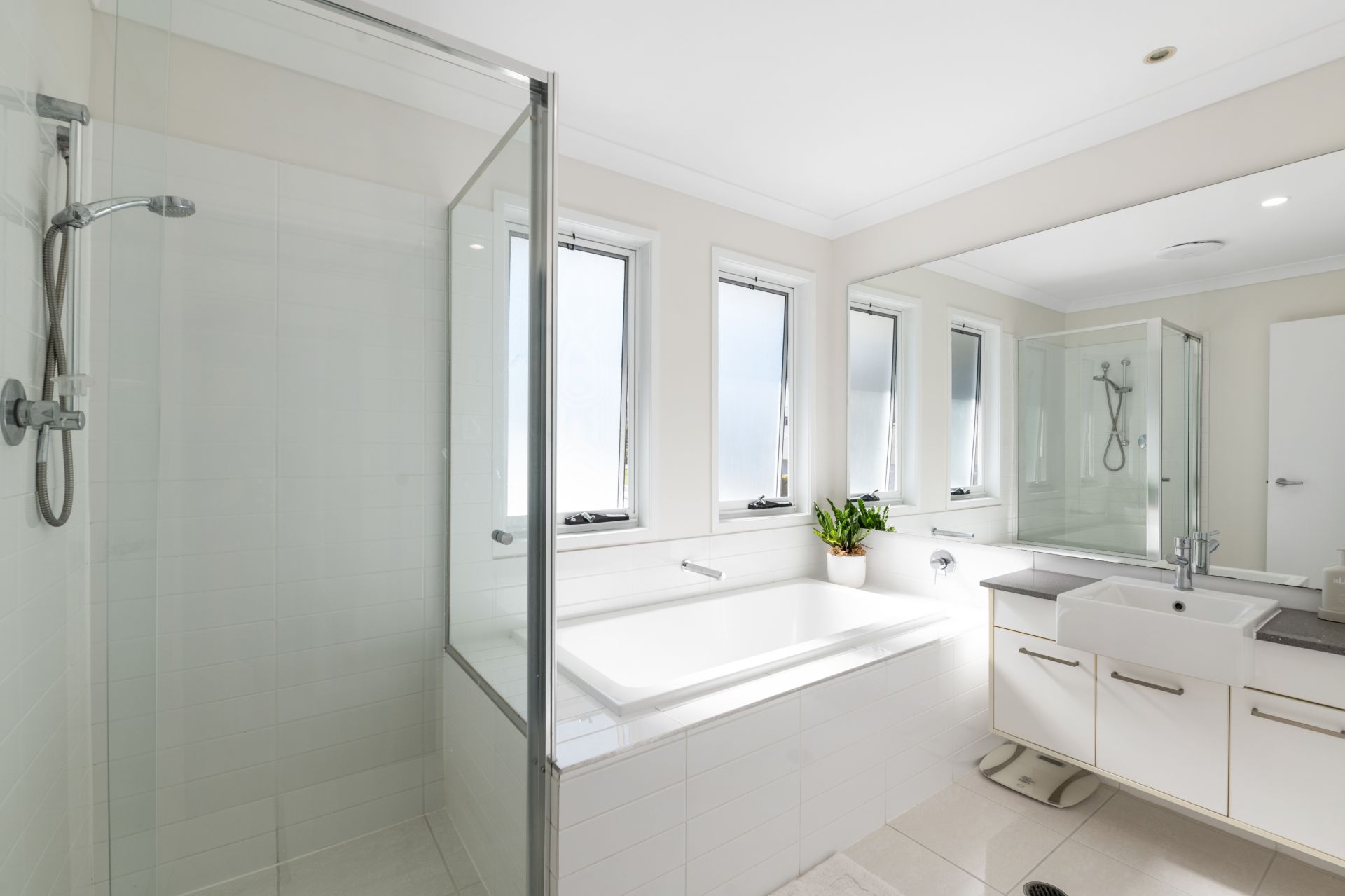 > Bathroom one is the home's main bathroom featuring tiled flooring, shower, separate deep-soaker bath, single vanity with stone benchtop and separate toilet.
