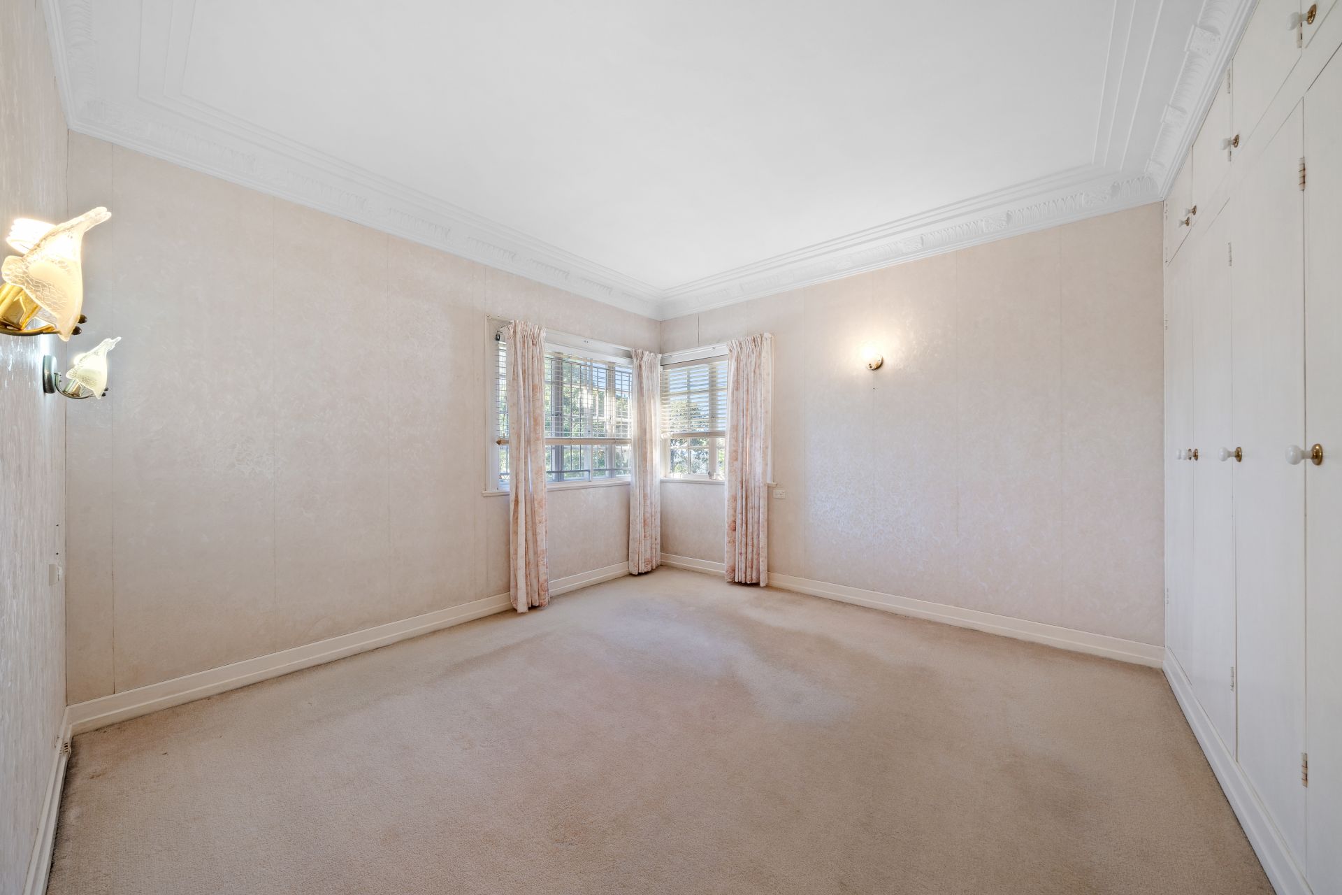 > The generous master bedroom, located at the front of the home, features extra-high ceilings with ornate cornicing, a built-in robe, carpet flooring, casement windows with security bars, fly screens, curtains, wallpaper, and sconce lighting.