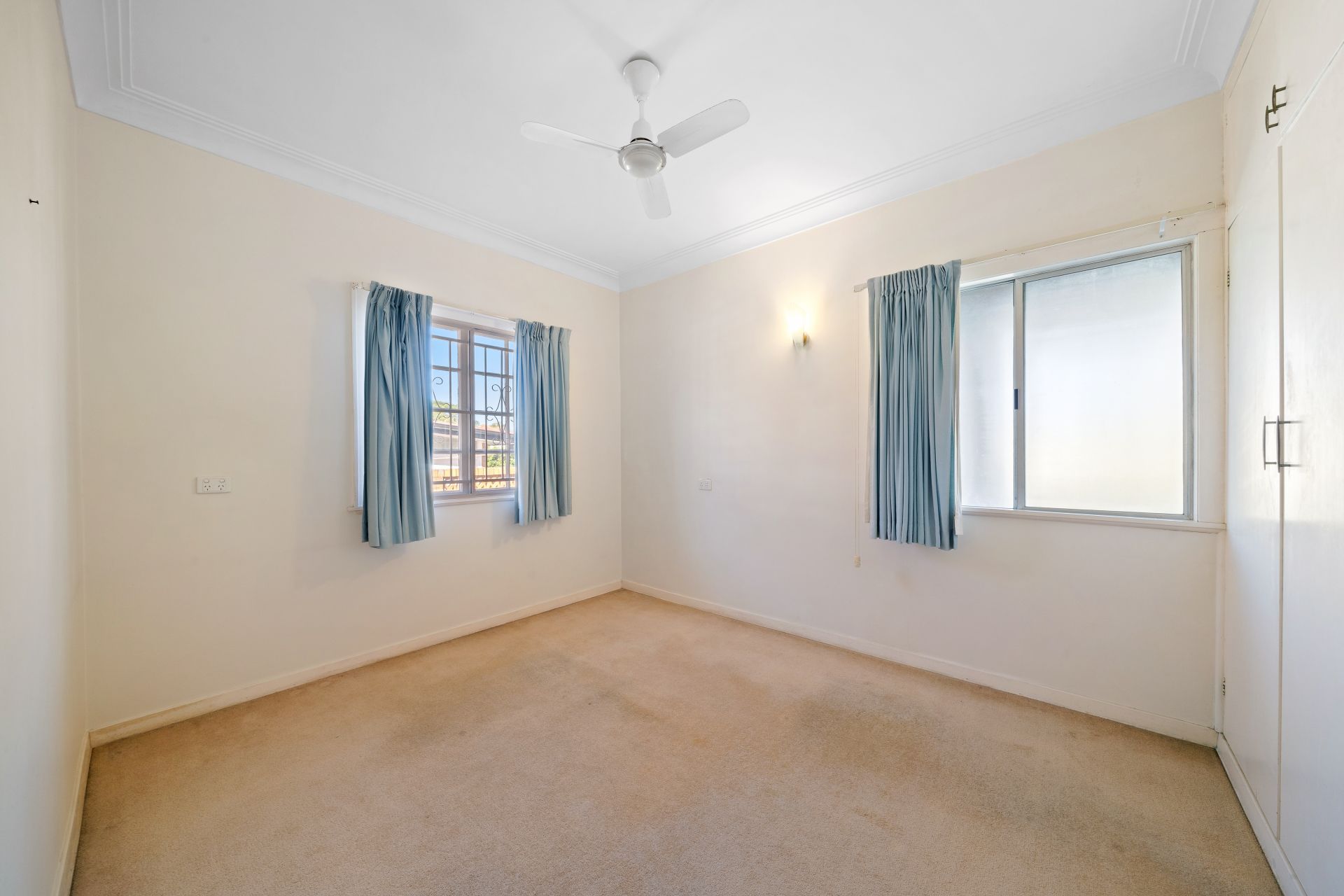 > Bedroom 3 features extra-high ceilings, ceiling fan, built-in-robe, carpet flooring, sconce lighting, a combination of casement and frosted sliding windows with security bars, and curtains.