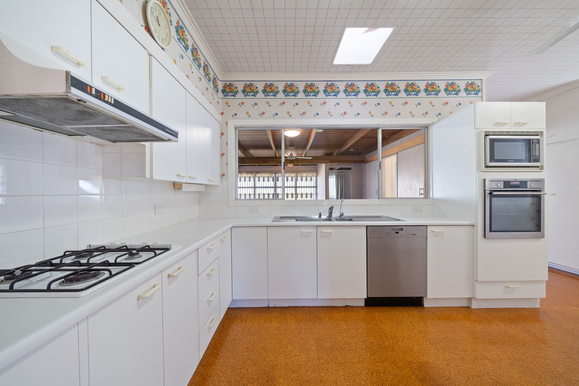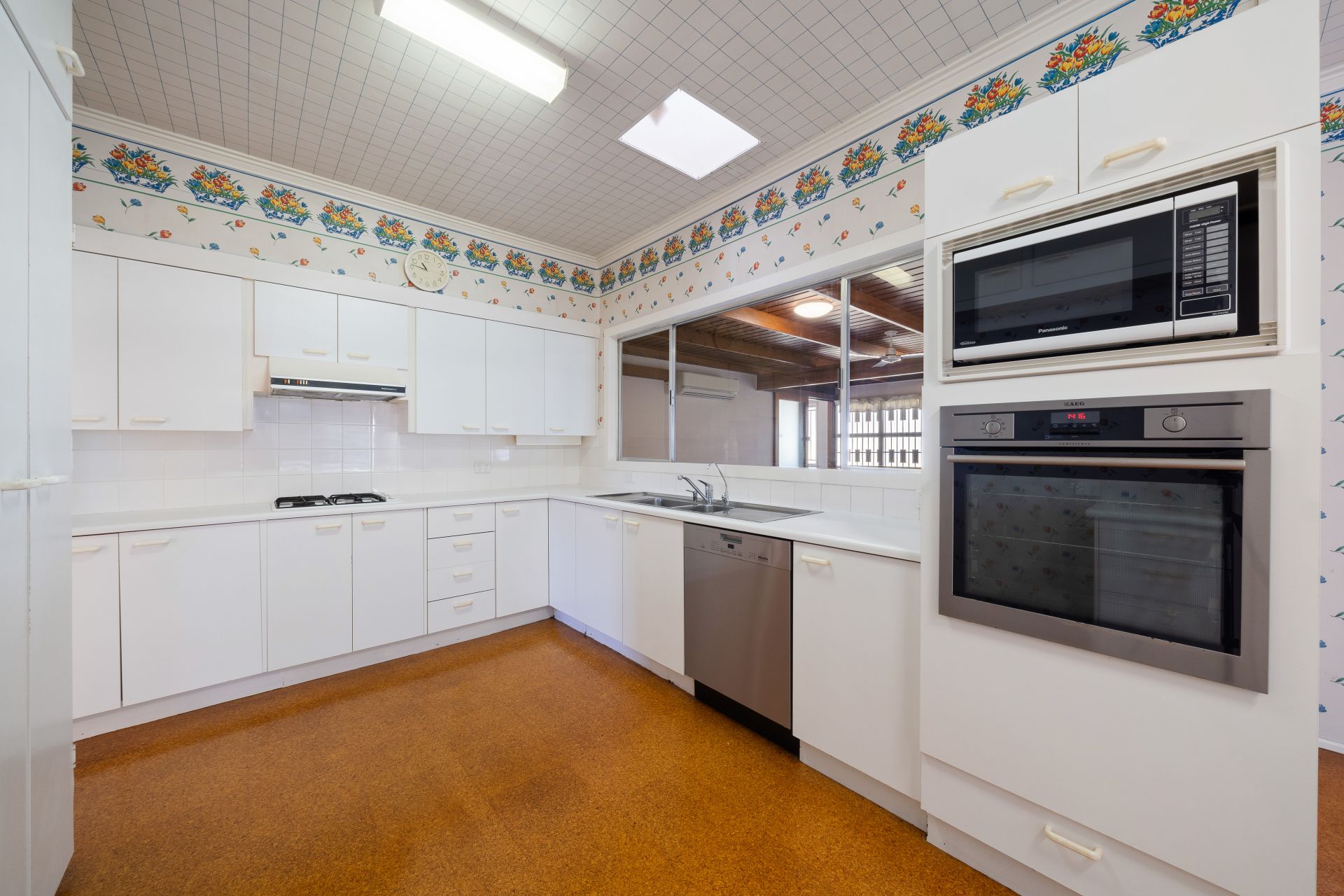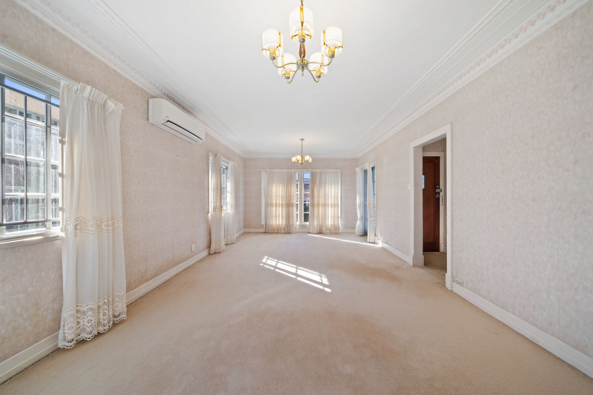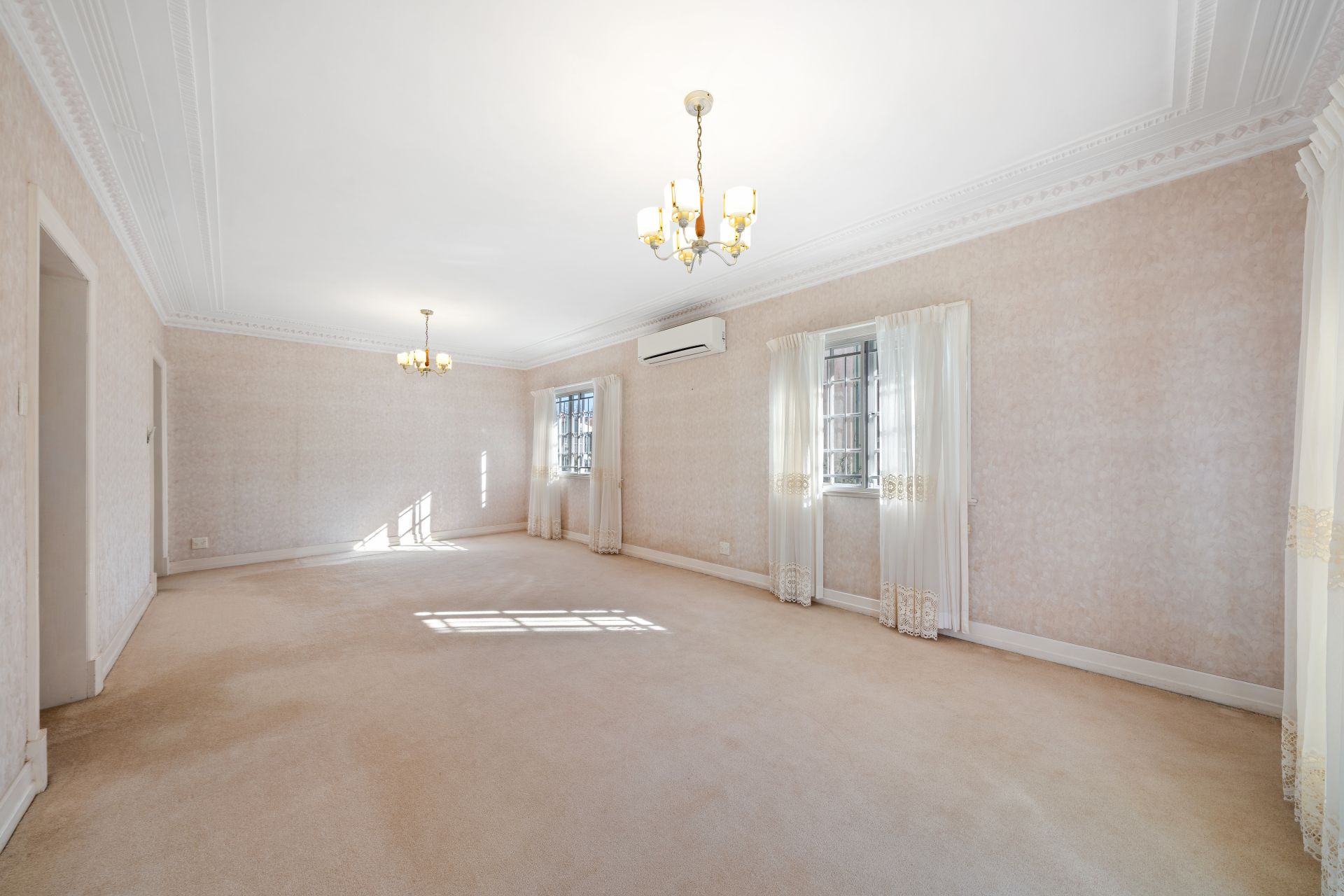 > The large living/dining room flows effortlessly to the kitchen and out to the family room. Featuring 2.7 metre extra-high ceilings, air conditioning, dual pendent lighting, carpet flooring, casement windows with security bars, curtains, wallpaper, and French doors giving you access to the front landing.