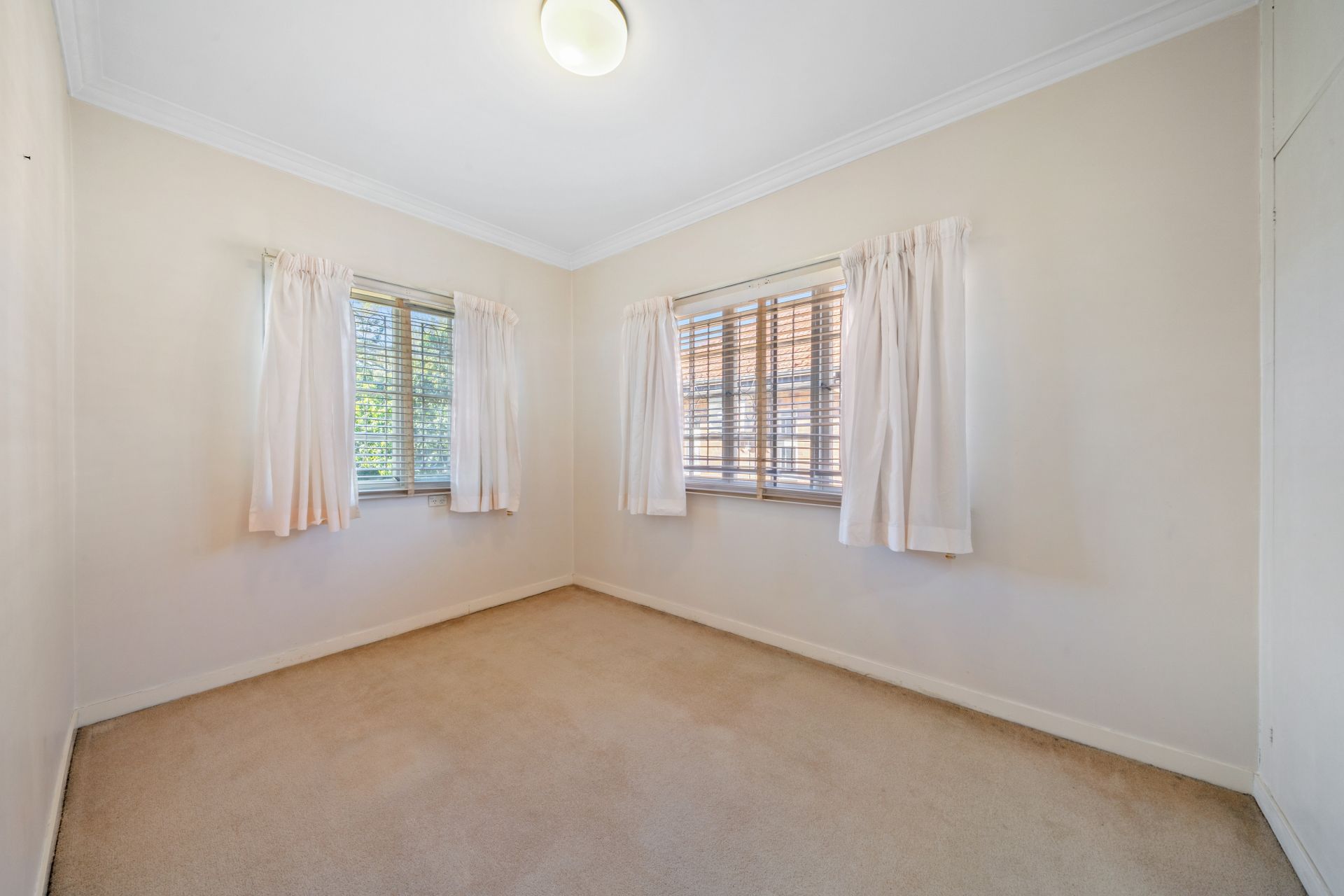 > Bedroom 2 features extra-high ceilings, built-in-robe with beauty station, carpet flooring, oyster lighting, casement windows with security bars, fly screens, and curtains.
