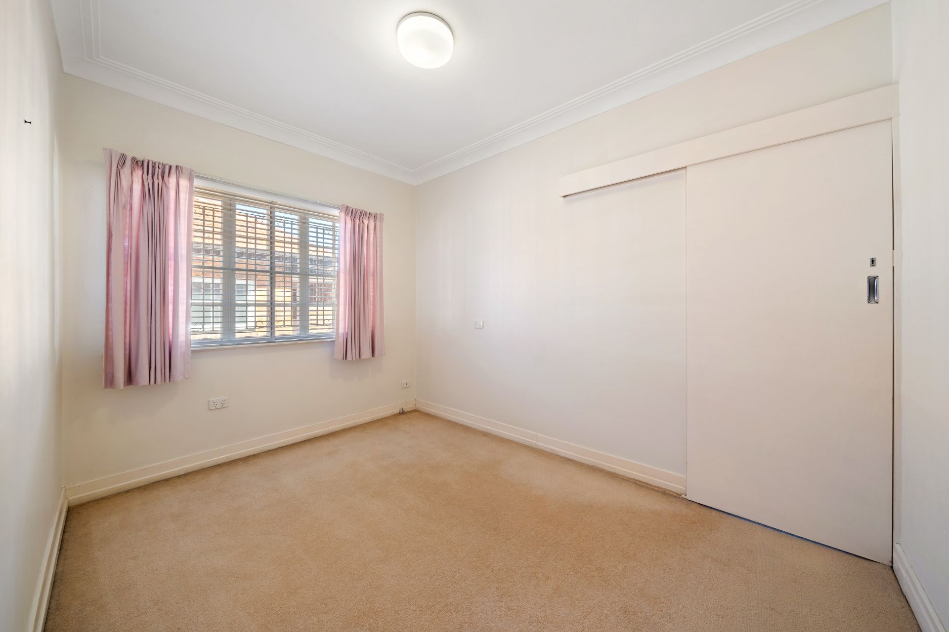 > Bedroom 4 features built-in-robe, carpet flooring, fluorescent lighting, frosted sliding windows with security bars, and curtains.