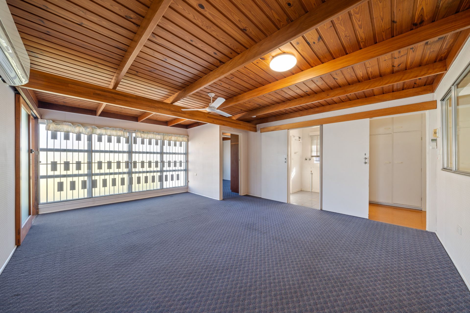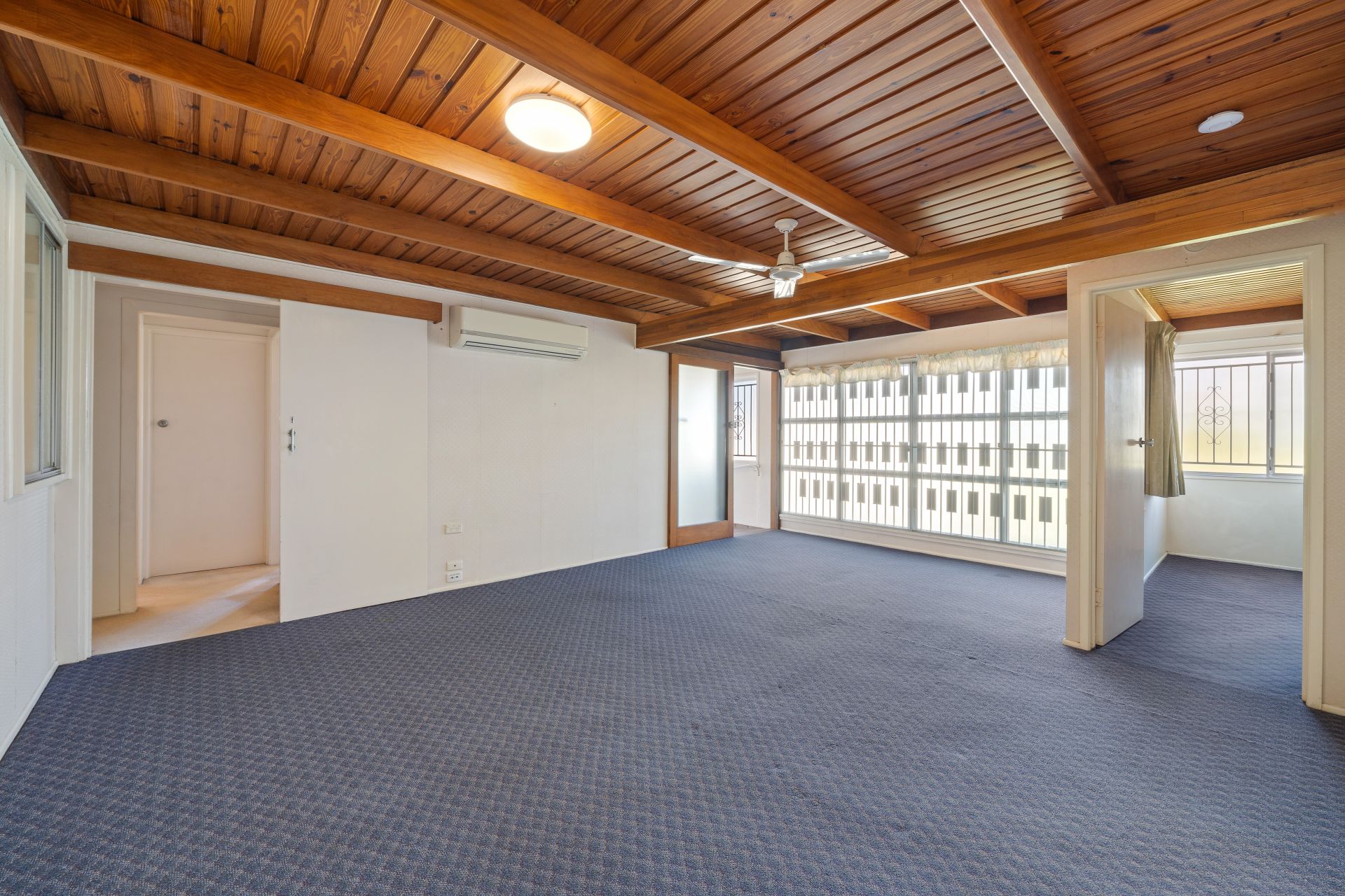 > Located at the rear of the property is the large family room featuring air conditioning, carpet flooring, timber ceiling detailing, casement windows with security bars, and access to the yard.