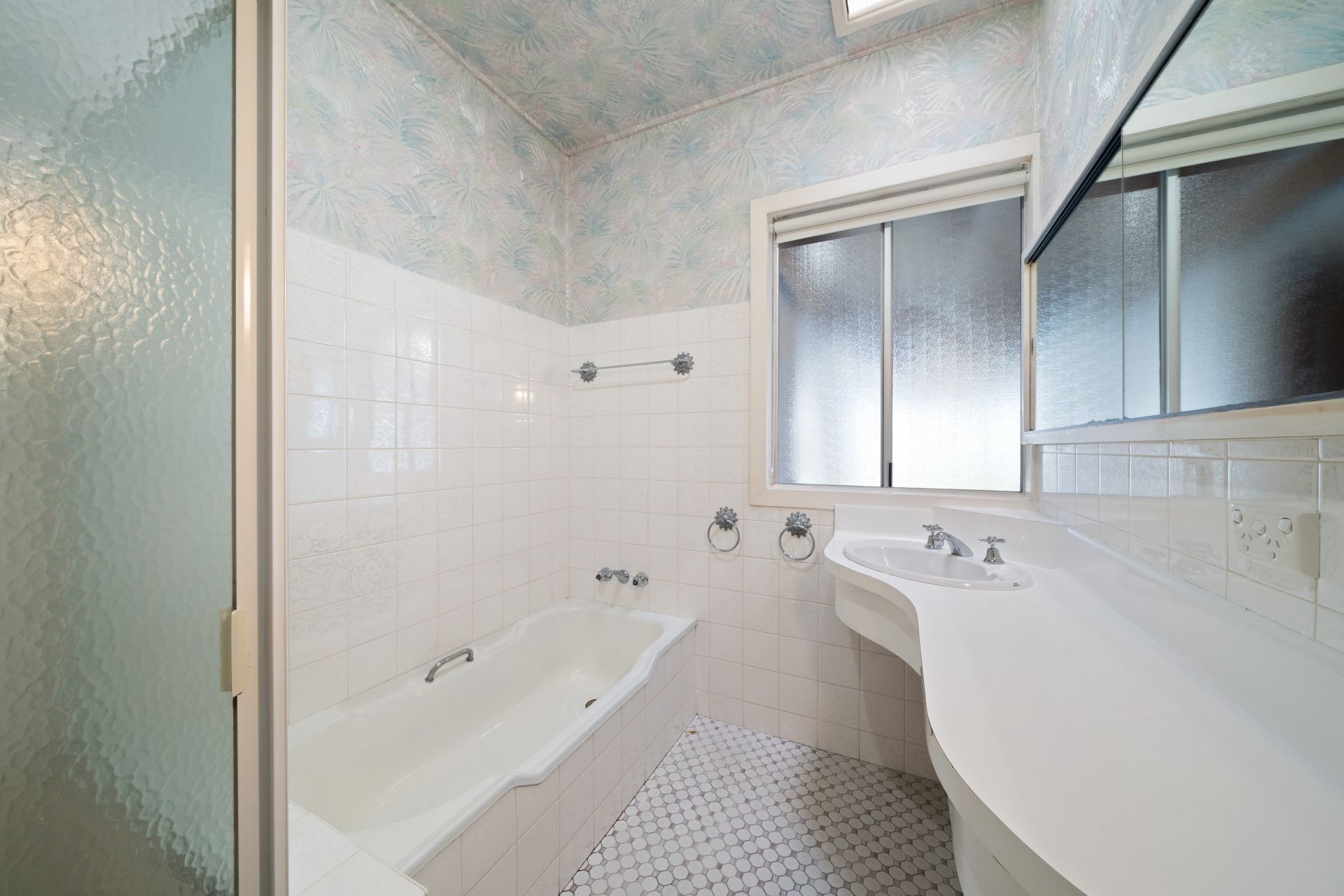 > The main bathroom features a shower with separate bath configuration, detachable shower head, single floating basin vanity, wall mounted vanity mirror with storage, towel rail, hand towel rails, wallpaper, skylight, heat/light/extractor combo, and frosted sliding window.