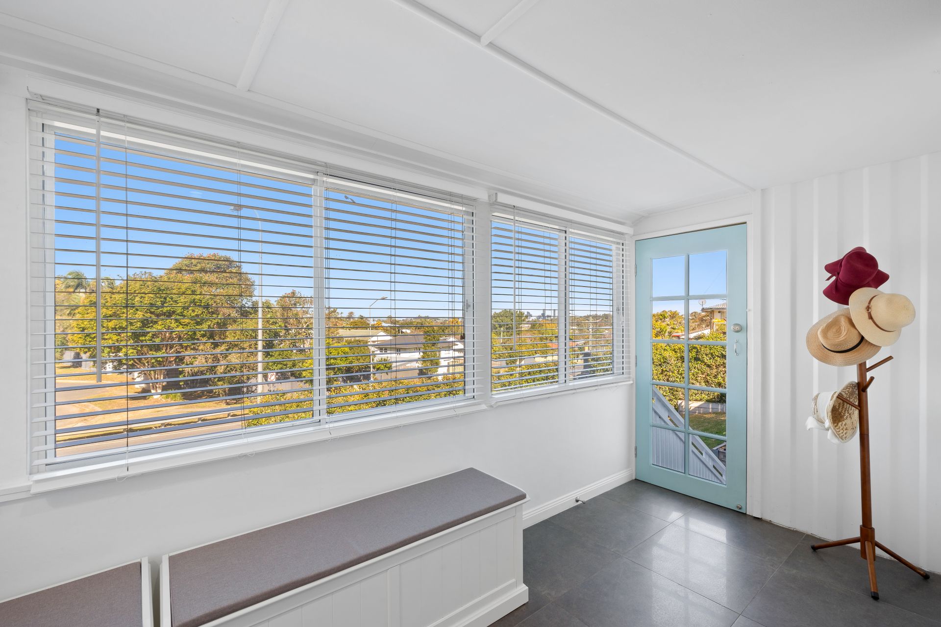 > The sunroom, located at the front of the home, boasts city views, tiled flooring, LED down-lighting, and sliding windows with Venetian blinds.