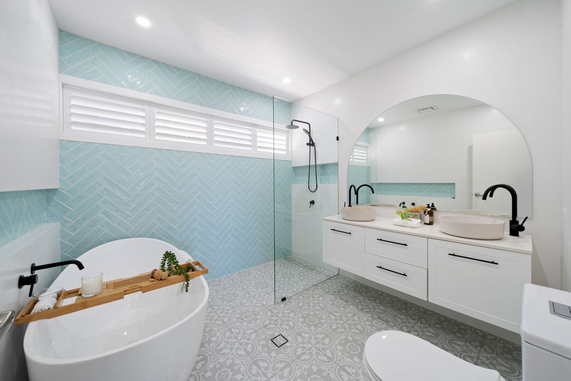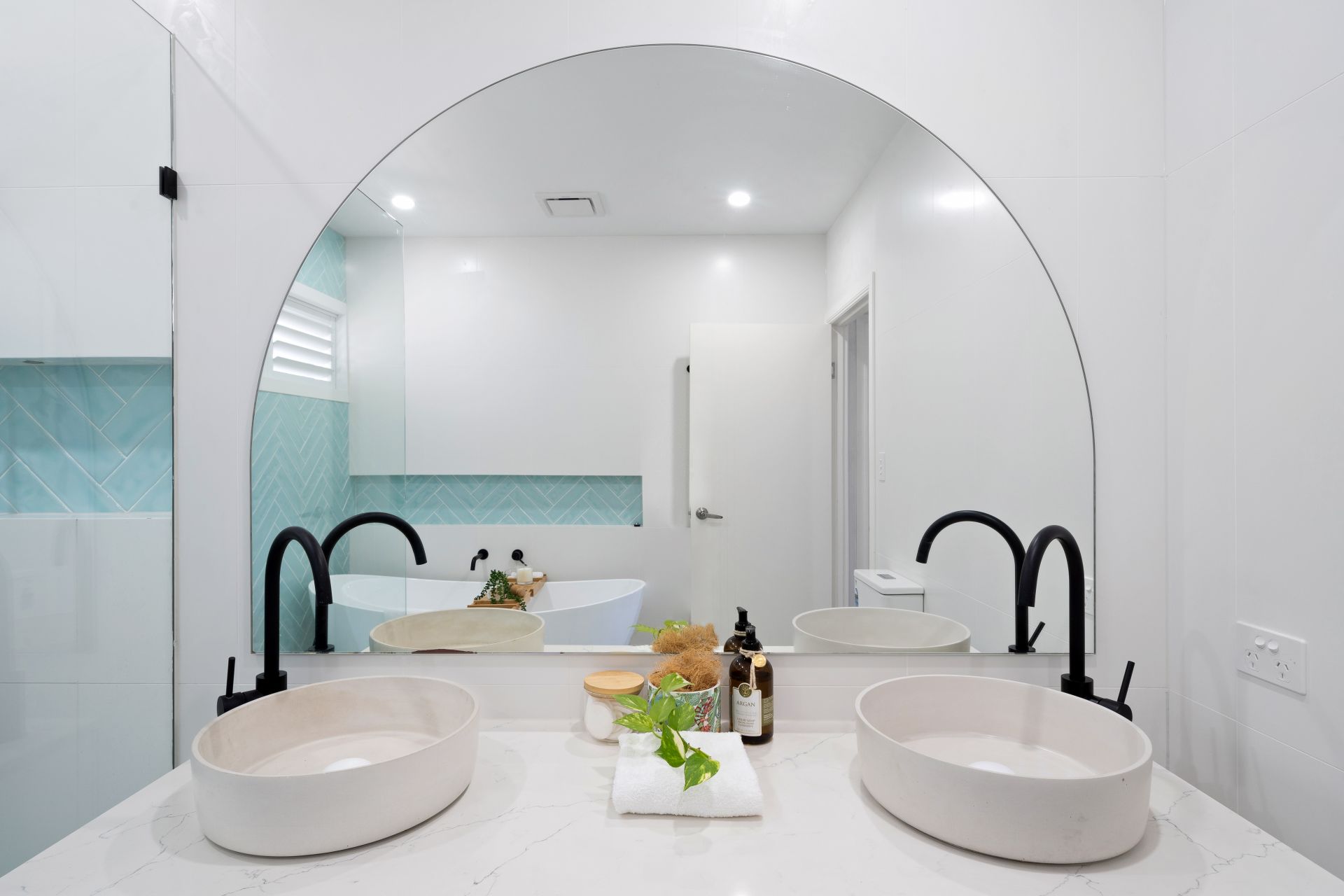 > The main bathroom features chic floor-to-ceiling tiles, a frameless walk-in shower with dual shower heads (detachable and raindrop), dual wall niches, a separate freestanding bath, a dual custom concrete top-mounted floating basin vanity with a 20mm Caesarstone top, custom black tapware, a large frameless mirror, towel hooks, extra-high ceilings, down lighting, an extractor, plantation shutters, and a toilet.