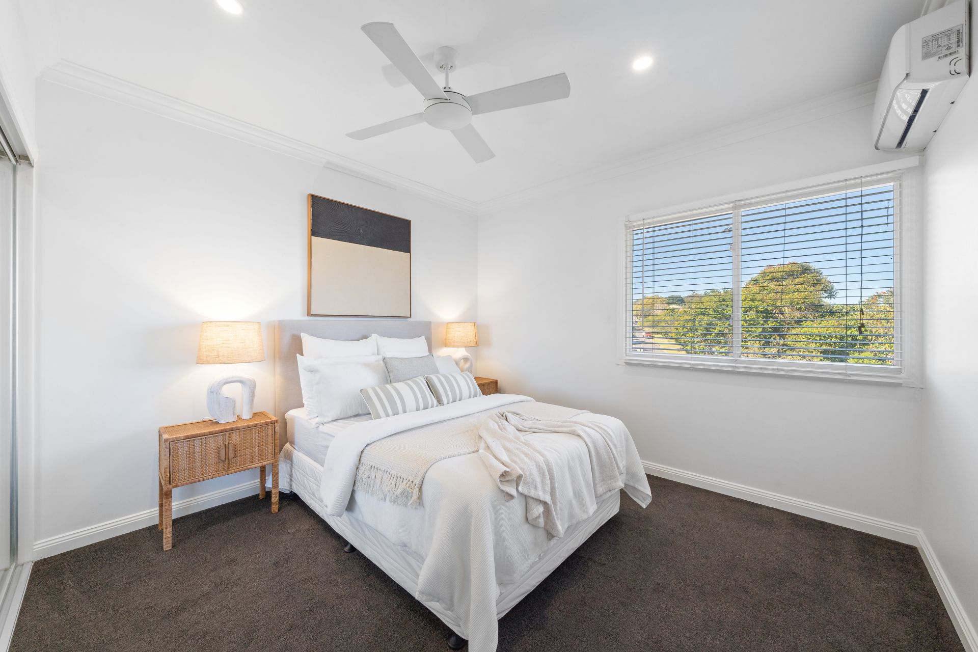 > Bedroom 2 boasts city views, a Kelvinator air conditioner, extra-high ceilings, ornate cornicing, carpet flooring, a built-in robe, LED down-lighting, and sliding windows with Venetian blinds.
