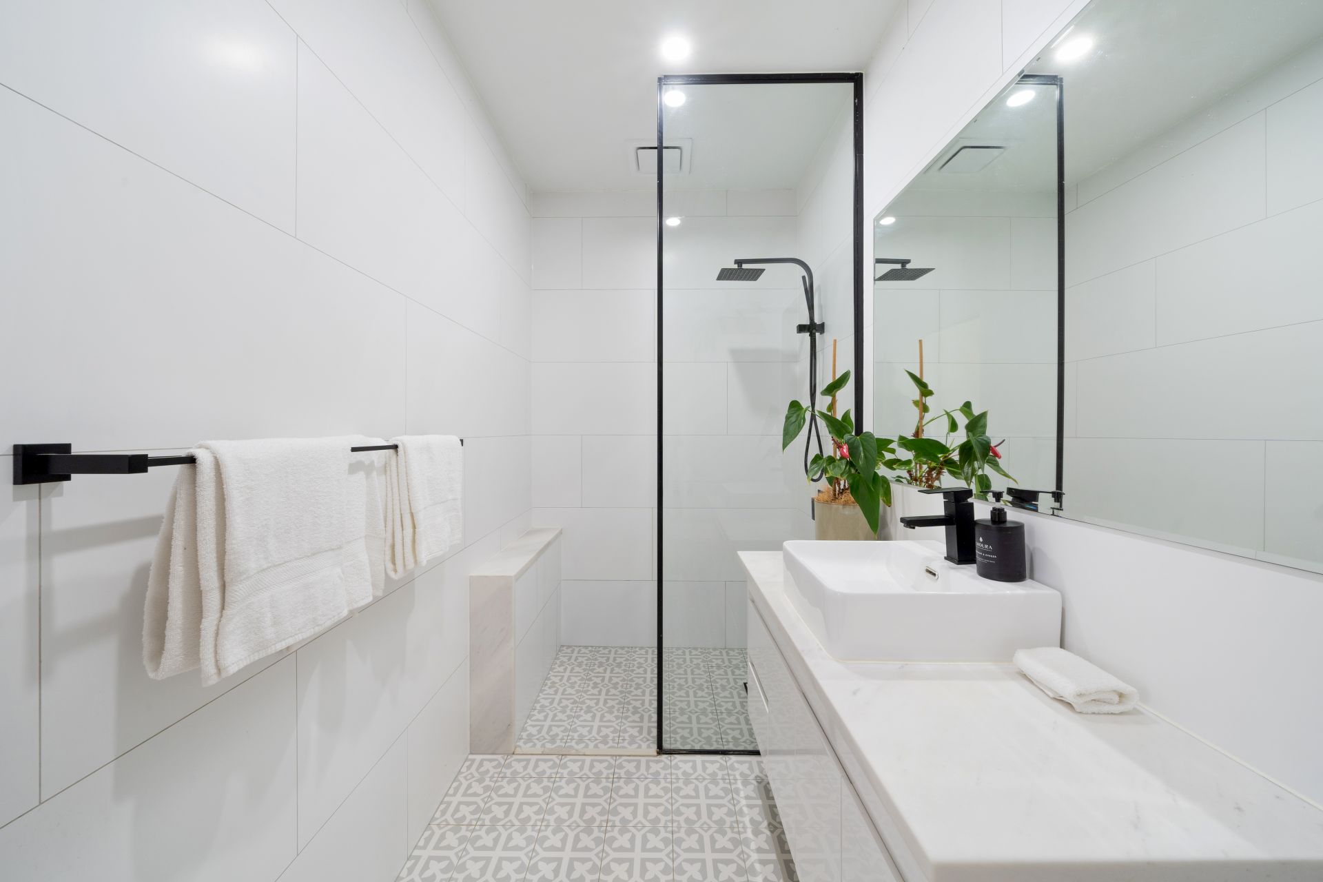 > The master ensuite features chic floor-to-ceiling tiles, a black-framed walk-in shower with dual shower heads (detachable and raindrop), a built-in shower seat/shelf, a top-mounted floating basin vanity with a natural marble bench top, custom black tapware, a large frameless mirror, a towel rail, extra-high ceilings, down lighting, an extractor, and a toilet.