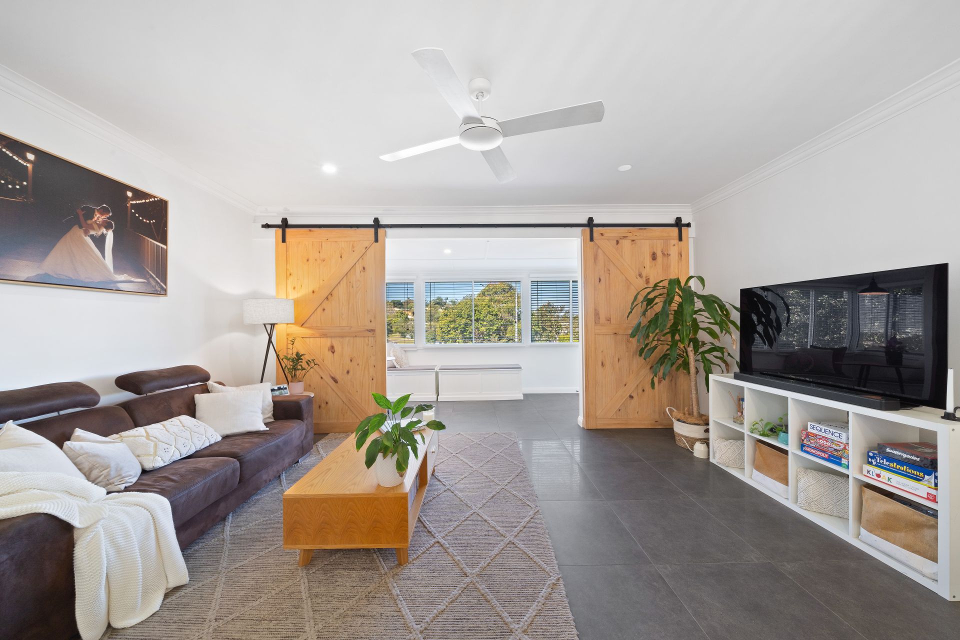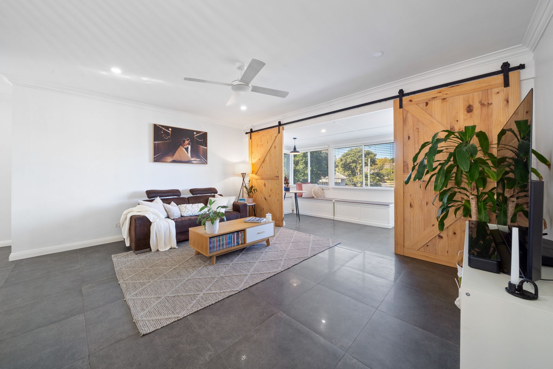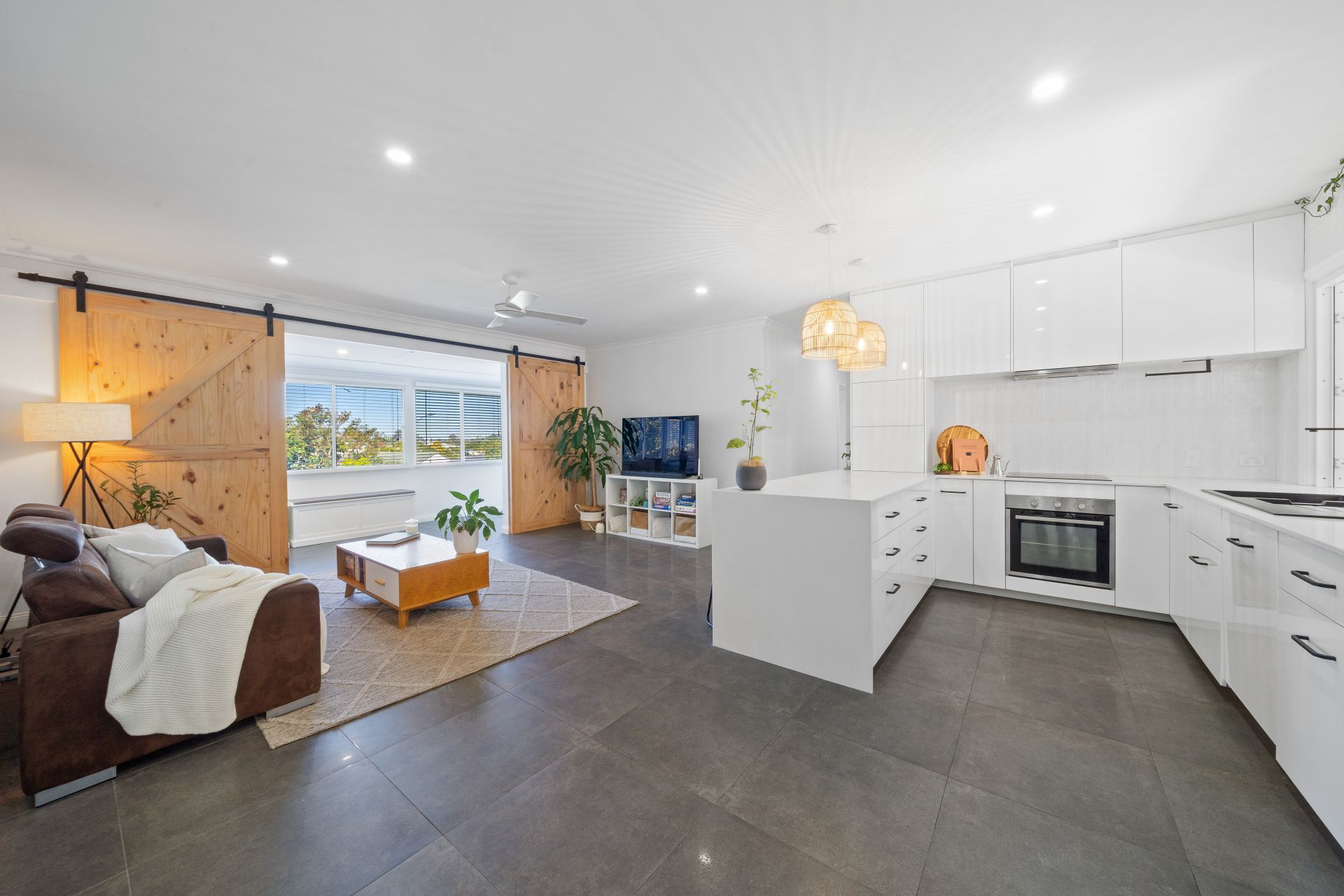 > The open-plan main living/dining area, located at the heart of the home, flows effortlessly to the kitchen and out to the dual outdoor entertaining areas. The extra-high ceilings enhance the expansive nature of this home, which boasts city views, dual barn doors, ornate cornicing, LED down-lighting, and tiled flooring.