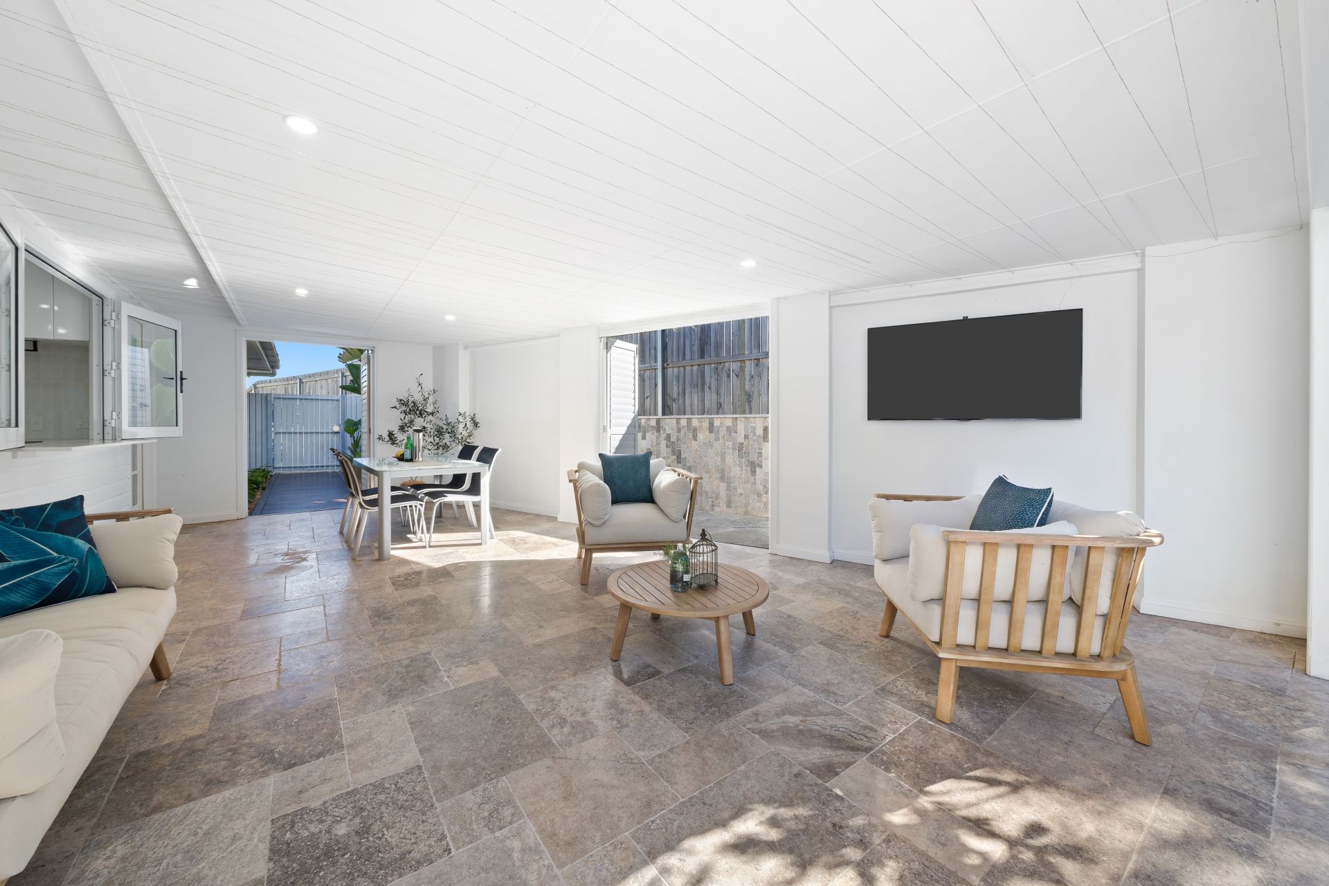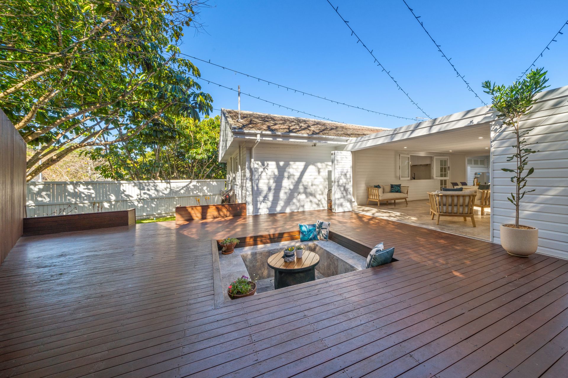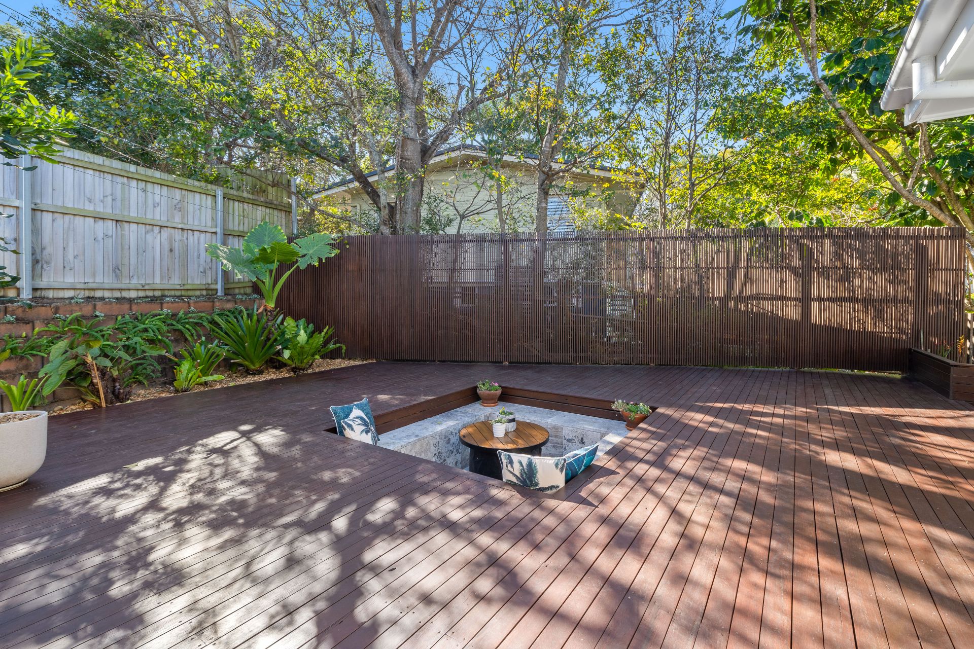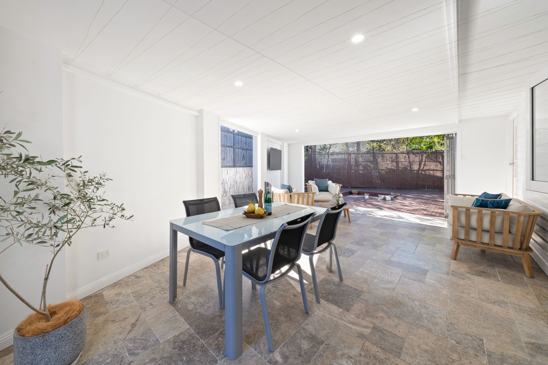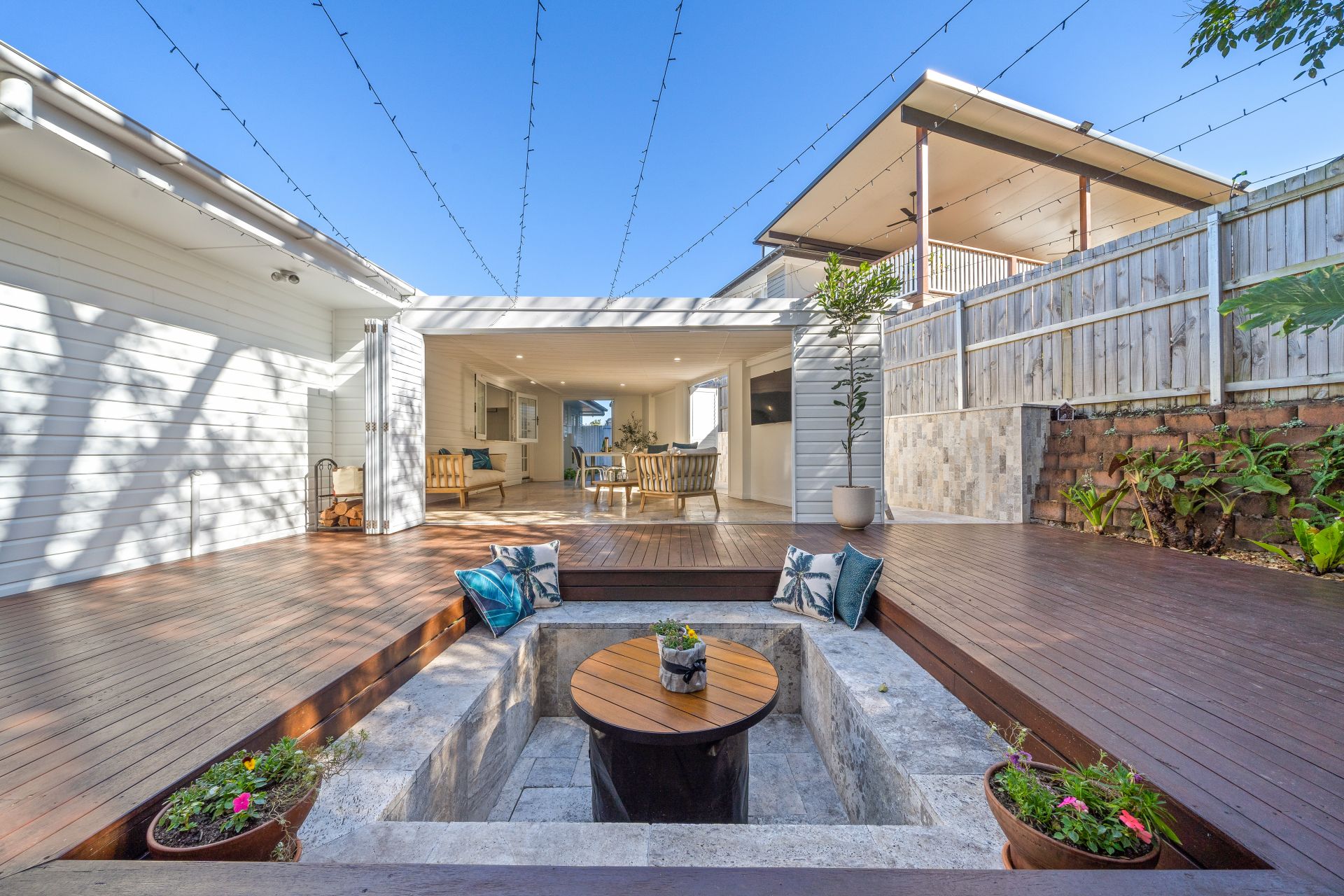 - Outdoor entertaining will be a breeze year-round with the dual indoor and outdoor entertaining areas. From the enclosed alfresco, which captures cool breezes and overlooks the lush landscaped yard, to the alfresco area with stained decking and a sunken travertine fire pit, this space is perfect for open-air entertaining. Features include glass French doors allowing easy access from the living areas, LED down-lighting, fully bi-folding aluminum plantation shutters, natural stone travertine tiles, a pass-through window with a Caesarstone benchtop and power points, and outdoor lighting. The fully enclosed fence line ensures the yard is perfect for kids and pets.
