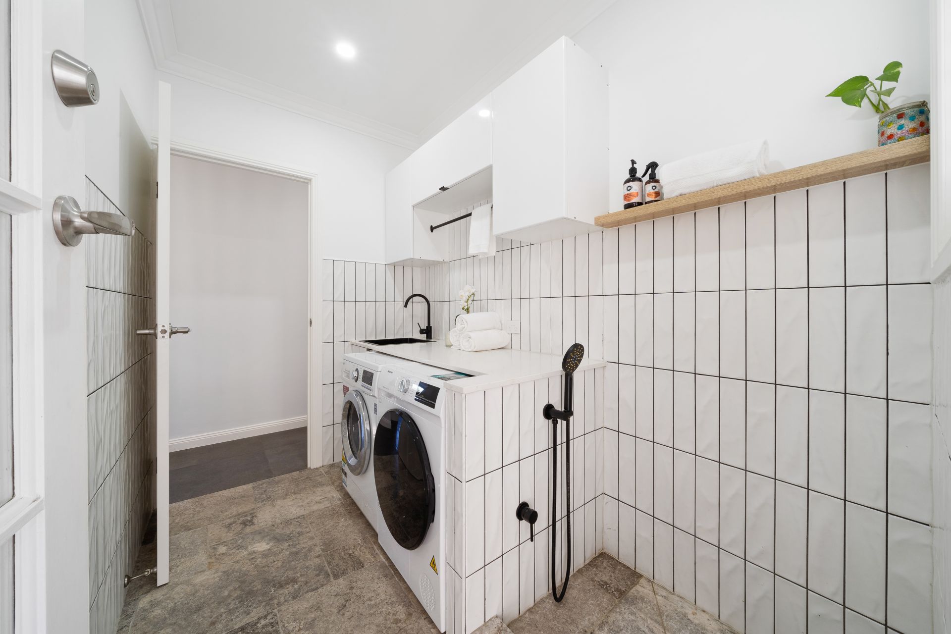 - Generous laundry featuring custom cabinetry with a wash tub, as well as ample bench, cupboard, and hanging space. It also includes a pet washing bay with a detachable shower head.