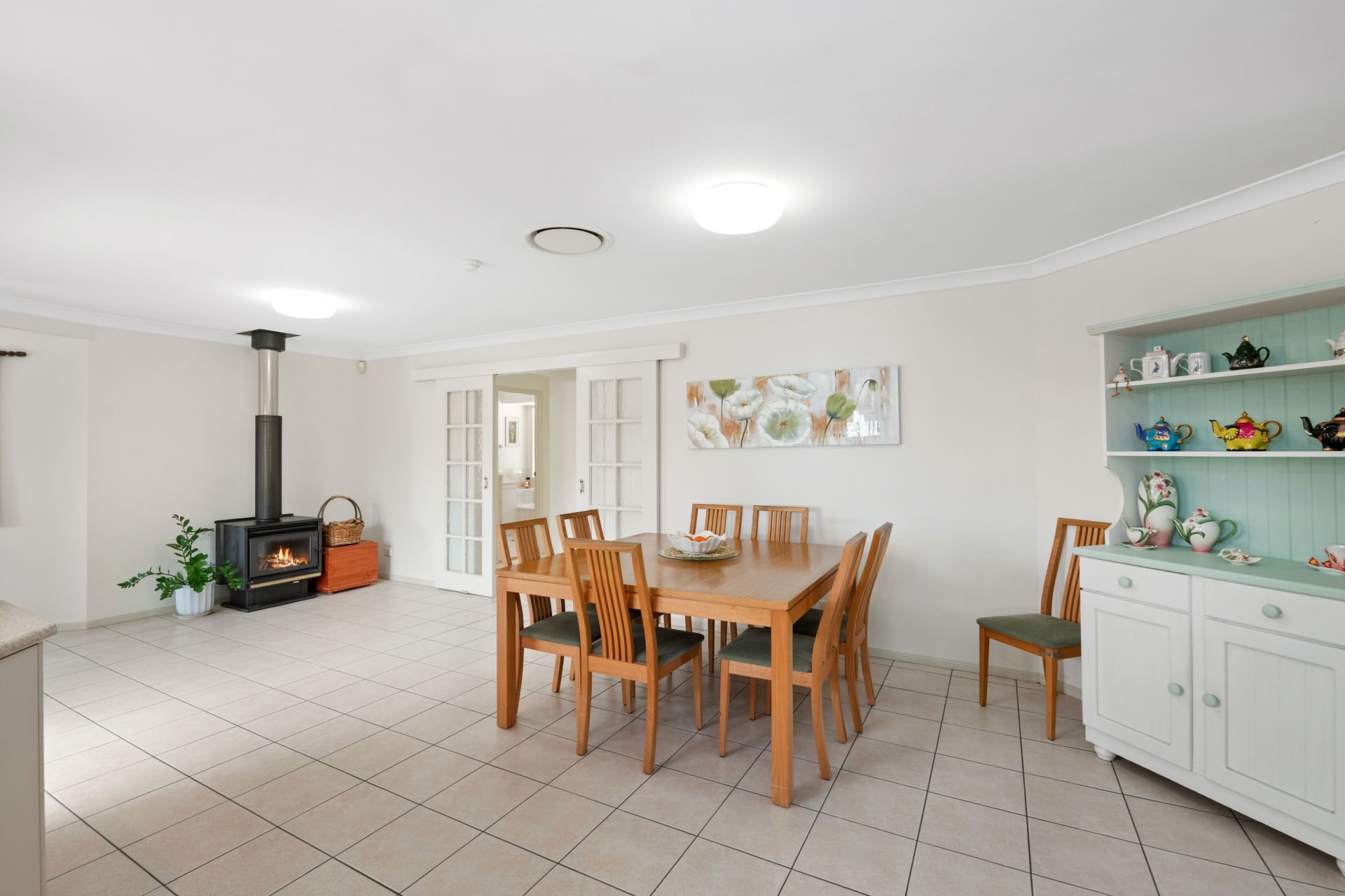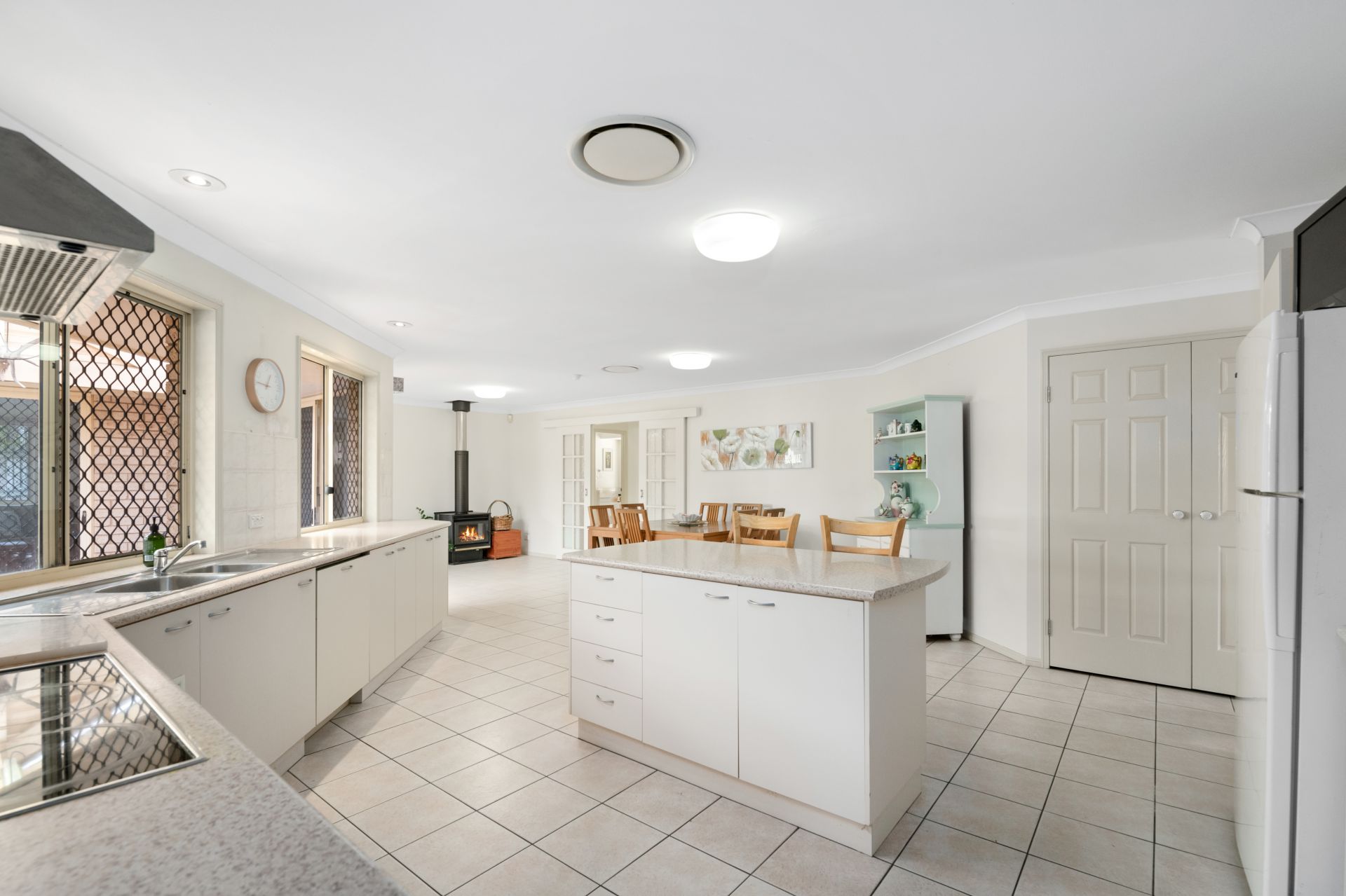 > Family room shares an open plan living space with the home's kitchen, featuring wood burning fire place, ducted air-conditioning, tiled flooring and access to the covered entertaining deck, spa and back yard.