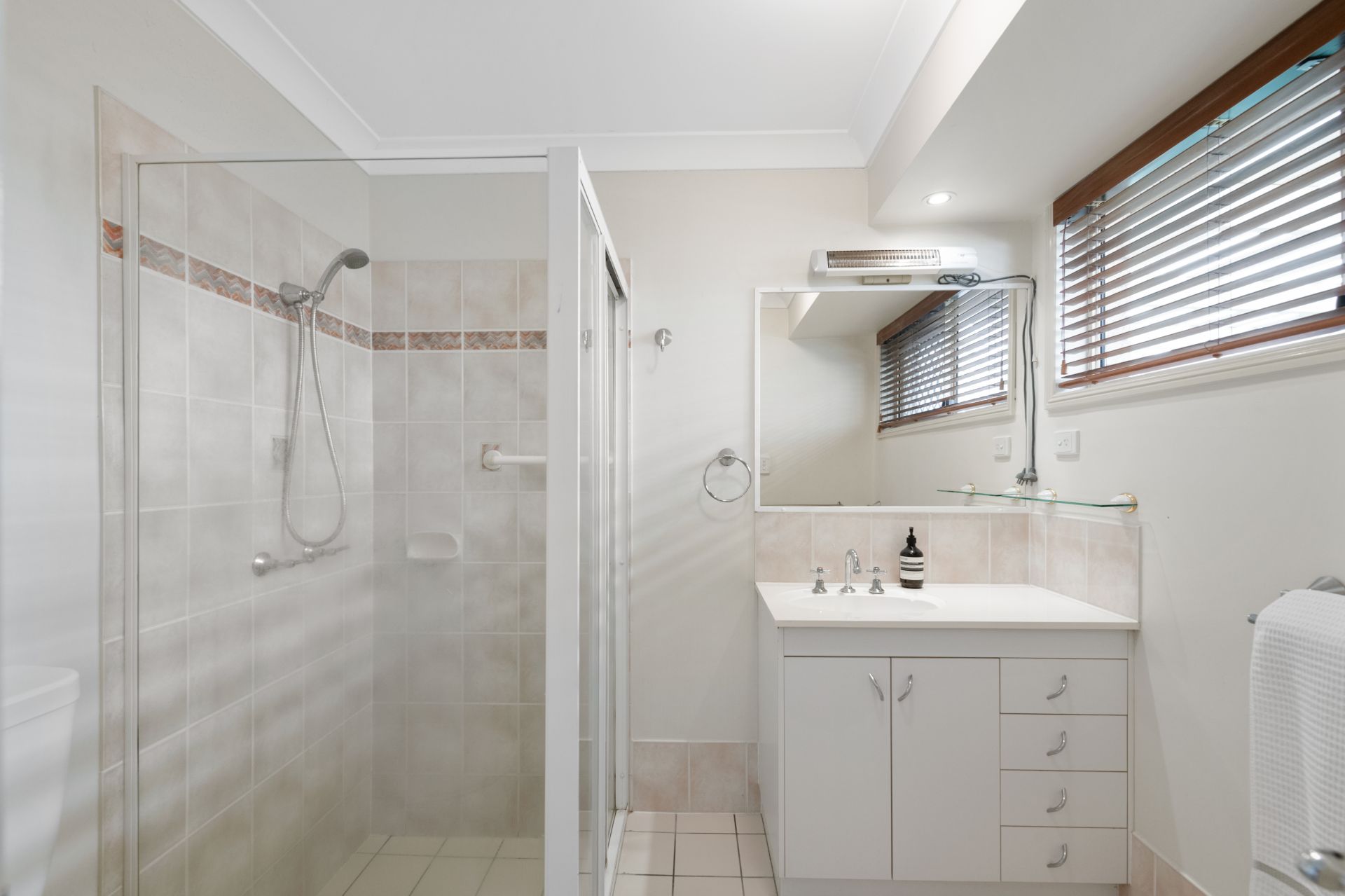 > Bathroom two is the ensuite to the master bedroom and features tiled flooring, large shower with detachable shower head, single vanity, and toilet.
