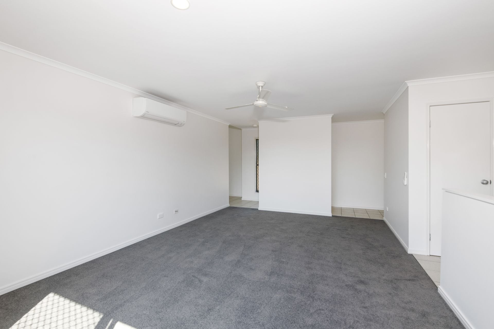 > The Formal lounge is located at the top of the internal staircase and features freshly carpeted flooring, split system air-conditioning, ceiling fan, blinds and access to the side balcony.