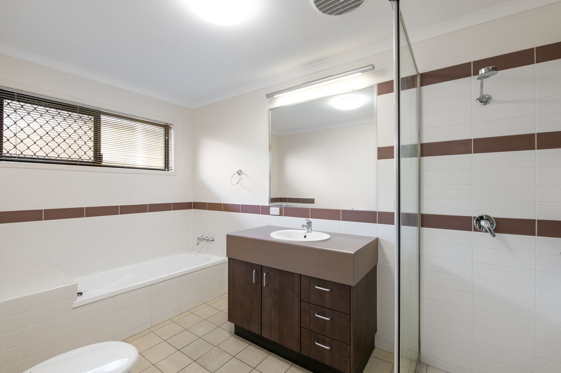 > The home's main bathroom is located on the ground floor with all the bedrooms and features tiled flooring, shower, separate bath, single vanity and toilet.