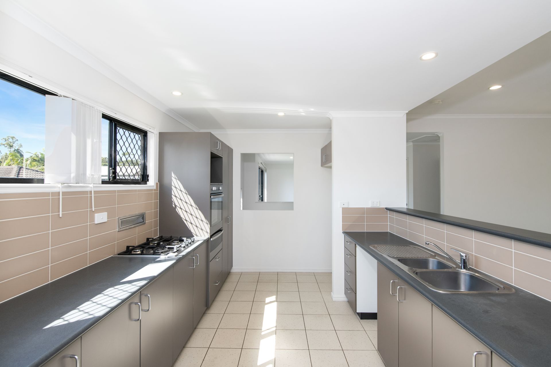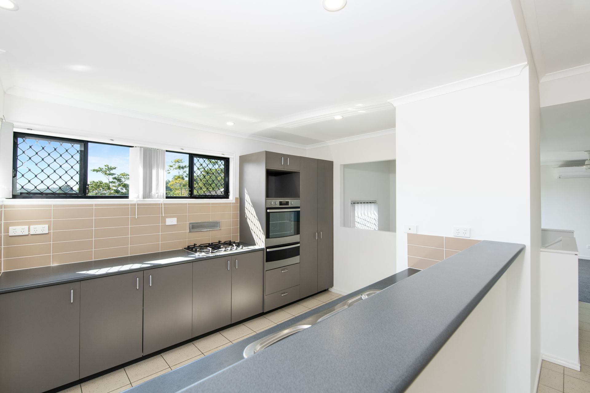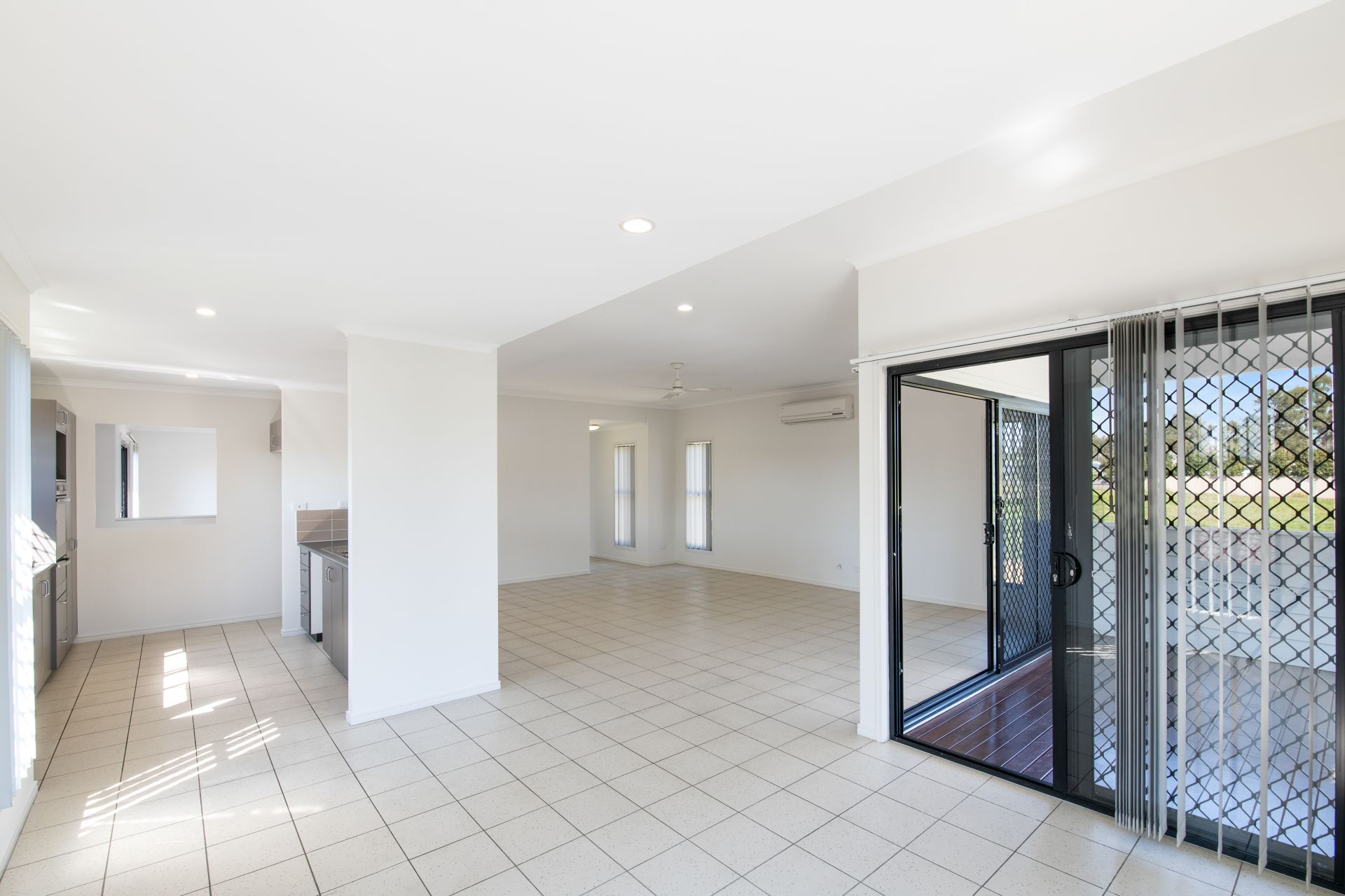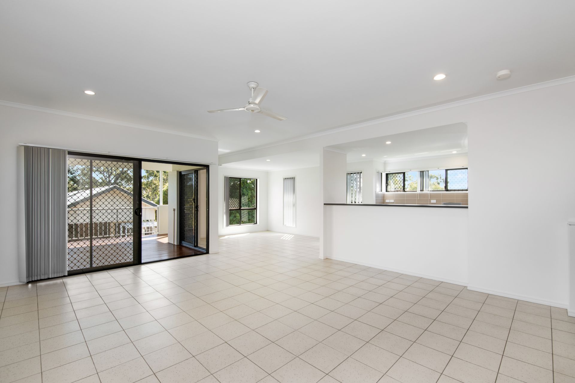 > Living and Dining rooms share a large open space with the kitchen and features tiled flooring, 2.7m high ceiling in the Living room, split system air-conditioning, ceiling fans, blinds and access to the rear deck from both the Living and Dining areas.