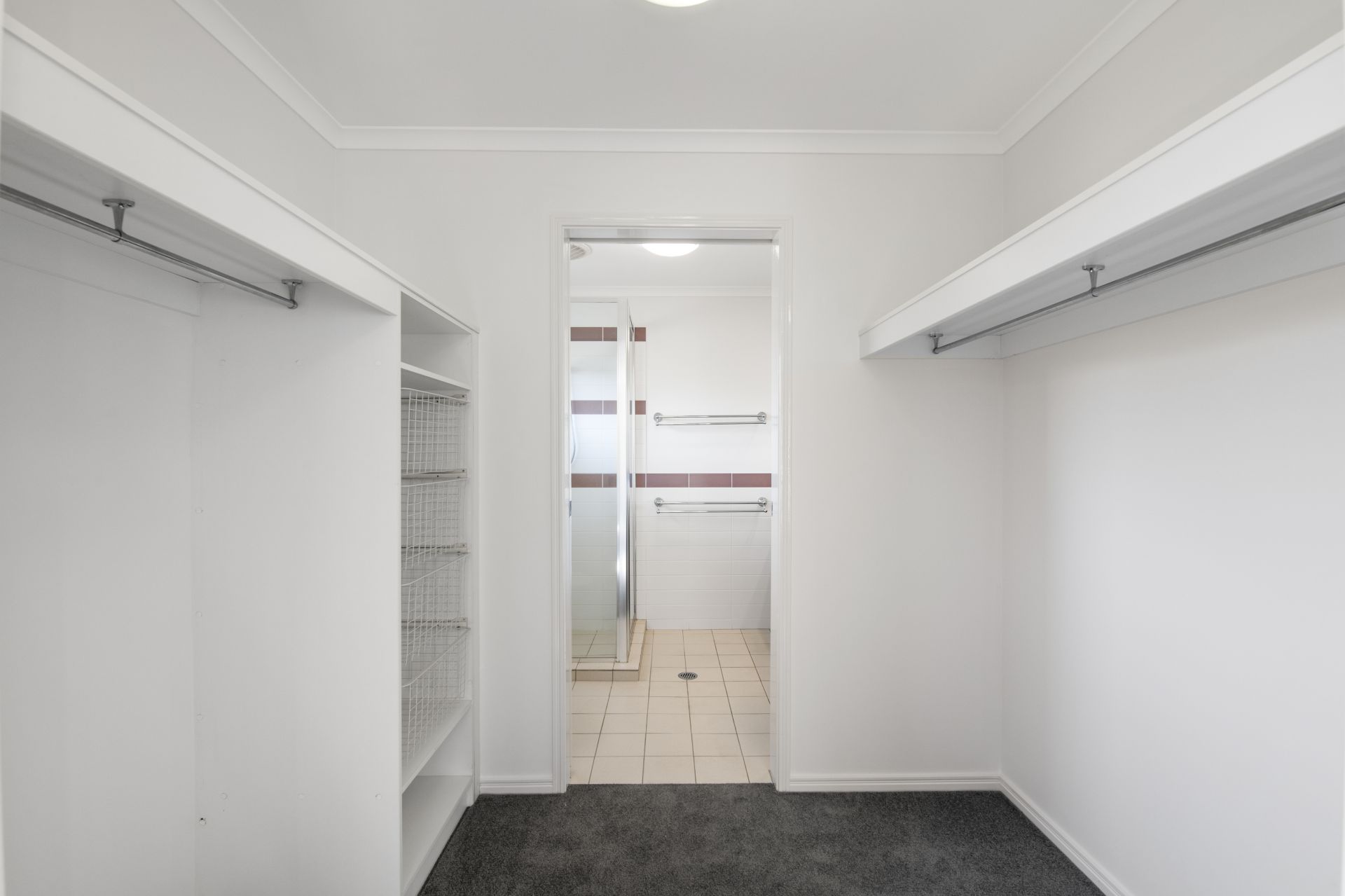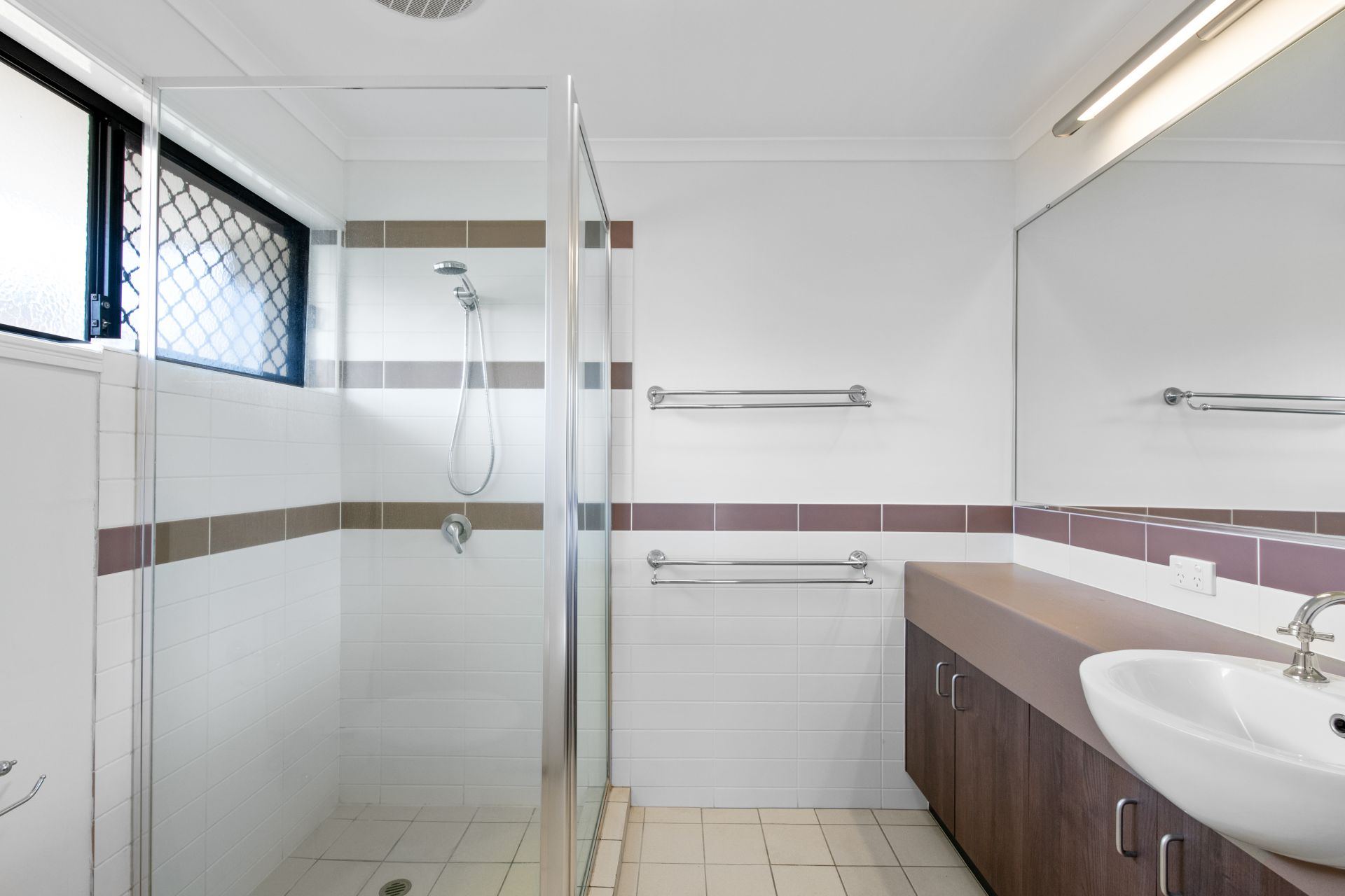 > Bathroom two is the ensuite to the Master bedroom, accessed through the walk-thru-robe, it features tiled flooring shower with detachable showerhead, single vanity and toilet.