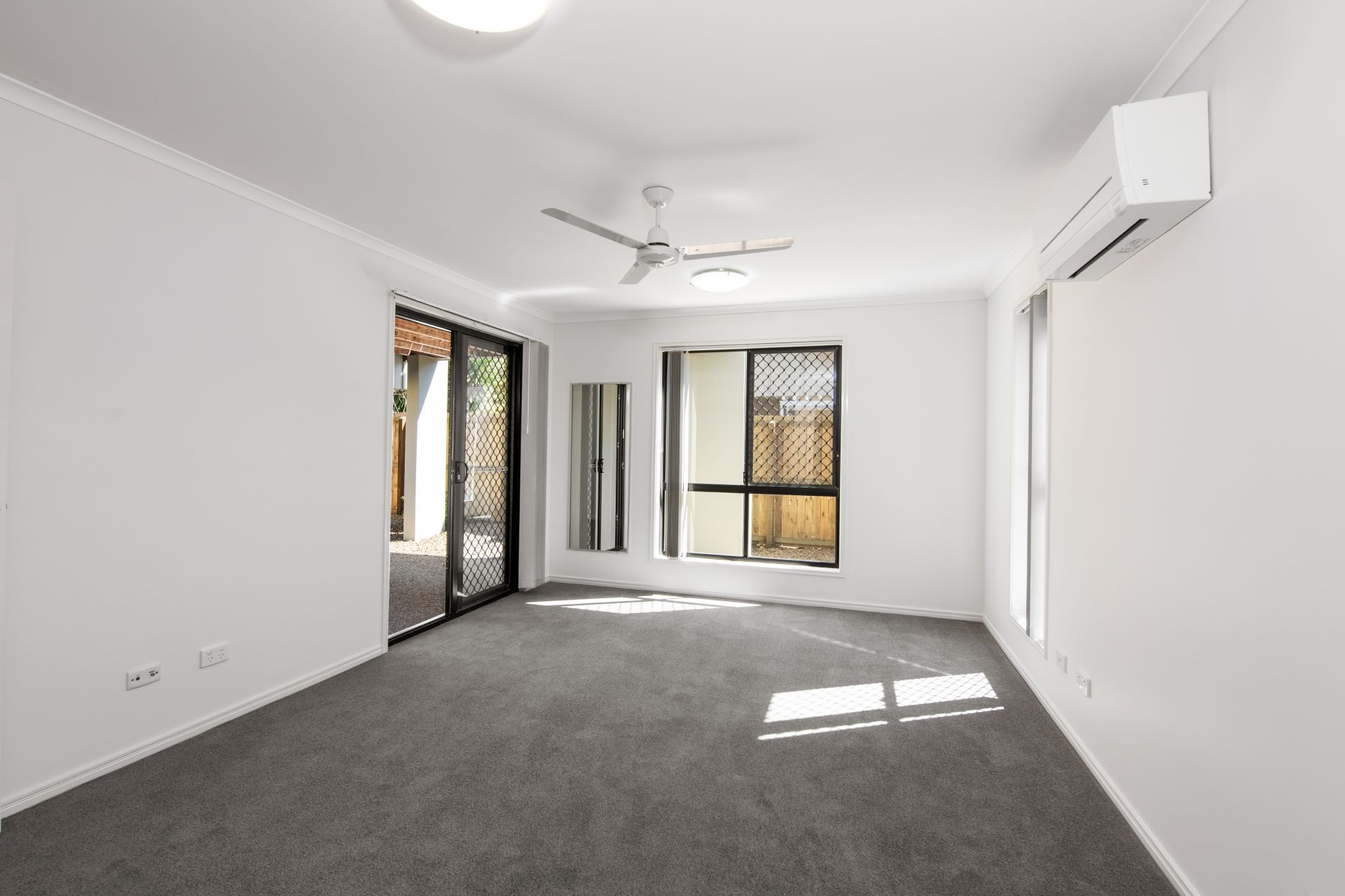 > Bedroom one is the home's Master bedroom featuring fresh carpeted flooring, walk-thru-robe, ensuite, brand new Daikin split system air-conditioning, ceiling fan, blinds and access to the covered patio and back yard.
