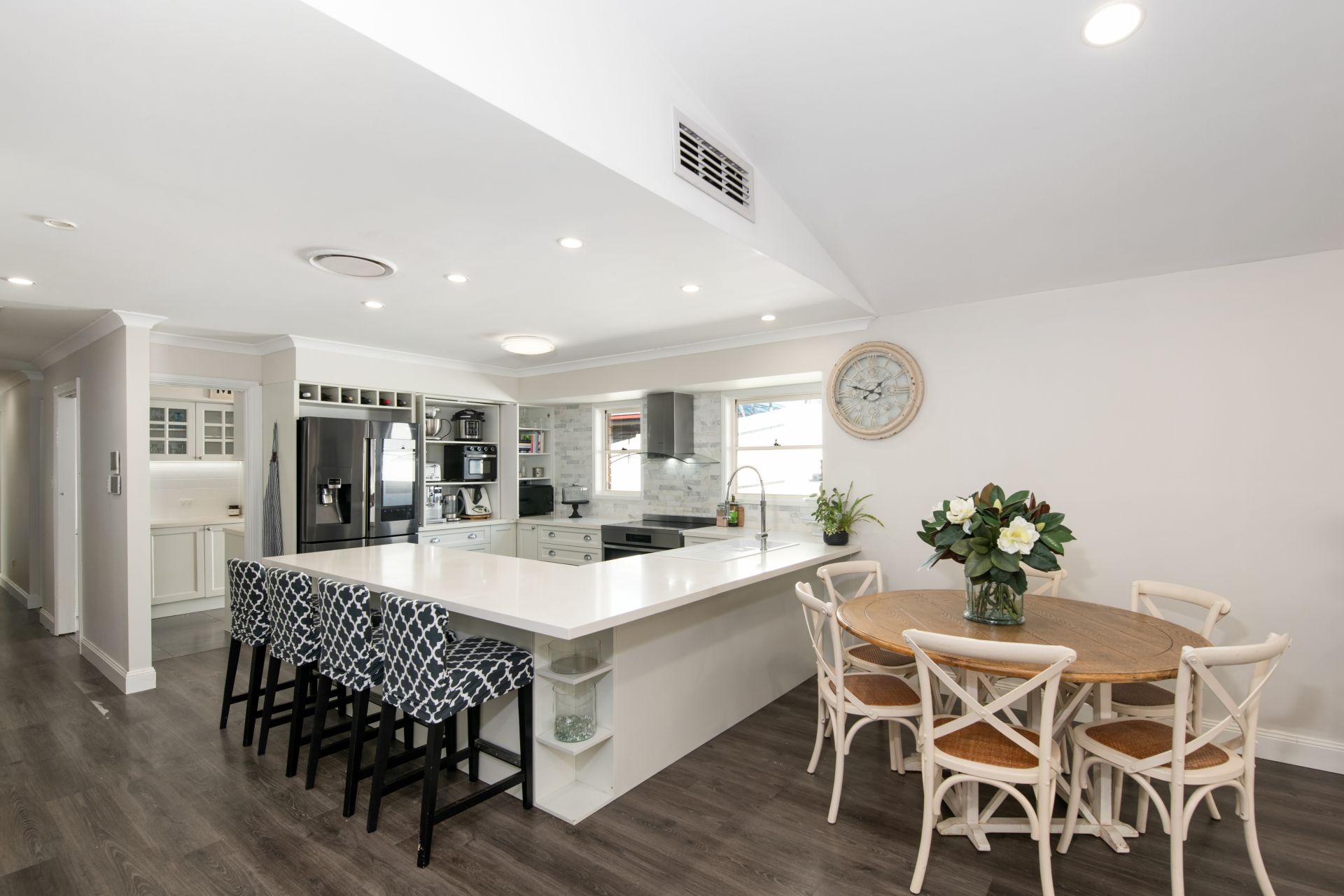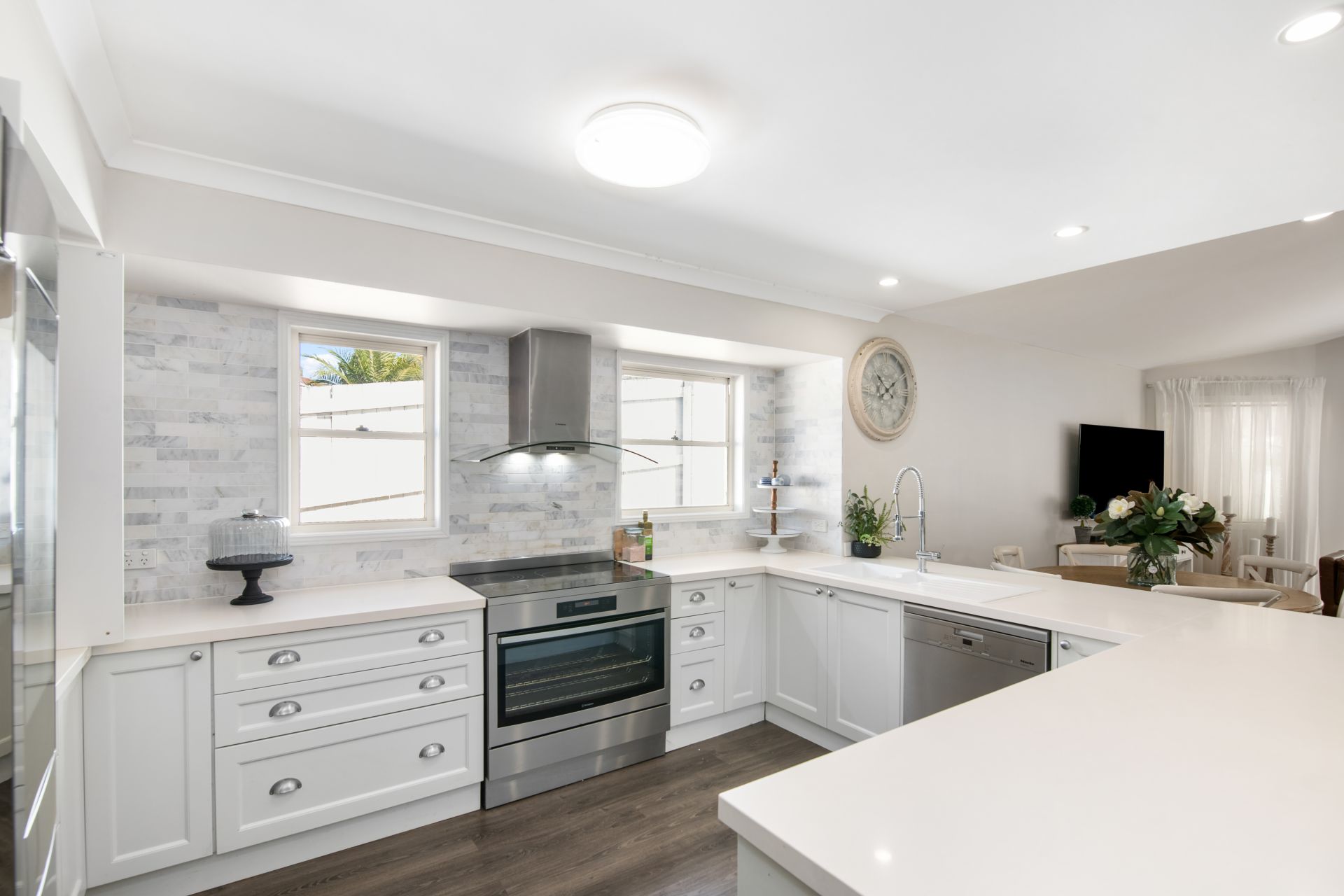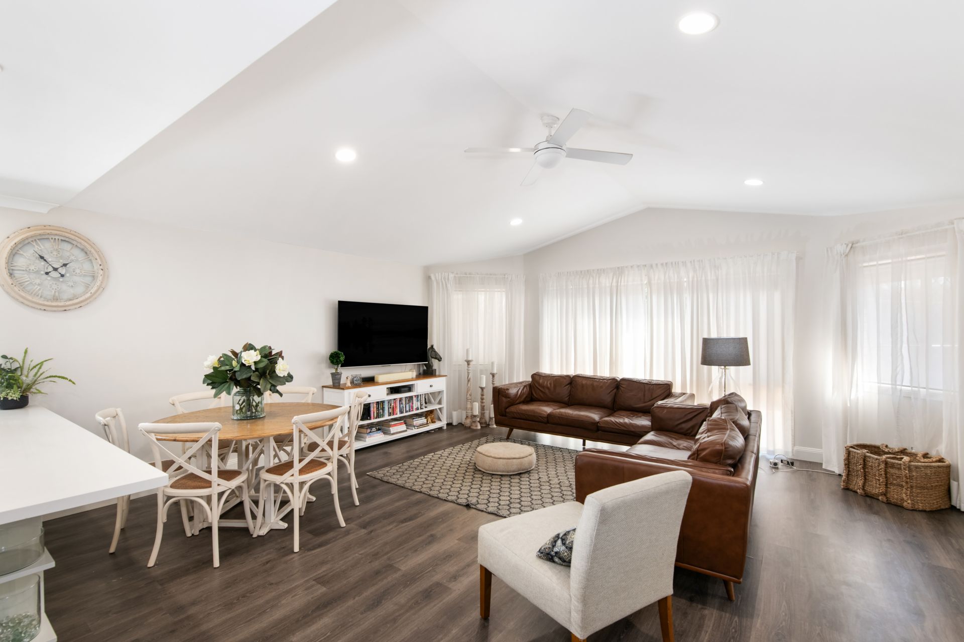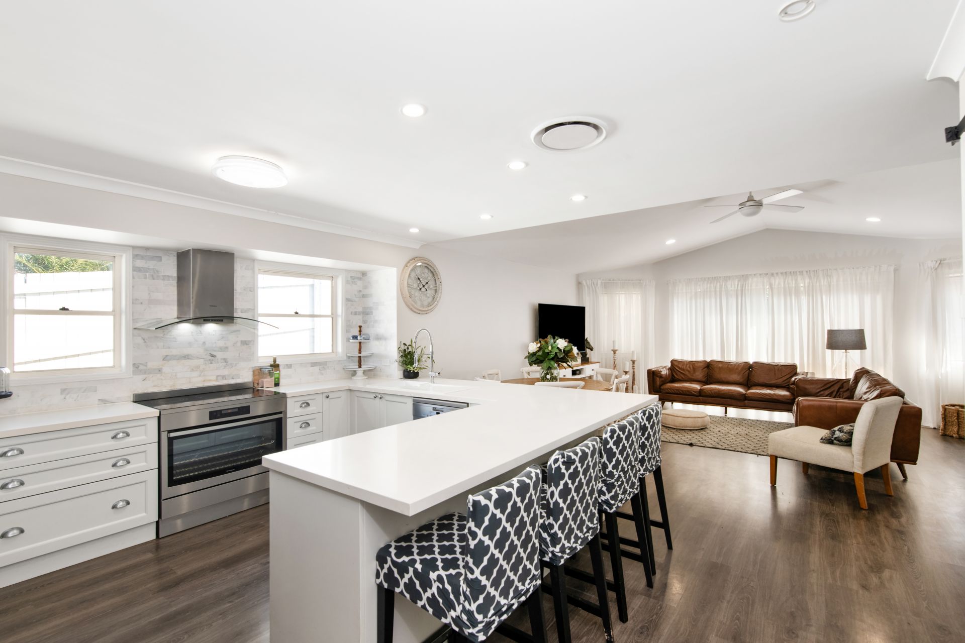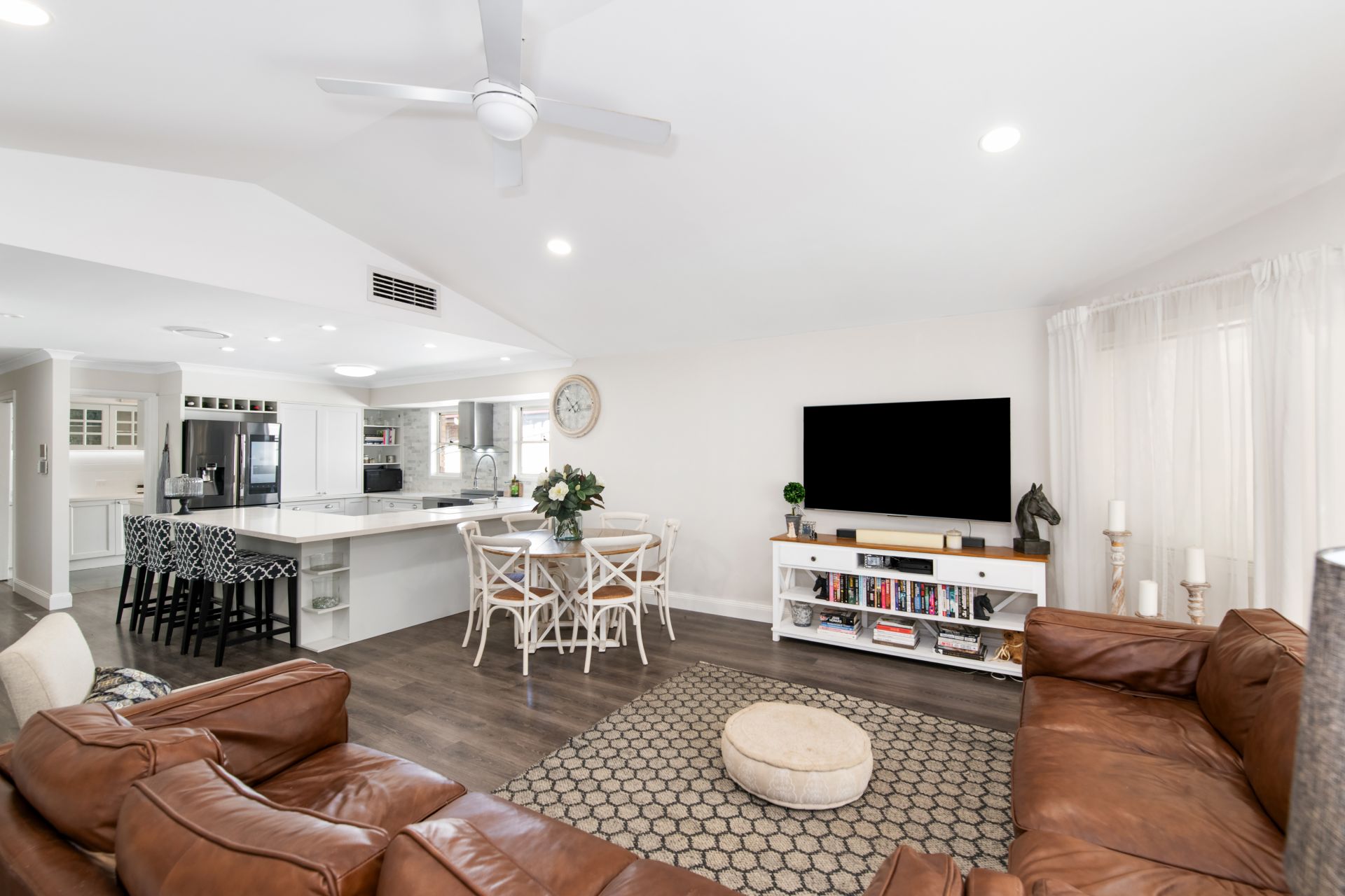 > Combined Living and Dining room share a large open space with the home's stunningly renovated kitchen and features timber flooring, 3m high cathedral ceiling, ducted air-conditioning, ceiling fan, dual roll-down blinds (sheer & blackout) security mesh screen door and access to the rear entertainer's deck.