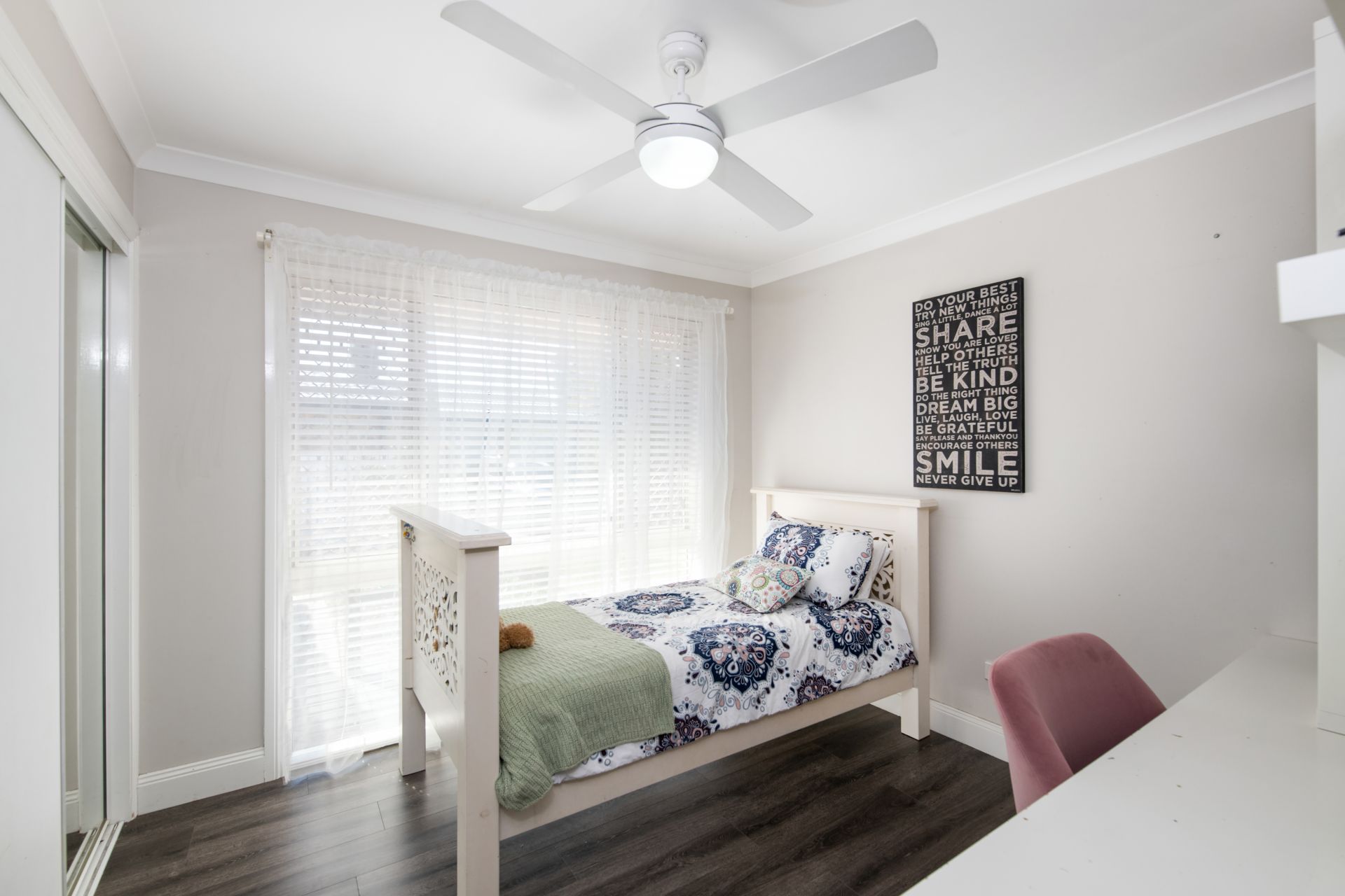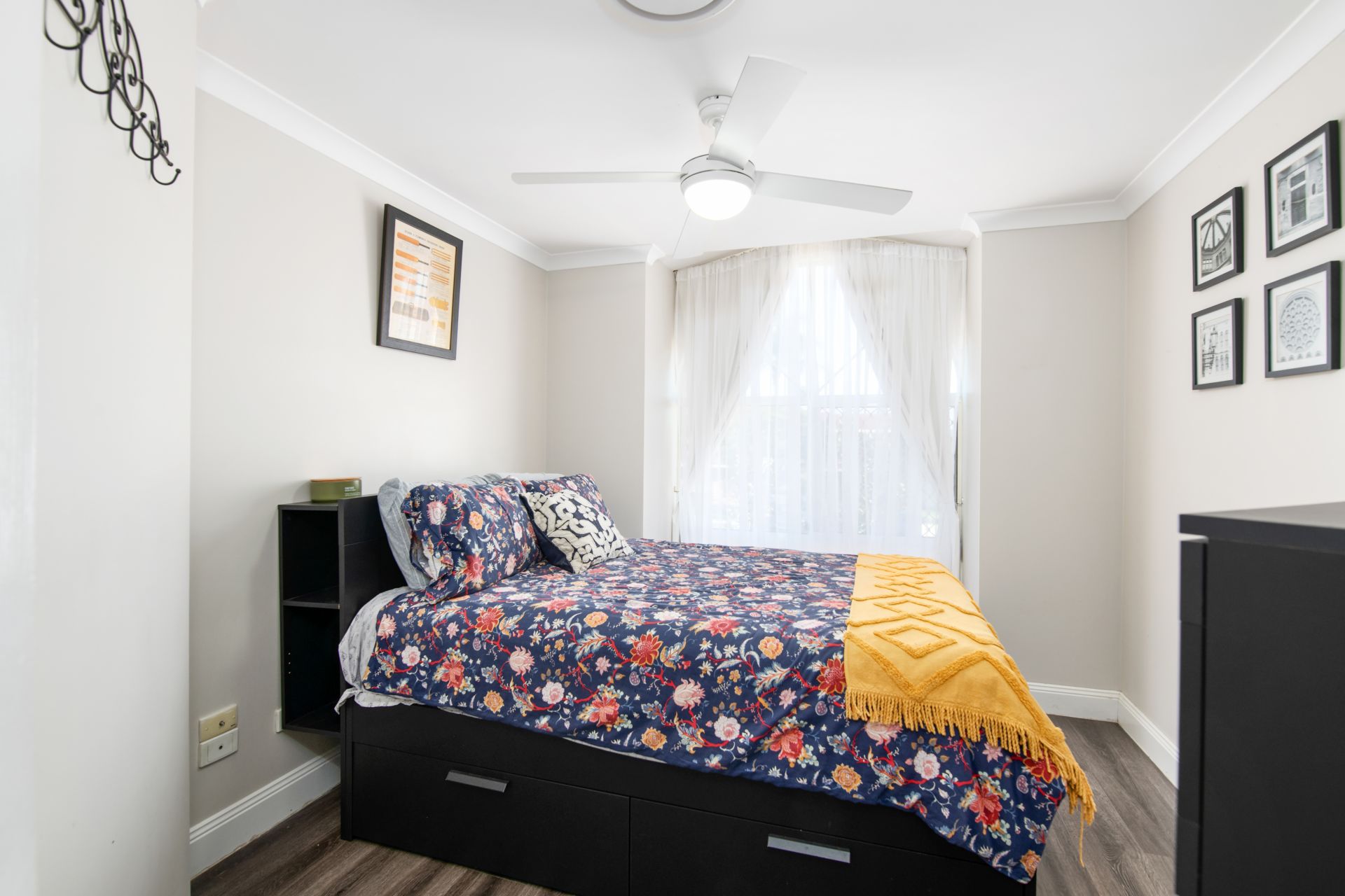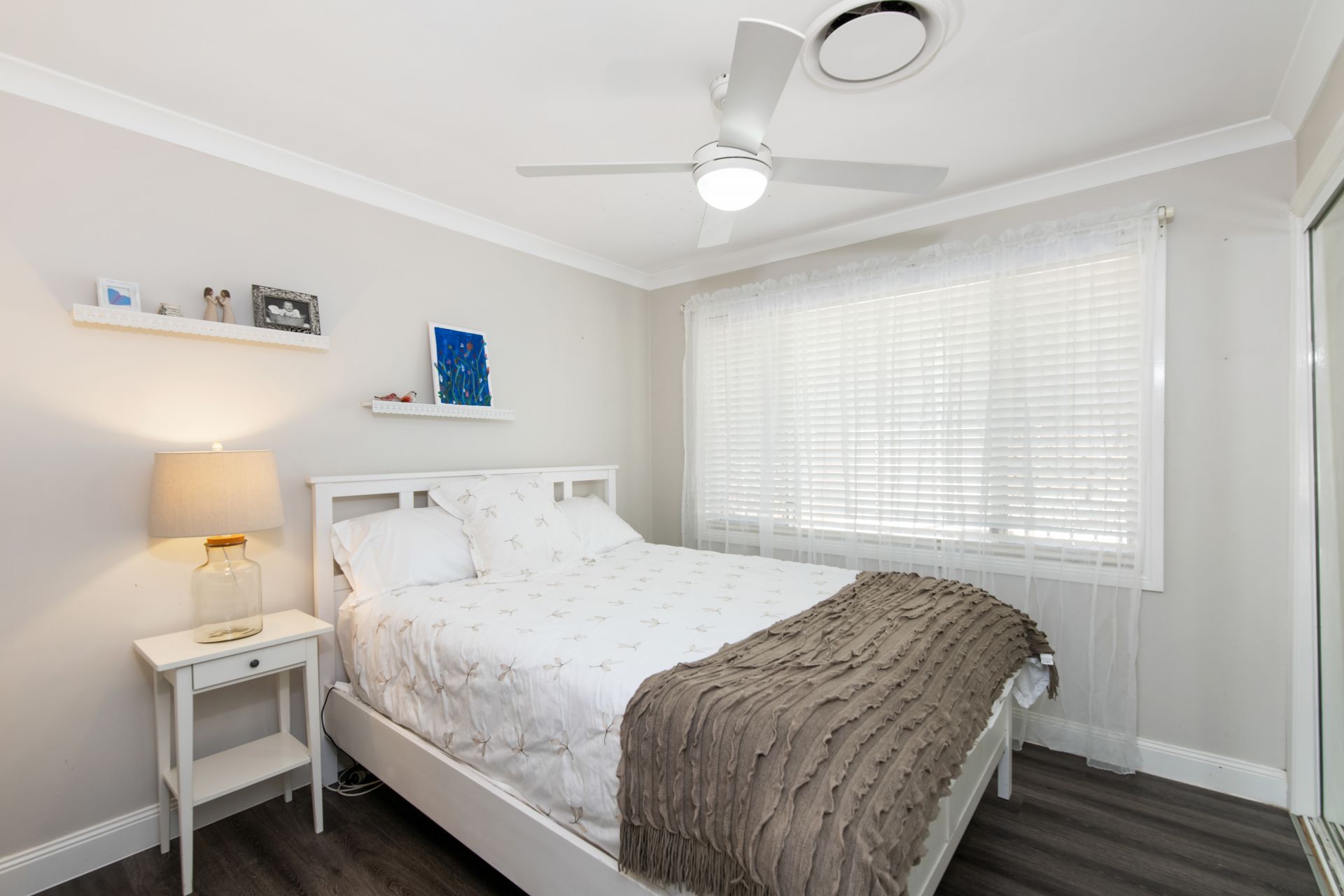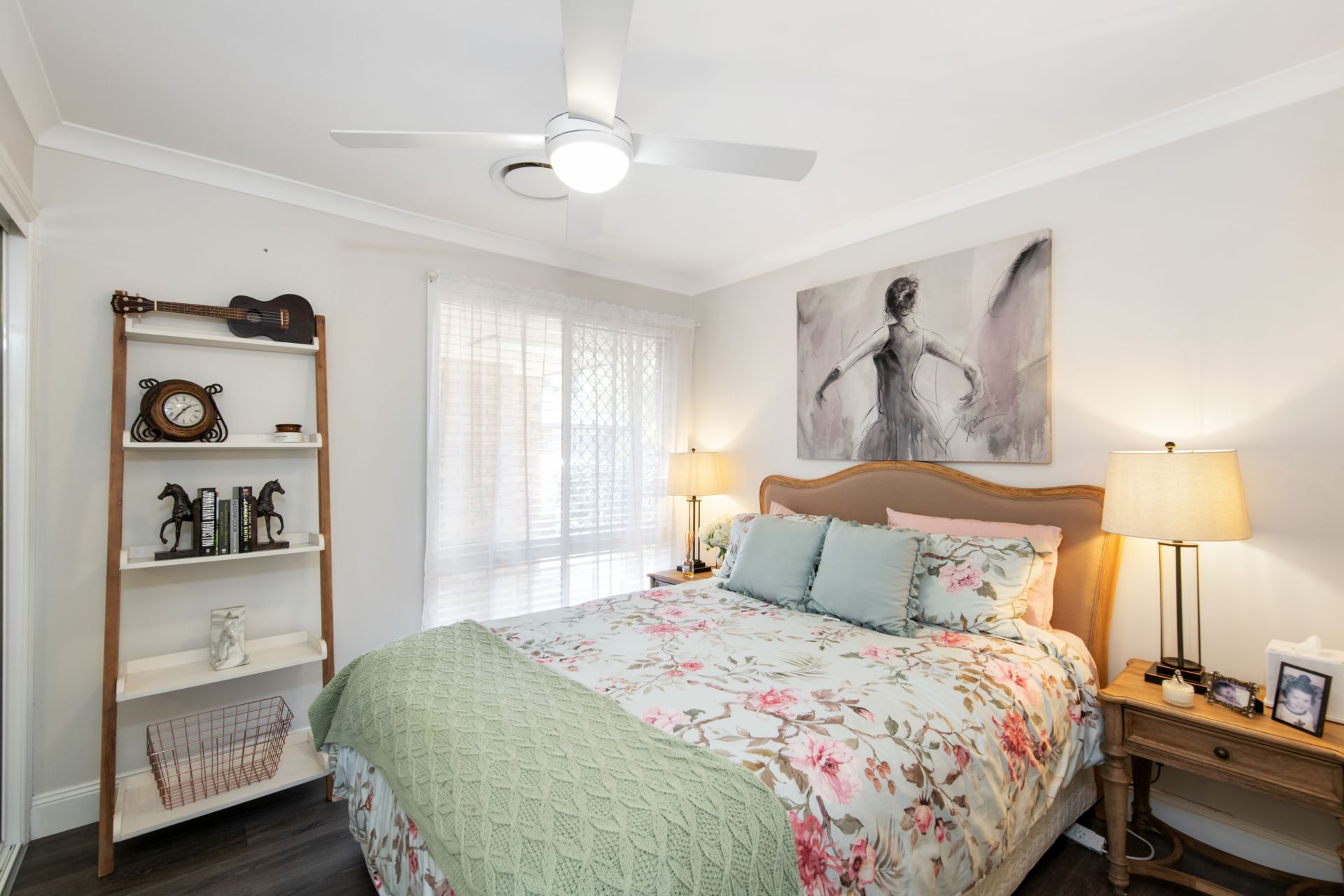 > Bedroom two features timber flooring, ducted air-conditioning, ceiling fan, large arched window, security screens and curtains.