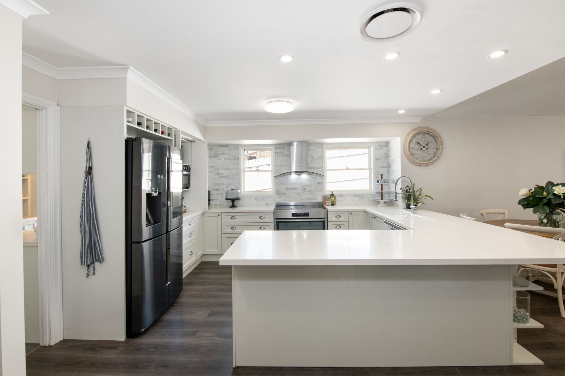 > Custom White double sink with insinkerator and extendable mixer tap