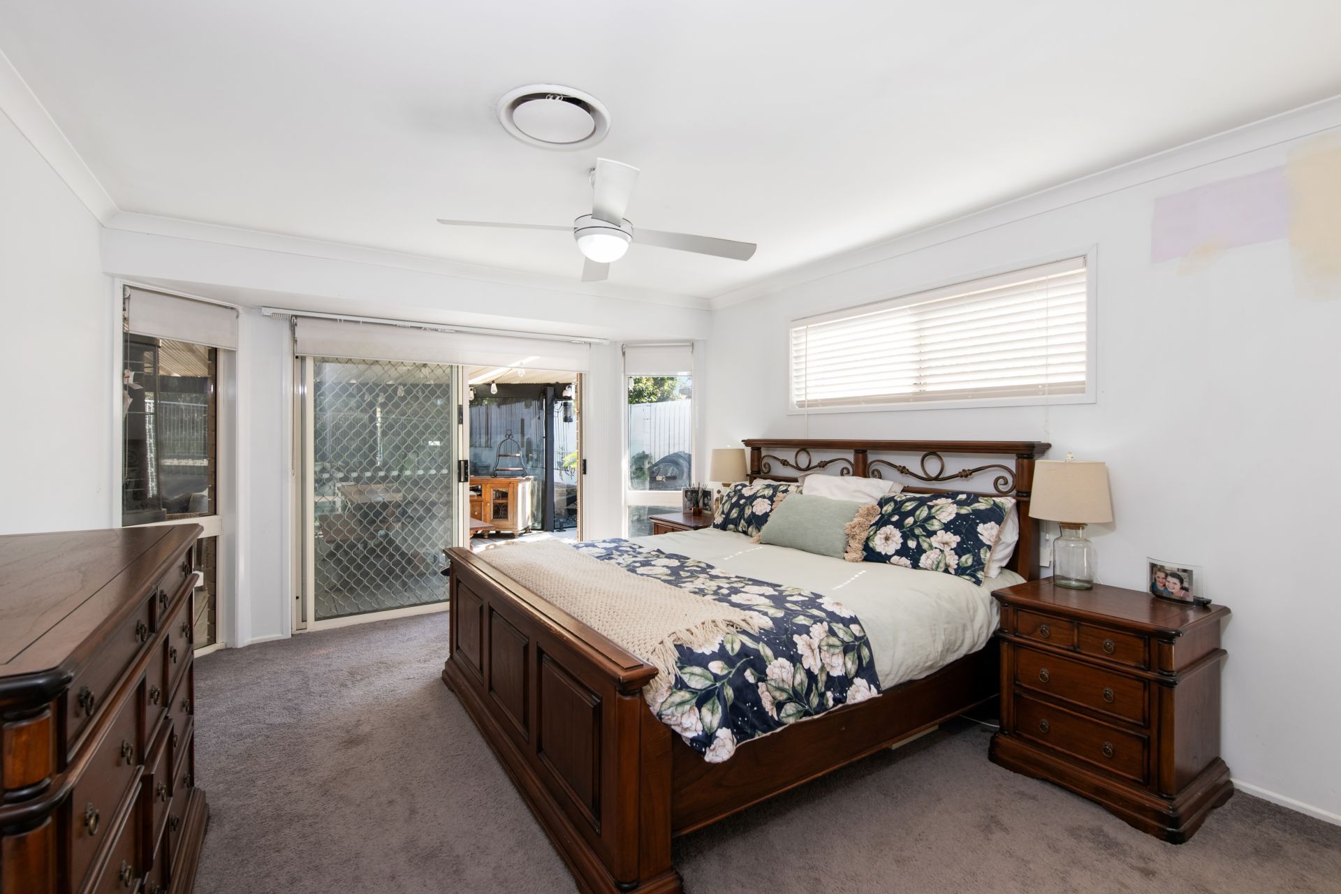 > Bedroom one is the home's large Master bedroom featuring carpeted flooring, walk-in-robe with built-in cabinetry, good size ensuite, ducted air-conditioning, ceiling fan, dual roll-down blinds (sheer & blackout), security screens and access to the covered outdoor entertaining deck.