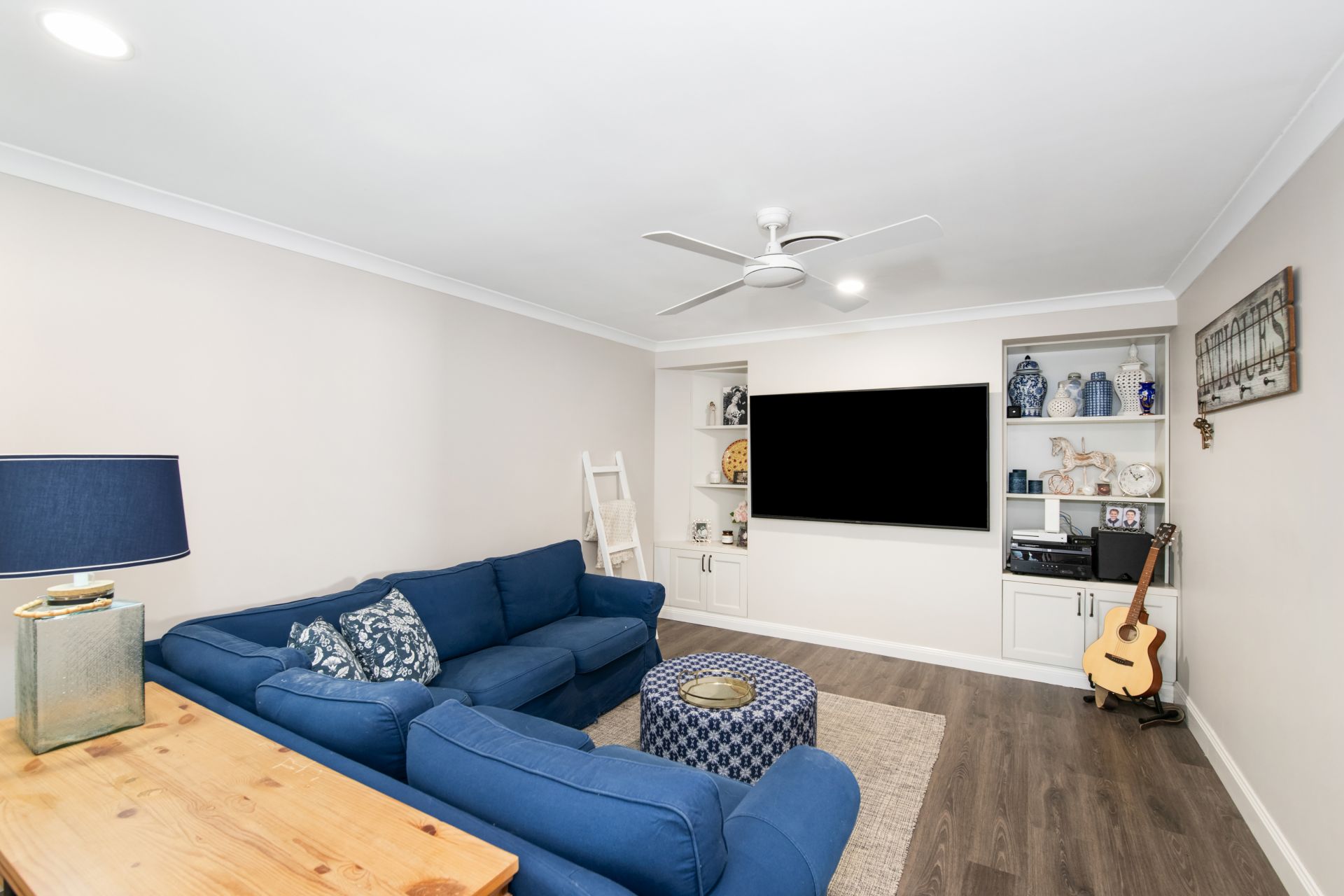 > The Lounge / Media room is the home's second living area and features timber flooring, ducted air-conditioning, ceiling fan, surround sound setup with speakers and amp, roll-down blinds, security screens and access to the rear entertainer's deck.